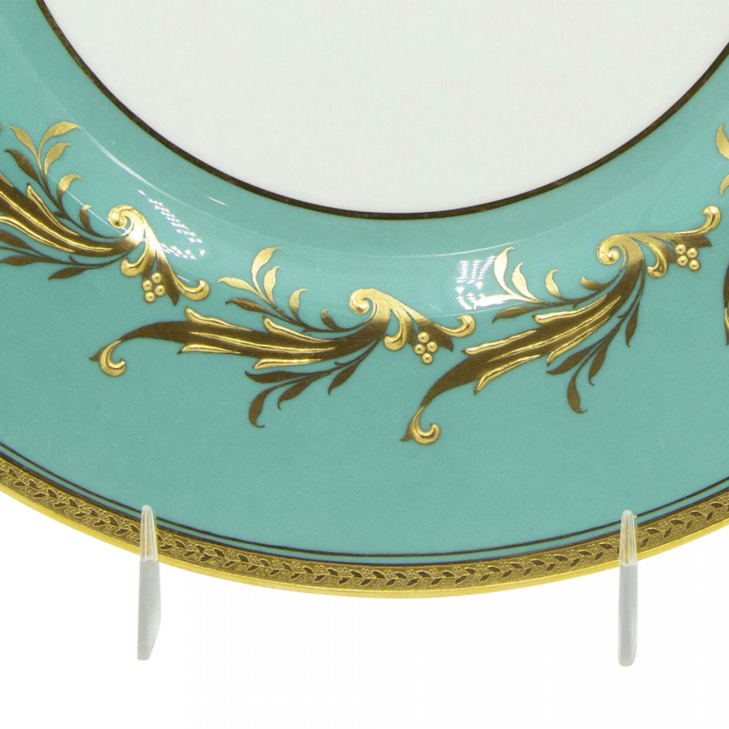 Set of 12 English Victorian turquoise and white Minton porcelain dinner plates with gold trim and floral center (PRICED AS SET)