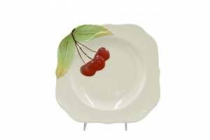 Set of 12 English Victorian white porcelain square shaped plates with fruit design (peaches, cherries, grapes) (PRICED AS SET)