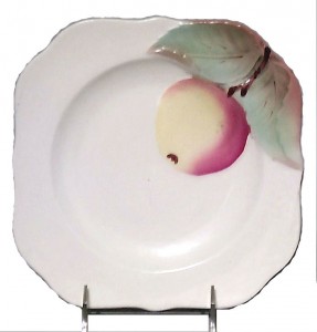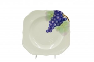 Set of 12 English Victorian white porcelain square shaped plates with fruit design (peaches, cherries, grapes) (PRICED AS SET).