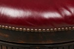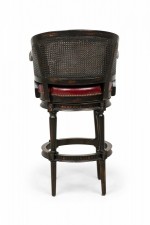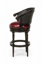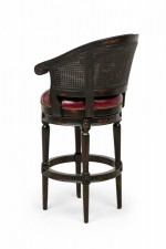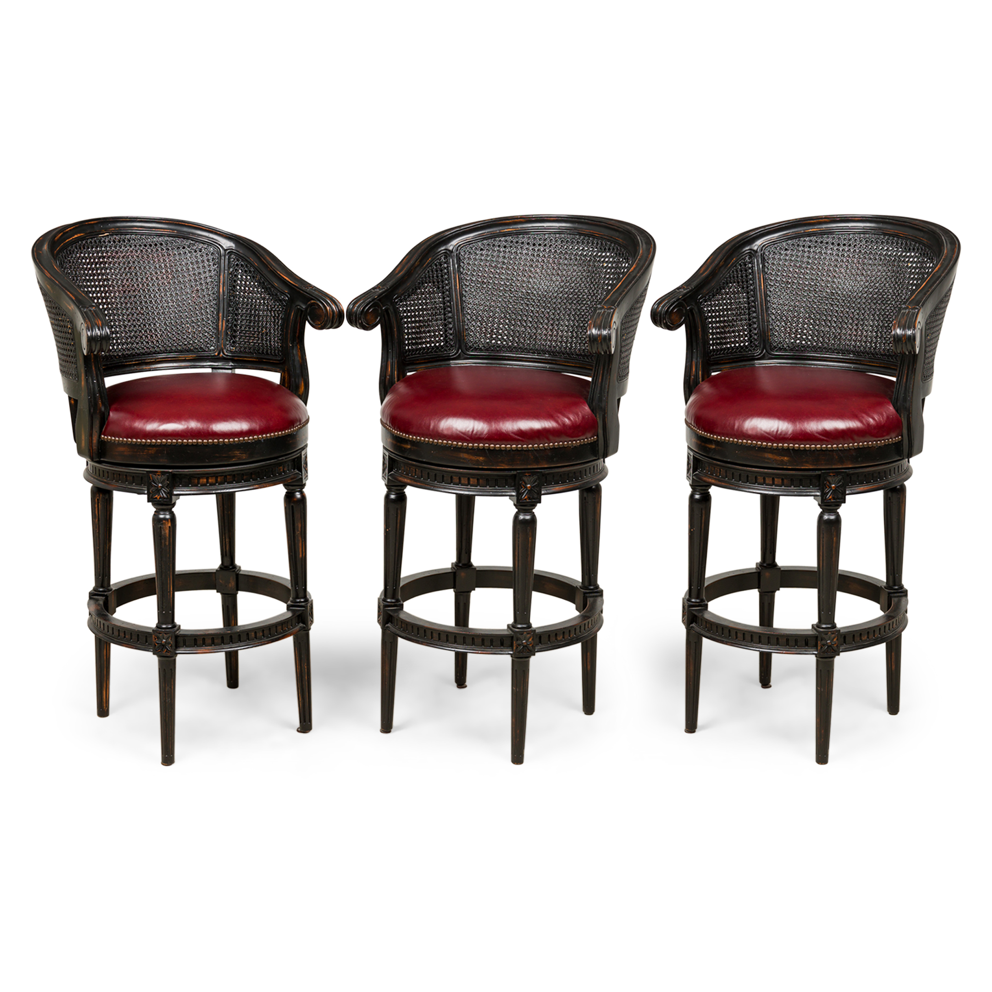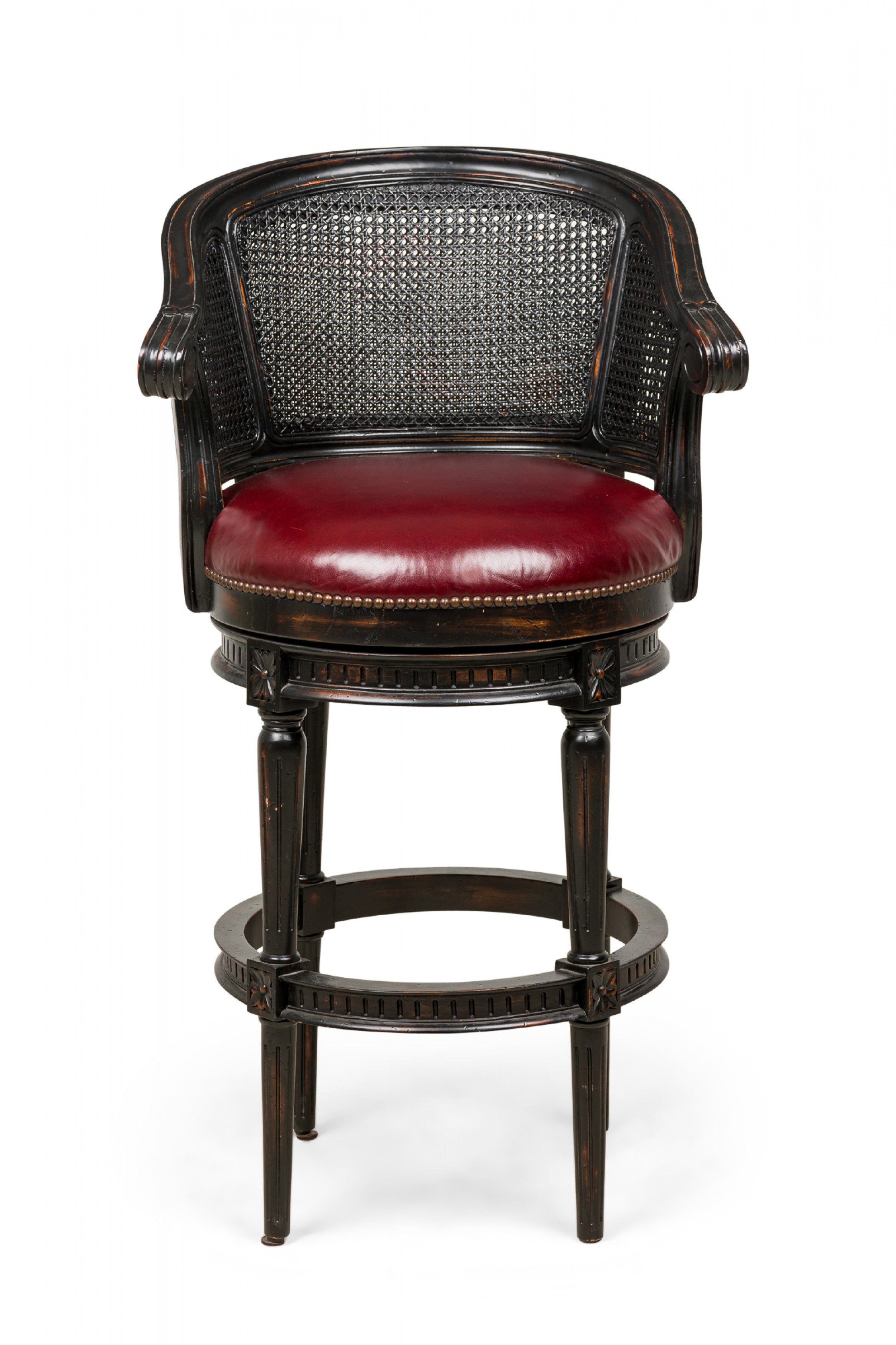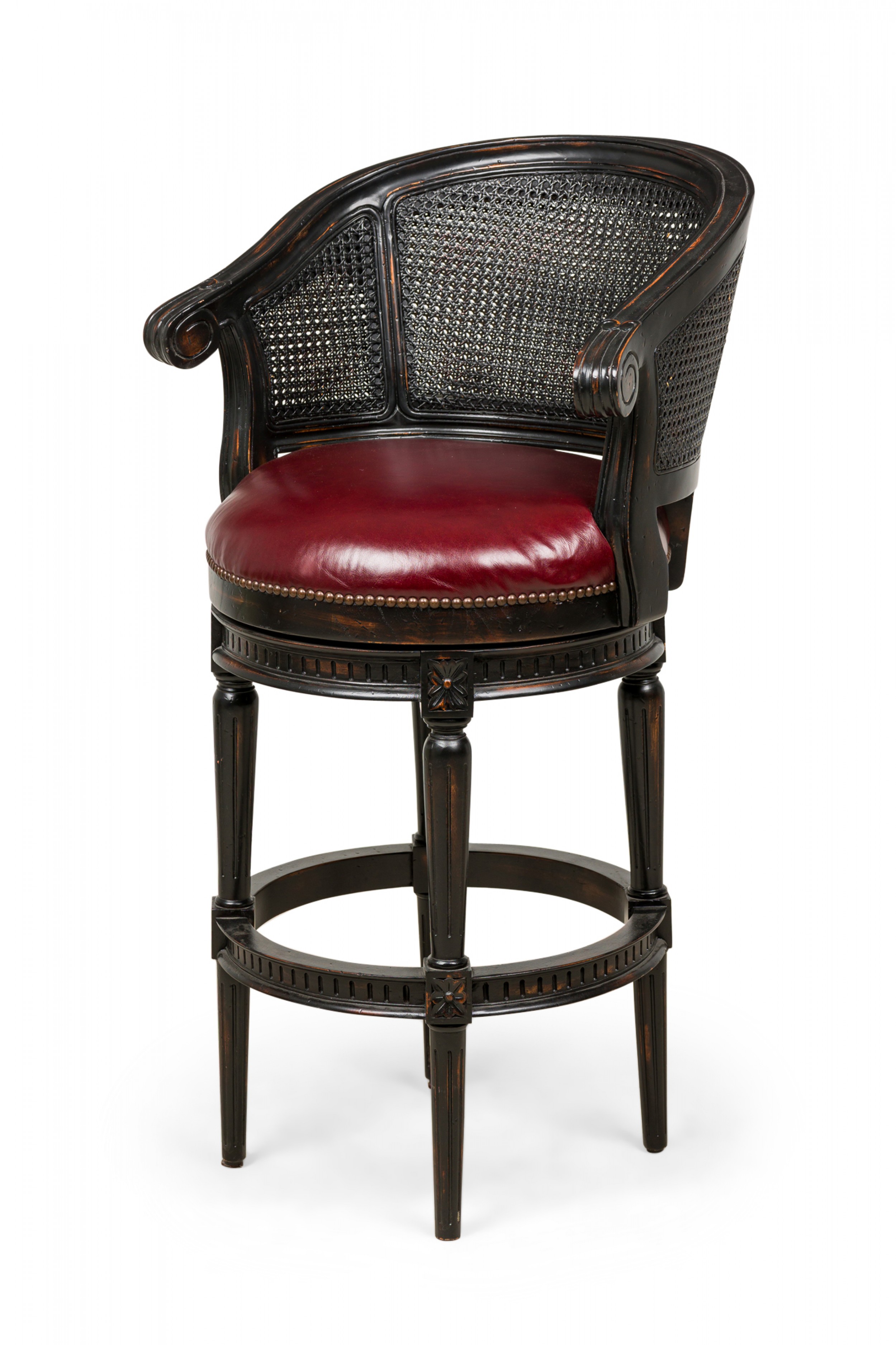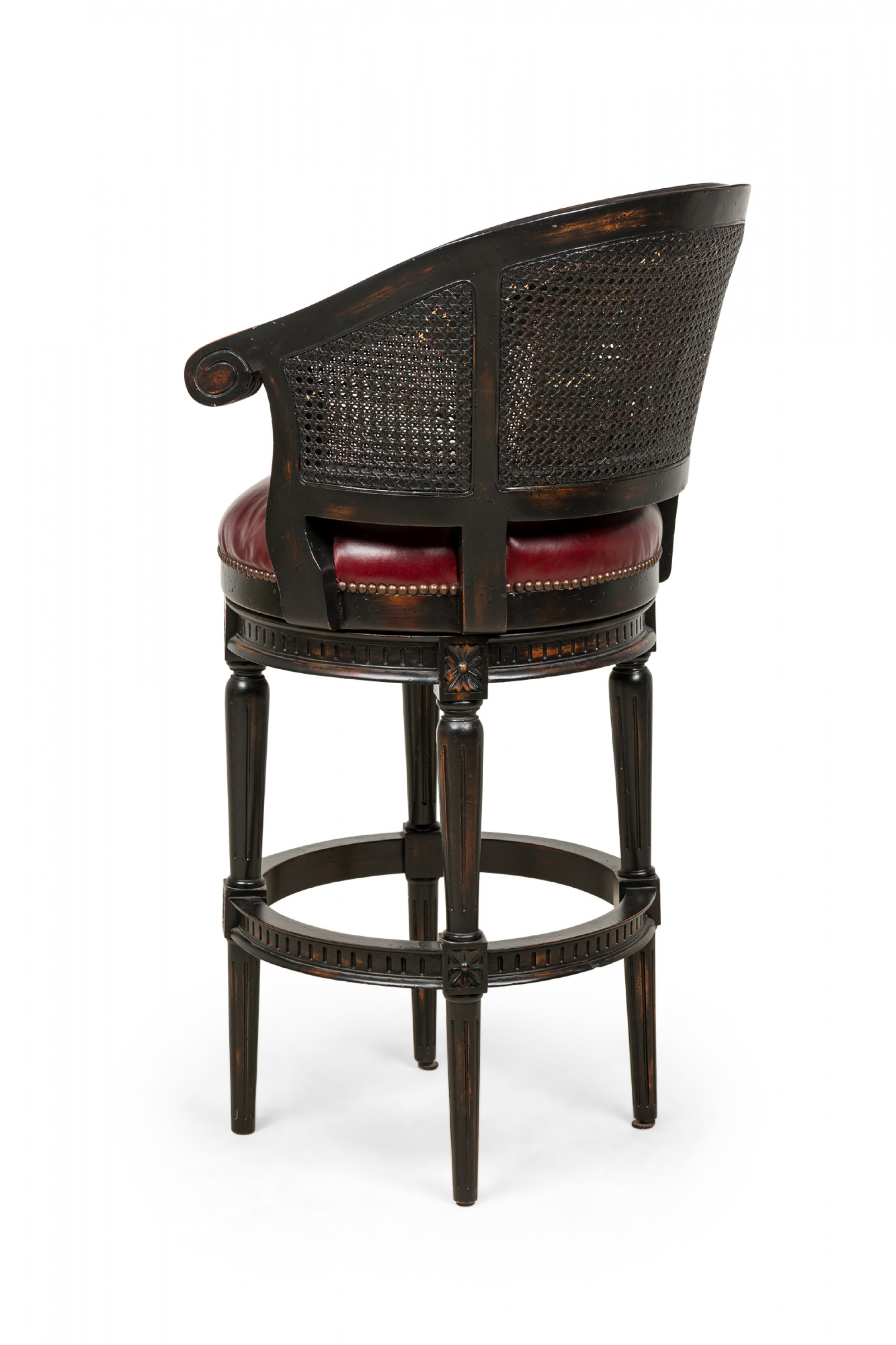 SET of 3 Mid-Century French style wooden swivel bar stools with curved arms, 3-section caned backs, circular seats upholstered in dark red leather bordered by brass nailhead trim, standing on circular frames with carved embellishments and four fluted legs. (PRICED AS SET)