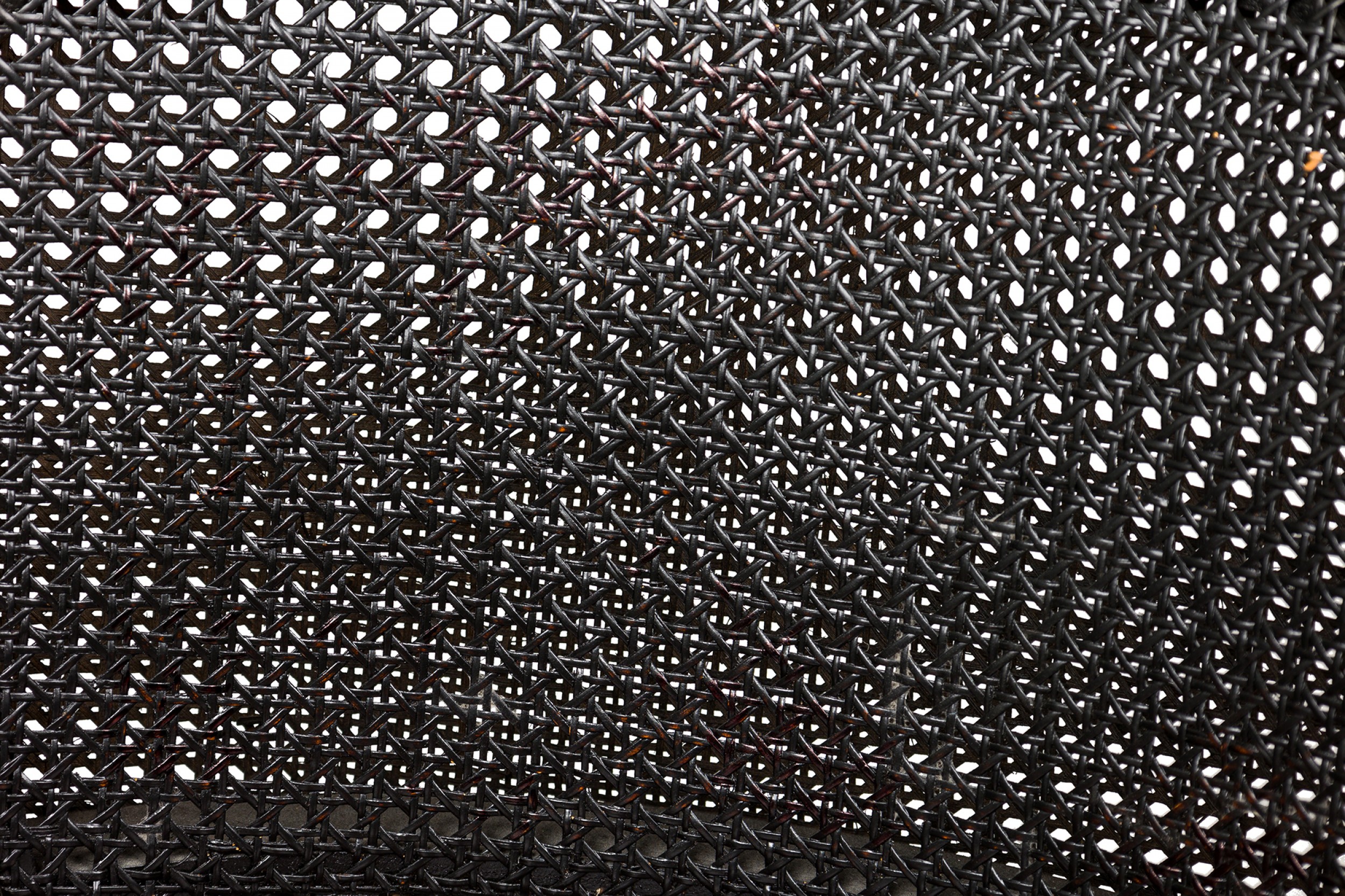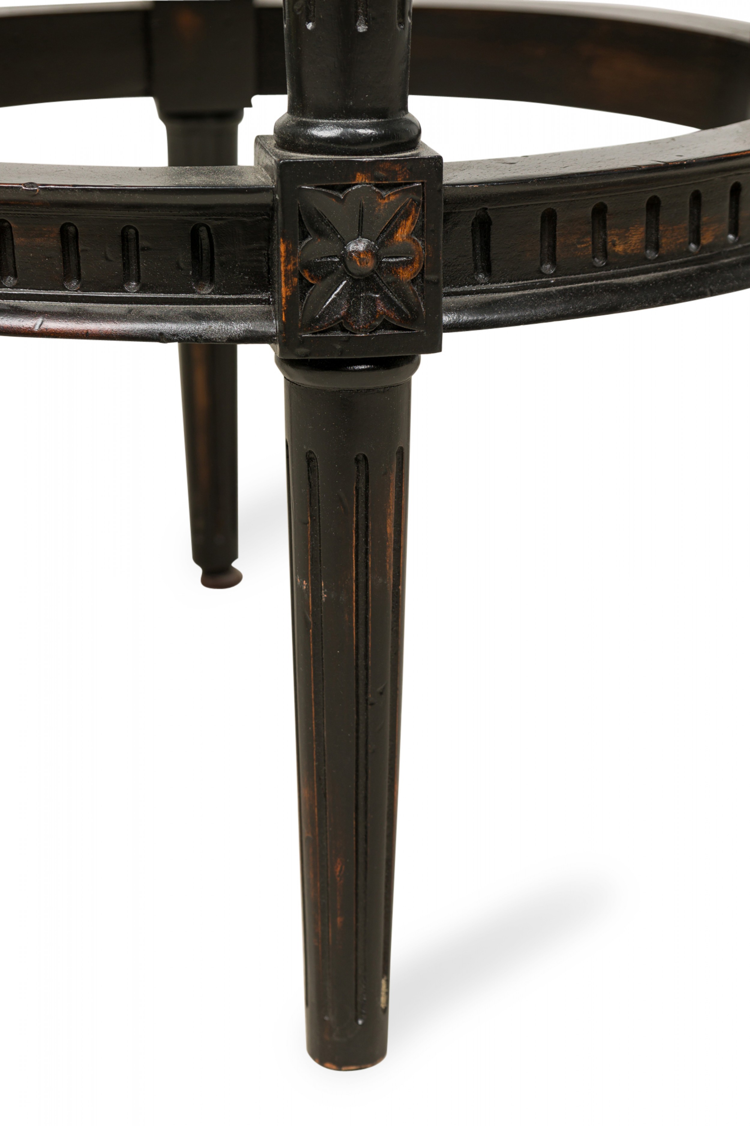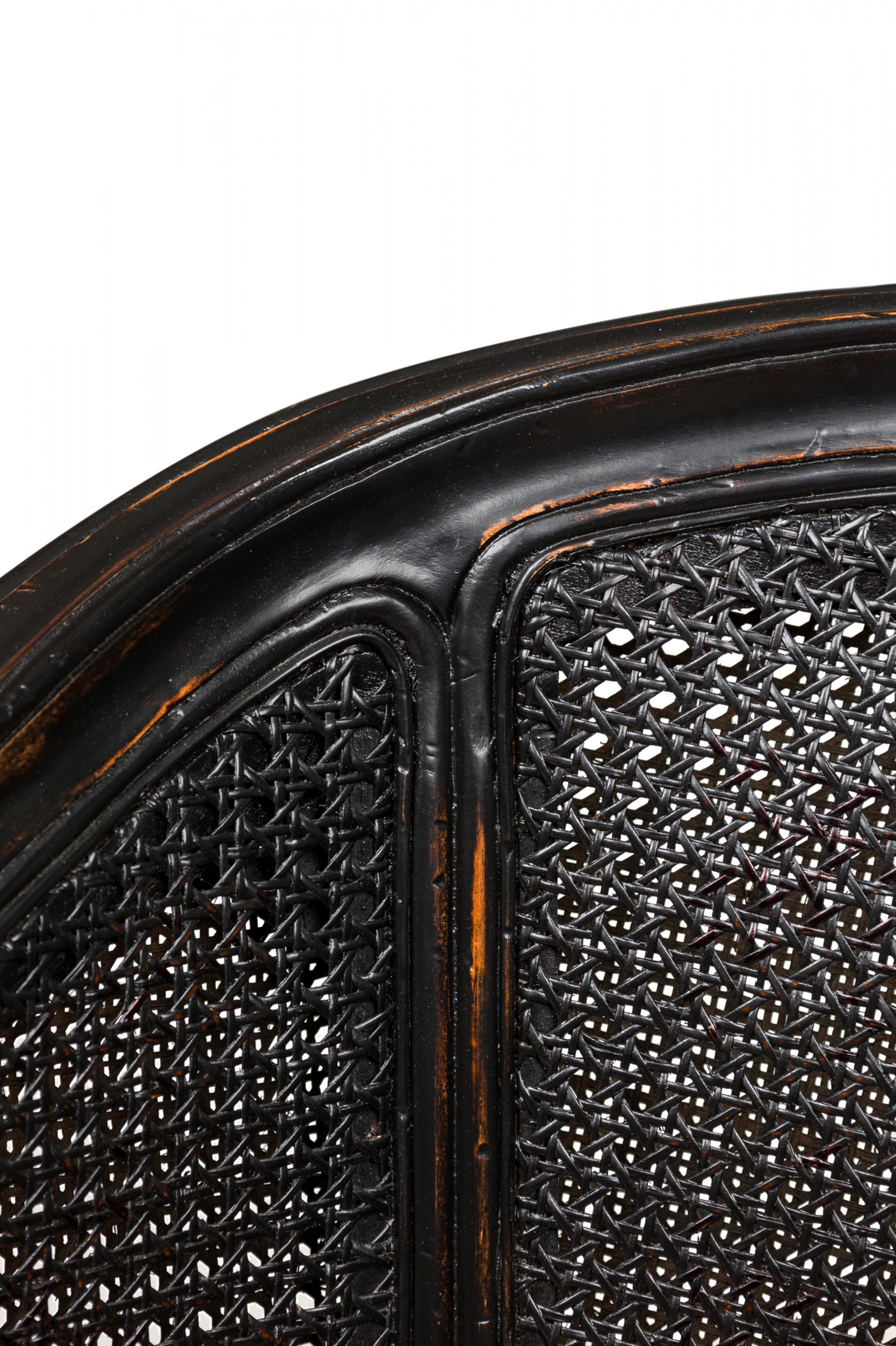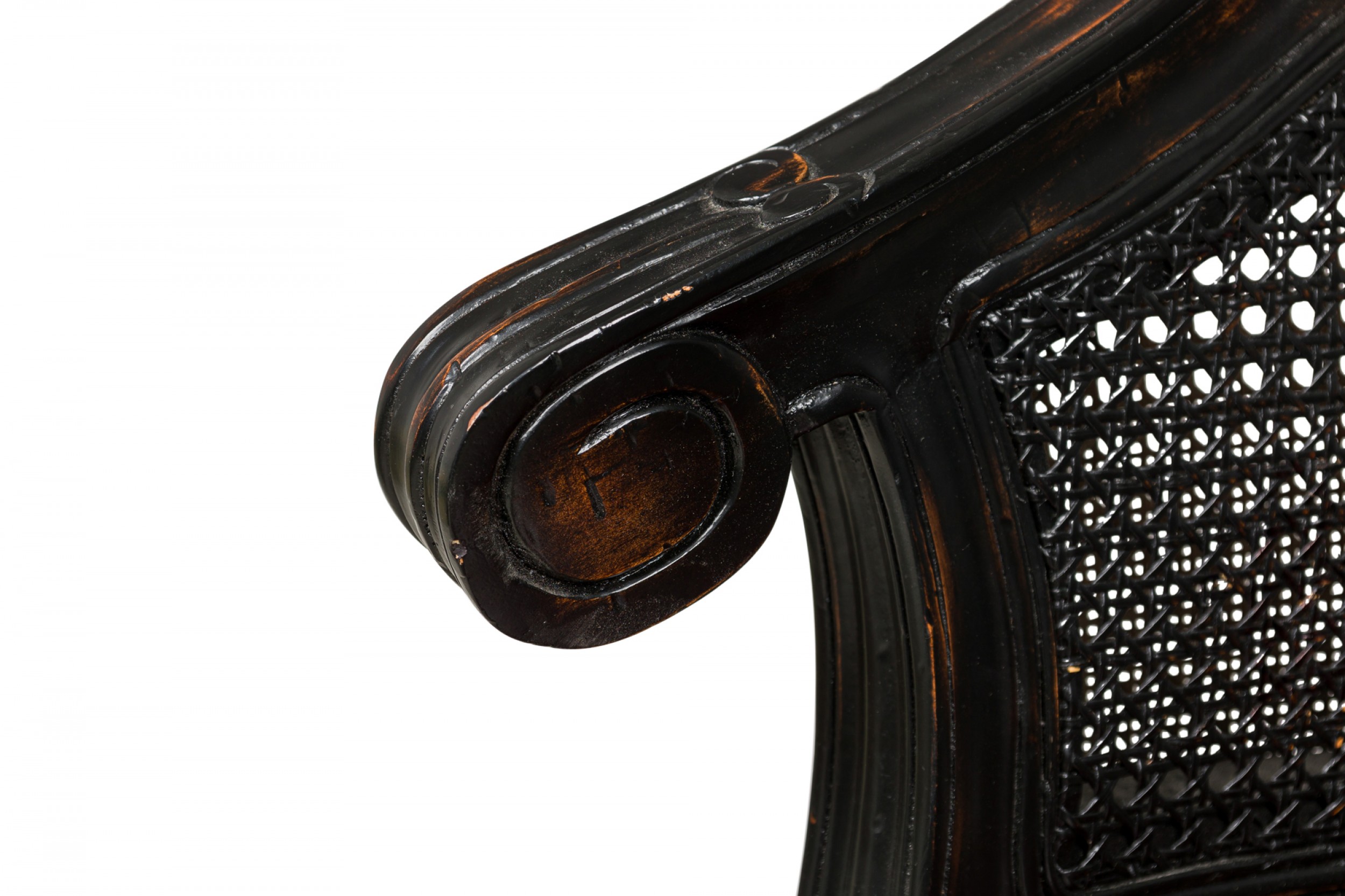 Set of 3 Mid-Century French Black Wood and Cane Horseshoe Back Swivel Stools with Red Leather Seats