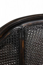 SET of 3 Mid-Century French style wooden swivel bar stools with curved arms, 3-section caned backs, circular seats upholstered in dark red leather bordered by brass nailhead trim, standing on circular frames with carved embellishments and four fluted legs. (PRICED AS SET).