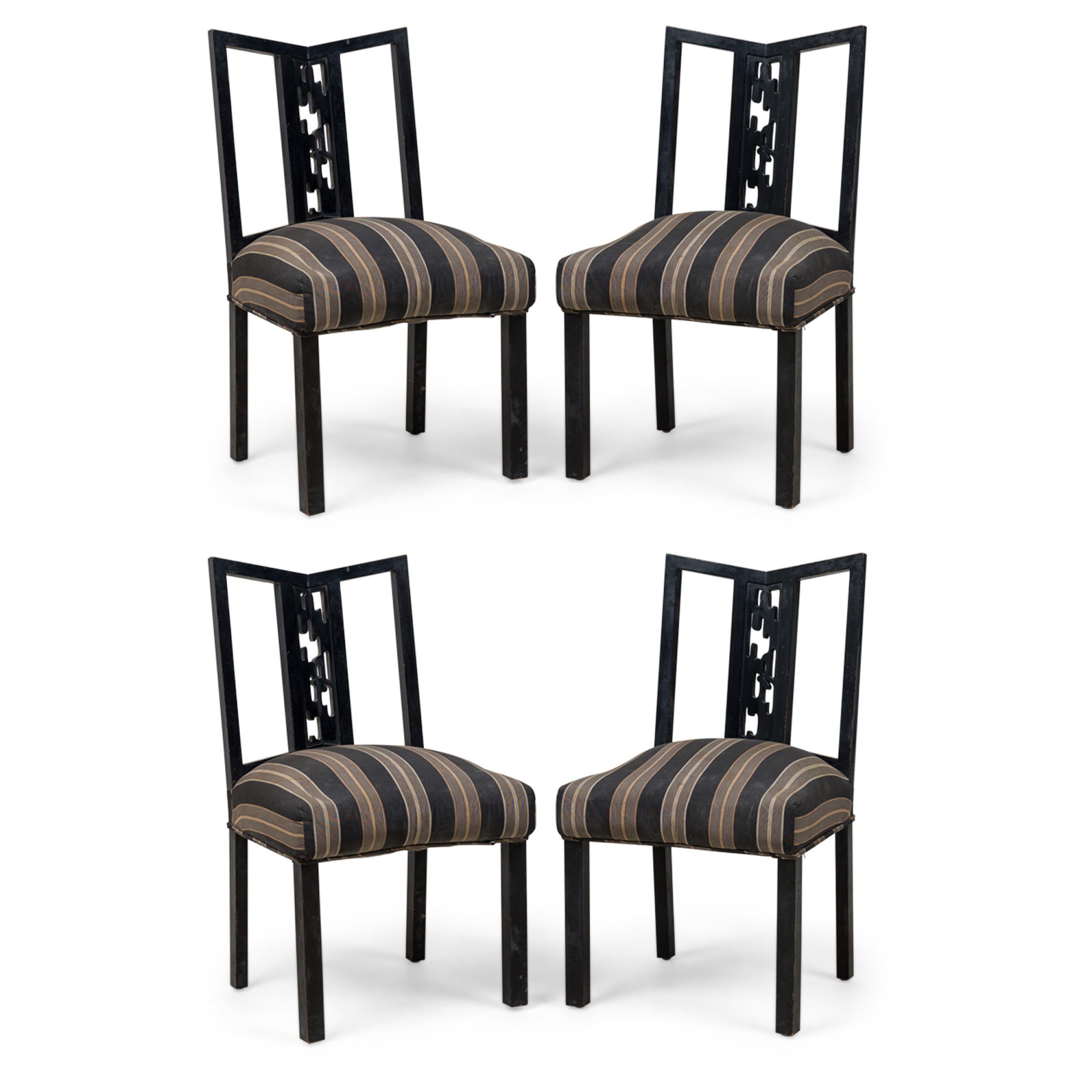 SET of 4 Mid-Century American dining / side chairs with a black lacquered wooden frames featuring geometric openwork backs and central splats carved as an organic shaped cut out, and padded seats upholstered in a beige and black stripe patterned fabric, standing on 4 square legs. (JAMES MONT) (PRICED AS SET).