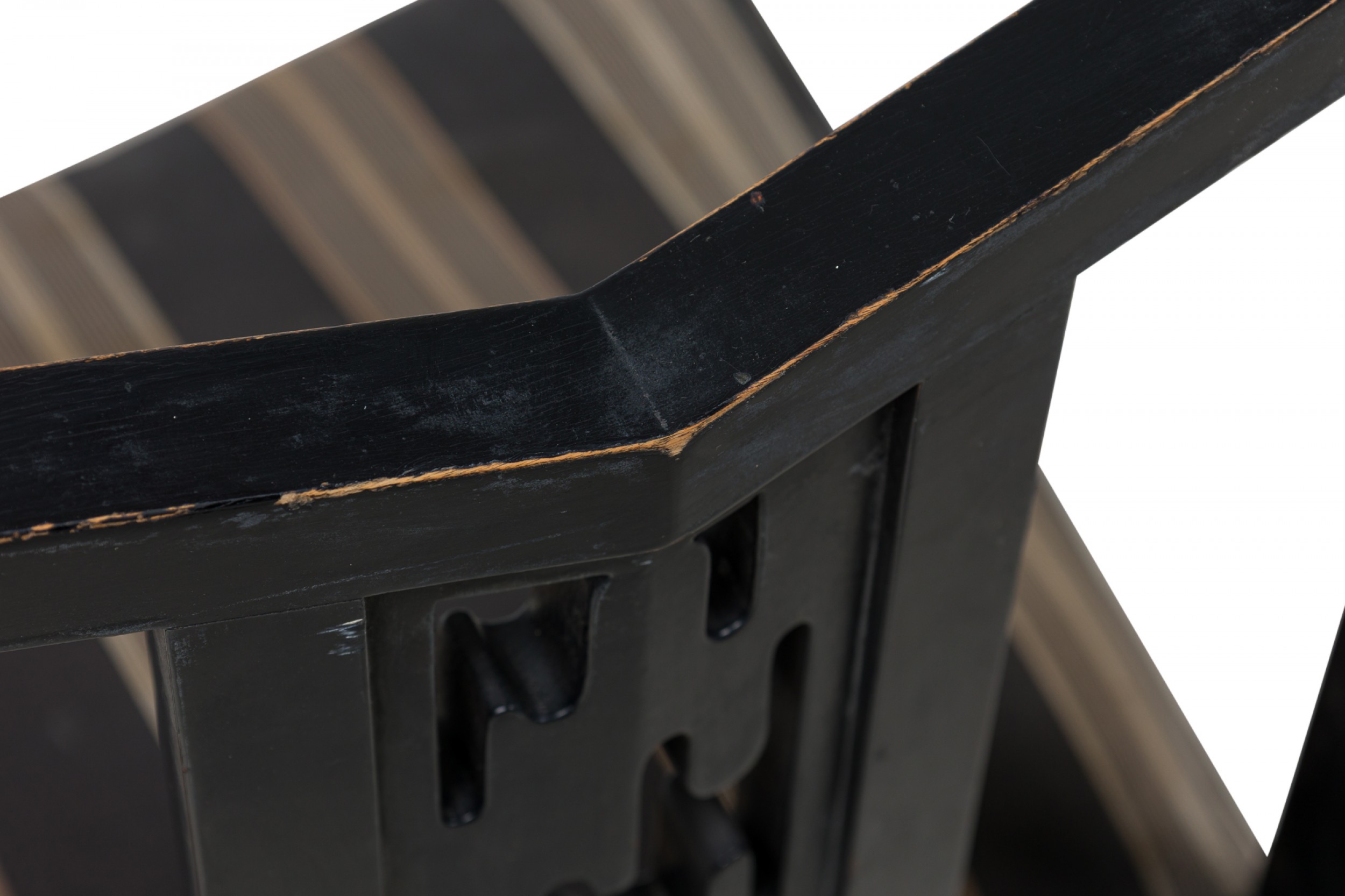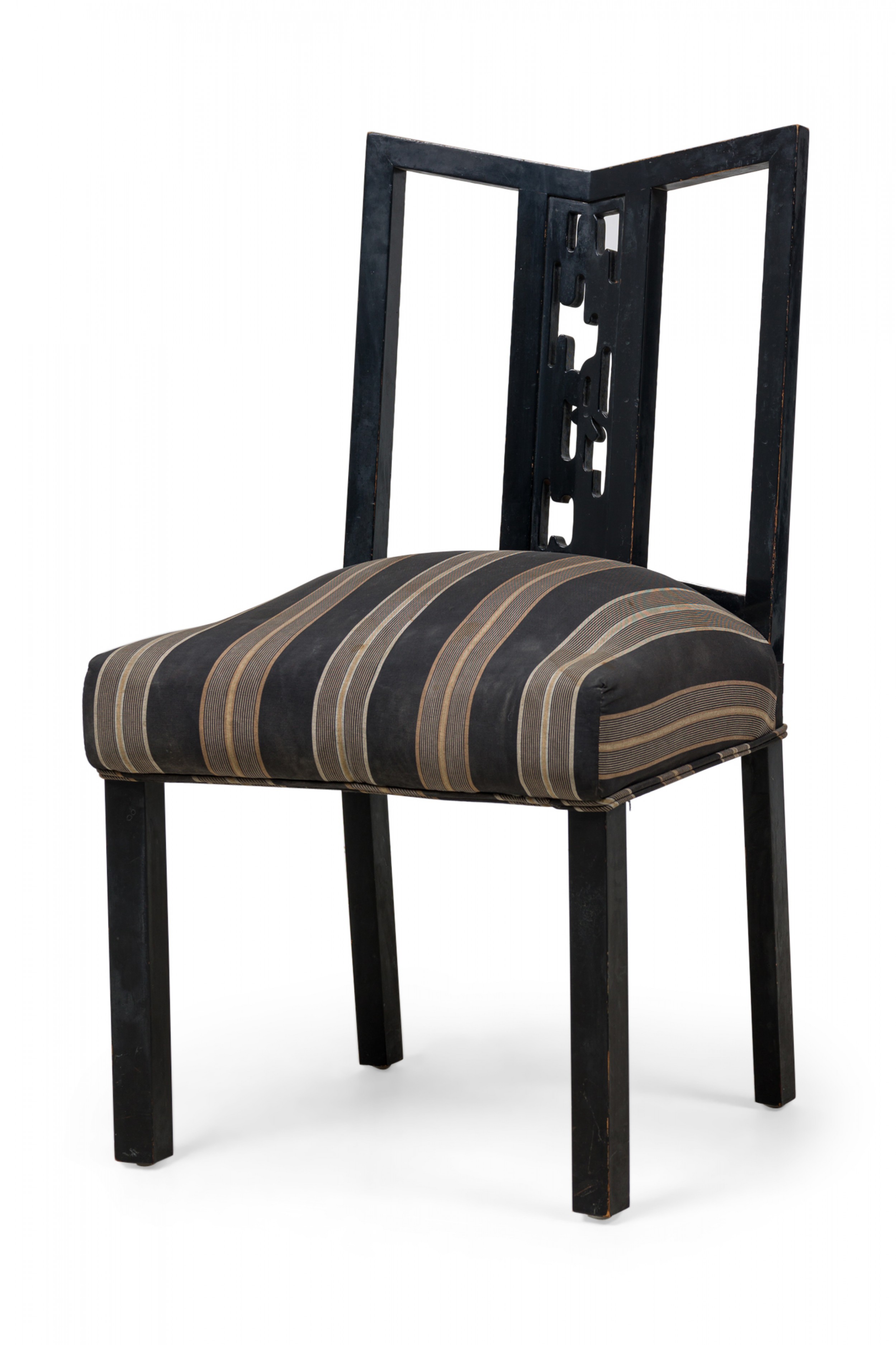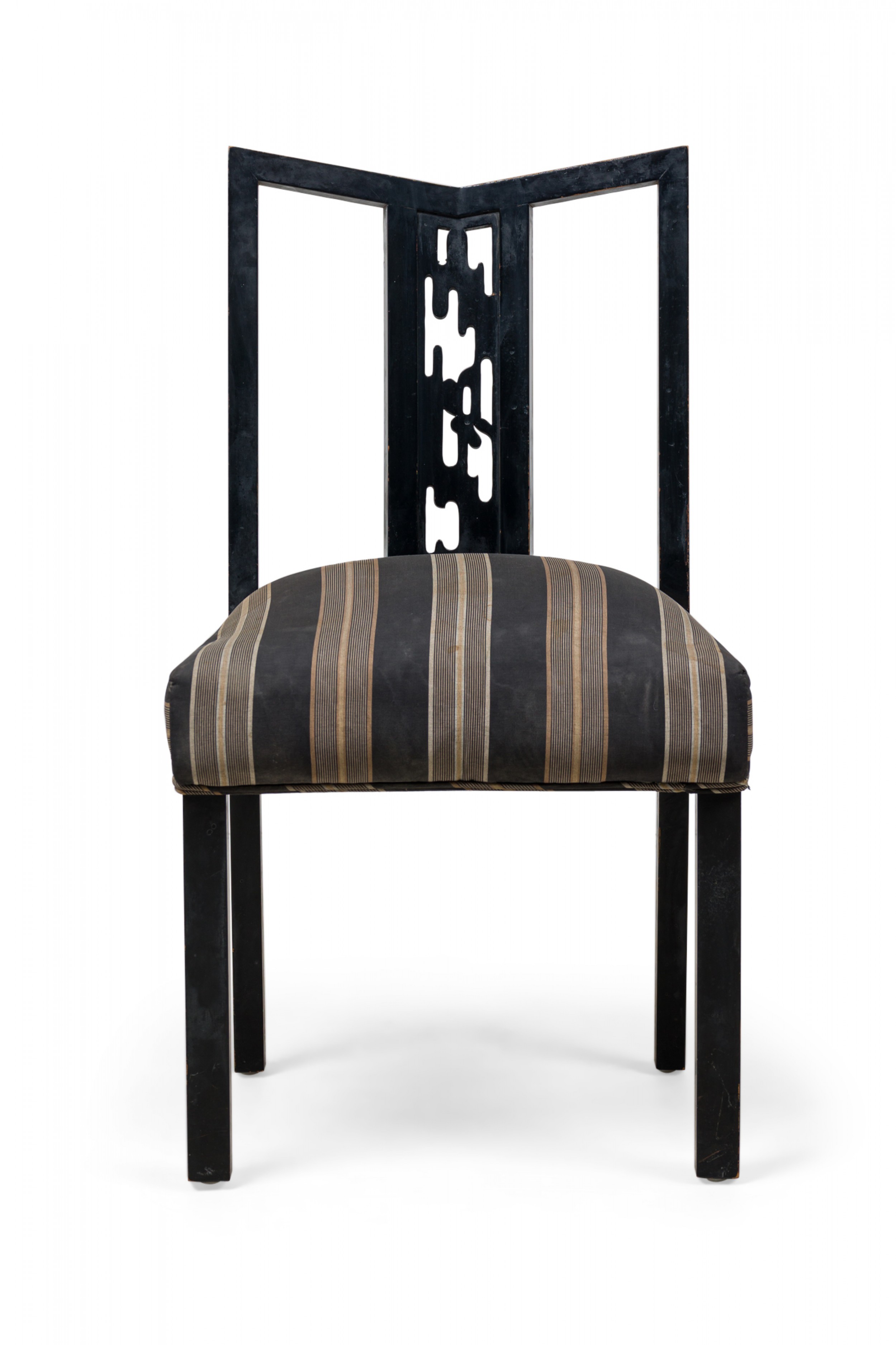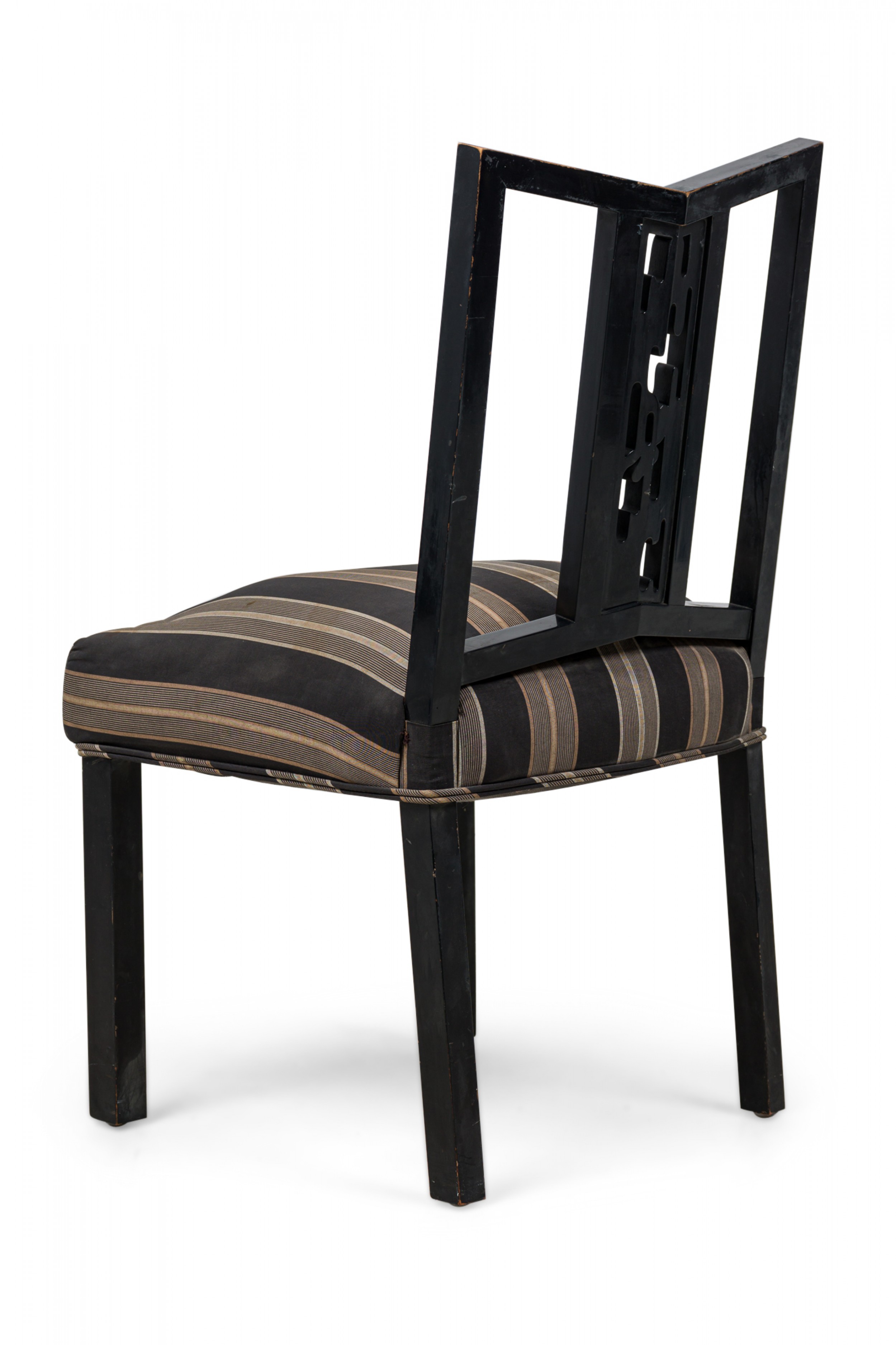 SET of 4 Mid-Century American dining / side chairs with a black lacquered wooden frames featuring geometric openwork backs and central splats carved as an organic shaped cut out, and padded seats upholstered in a beige and black stripe patterned fabric, standing on 4 square legs. (JAMES MONT) (PRICED AS SET)
