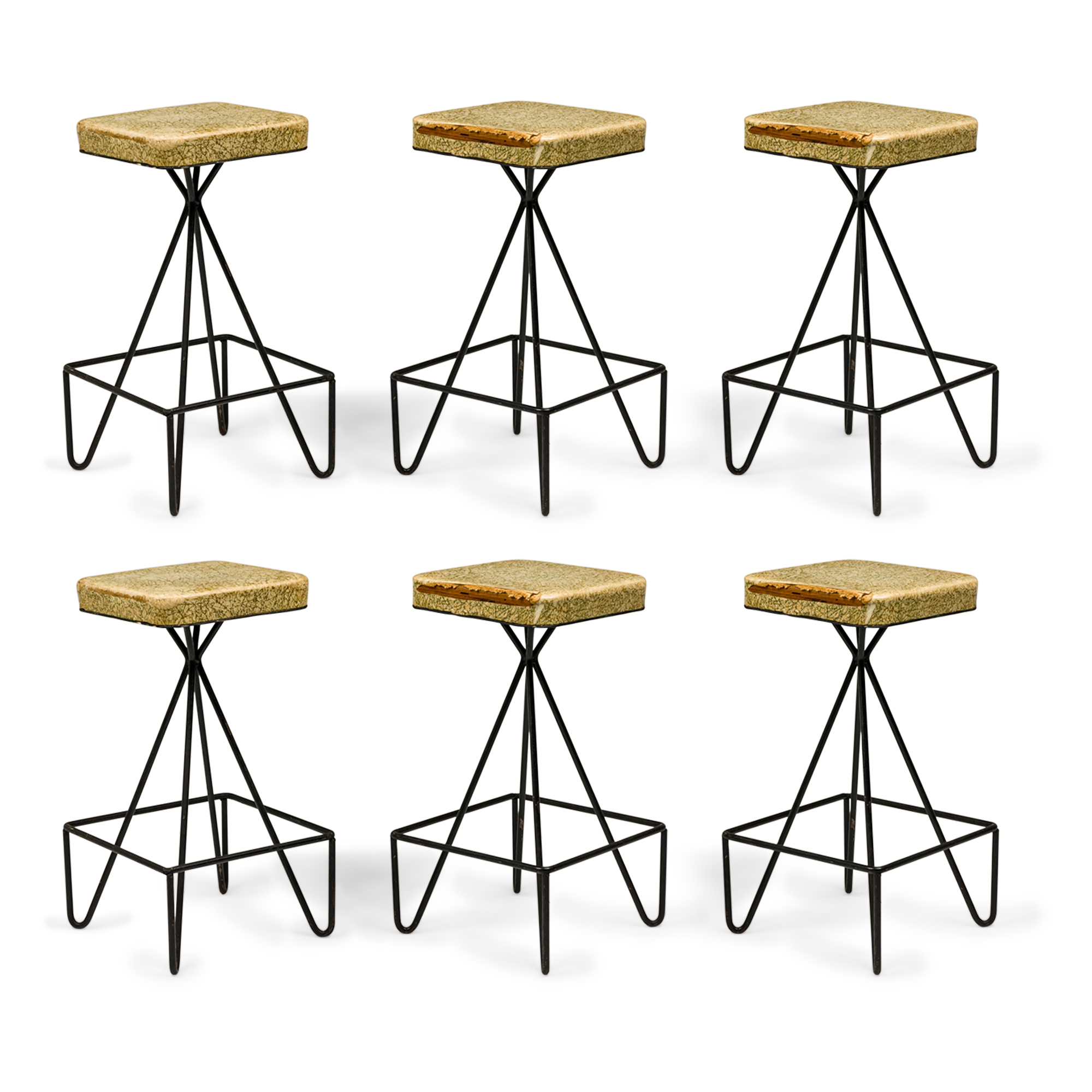 Set of 6 Frederick Weinberg Mid-Century Wrought Iron "Hairpin" Leg, Swivel Seat Bar Stools
