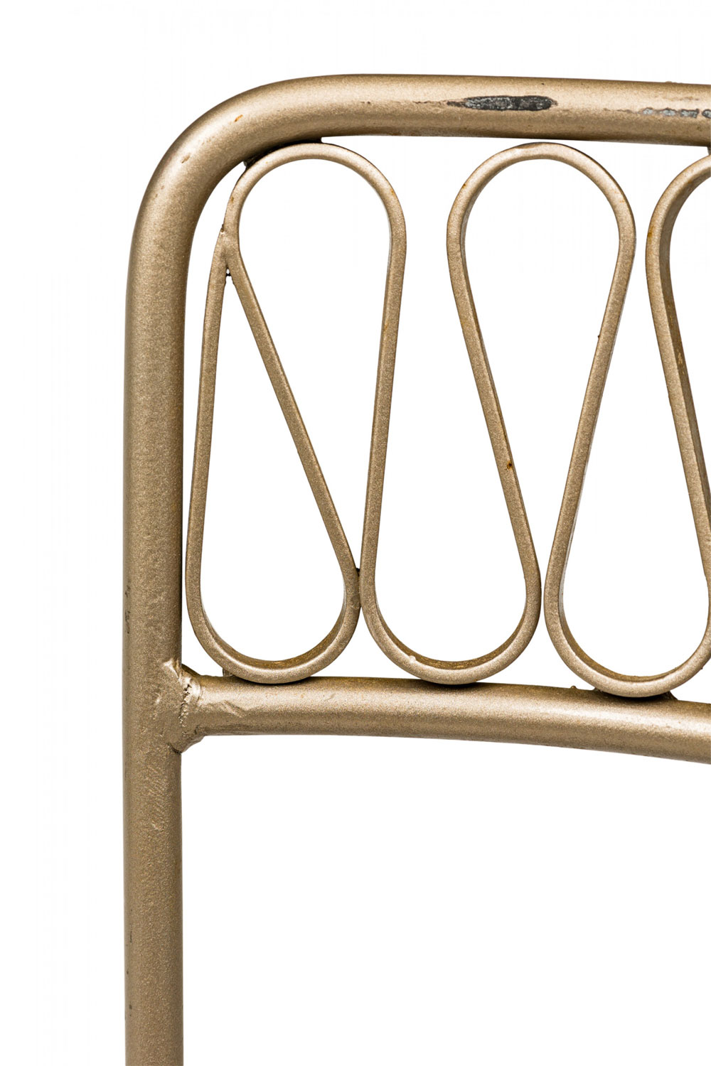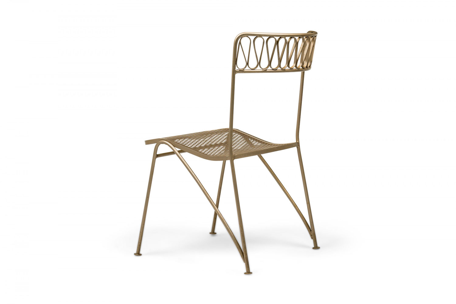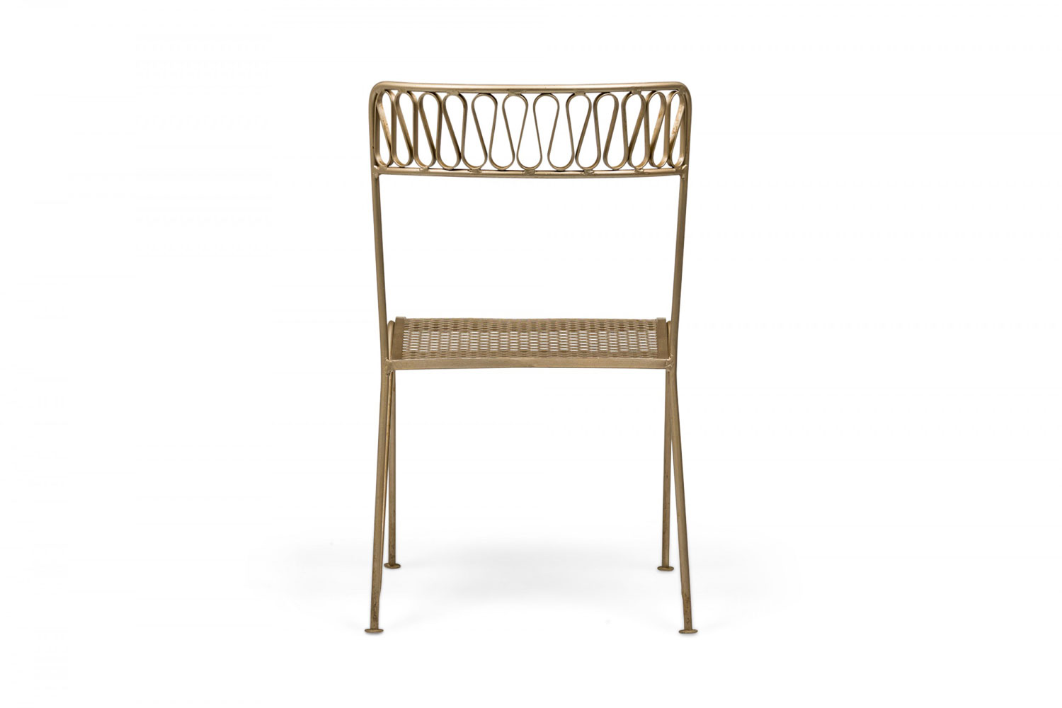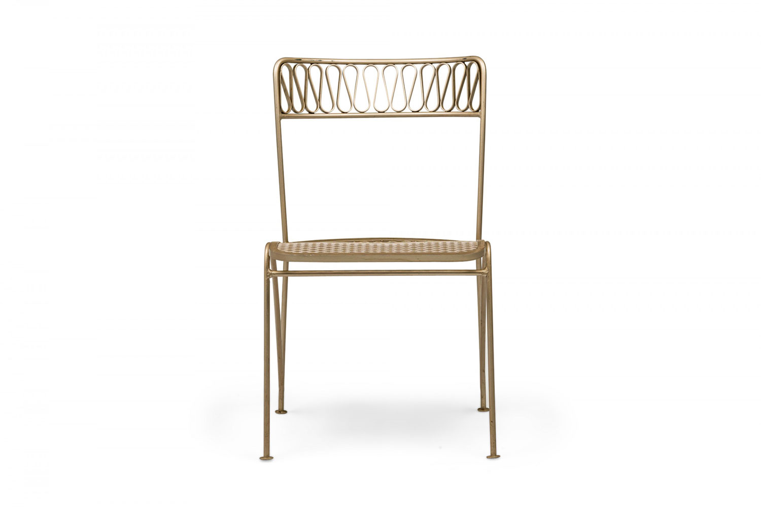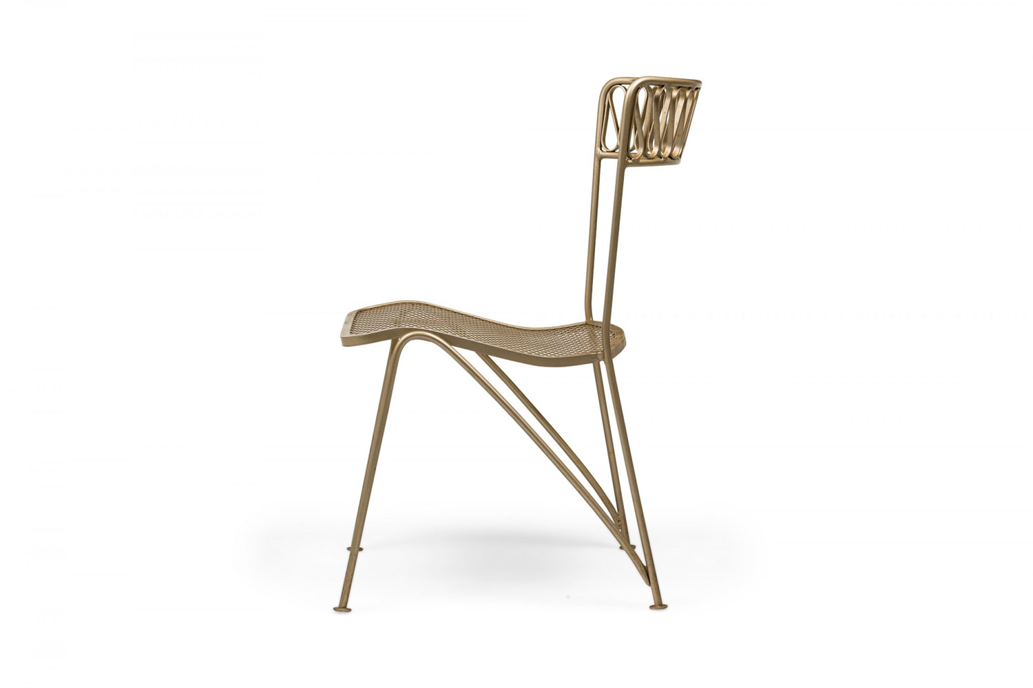 SET of 6 Mid-Century Italian ribbon dining chairs with gently sloped, mesh metal seats and demilune backs in a pale shade of gold. (MAURIZIO TEMPESTINI FOR SALTERINI)(PRICED AS SET)(Other examples in different color: DUF0814).