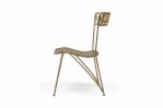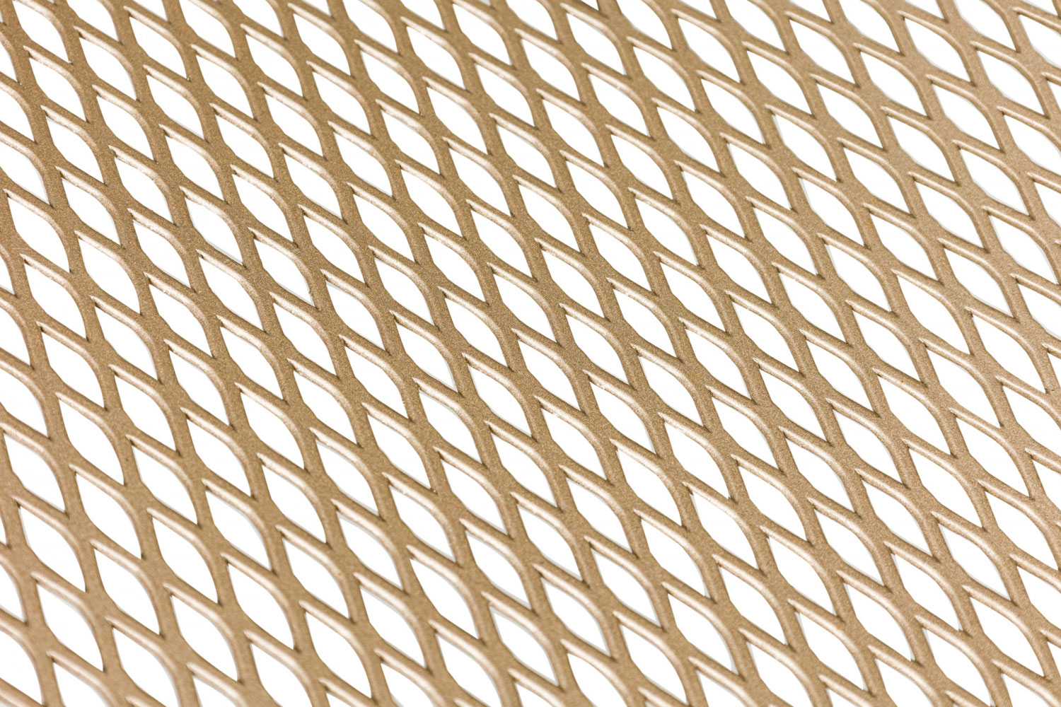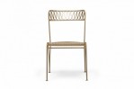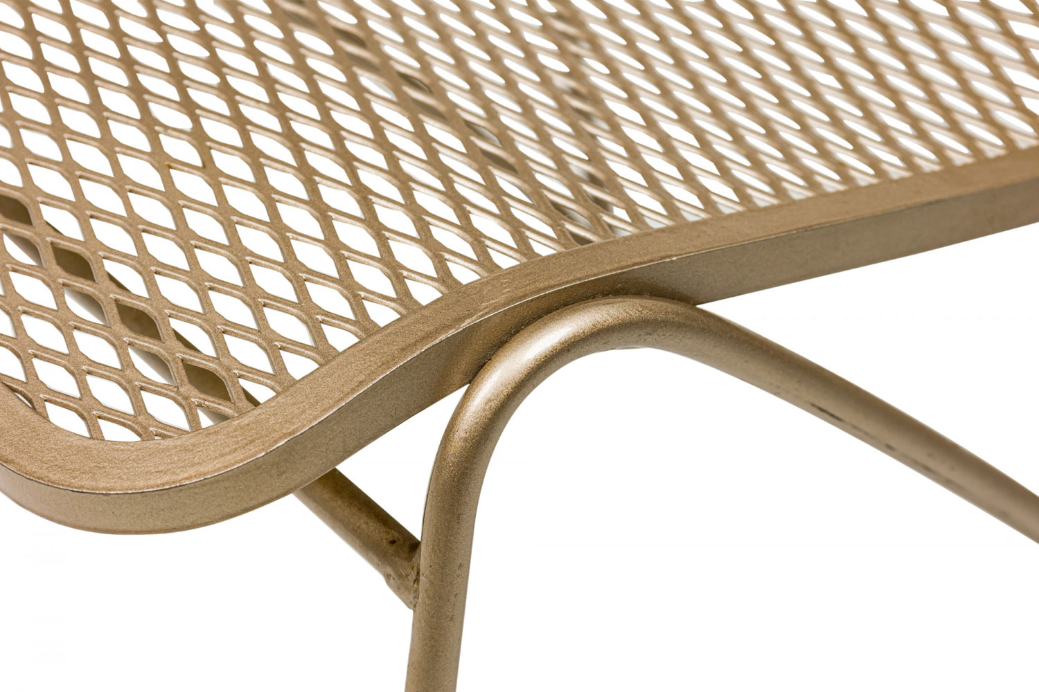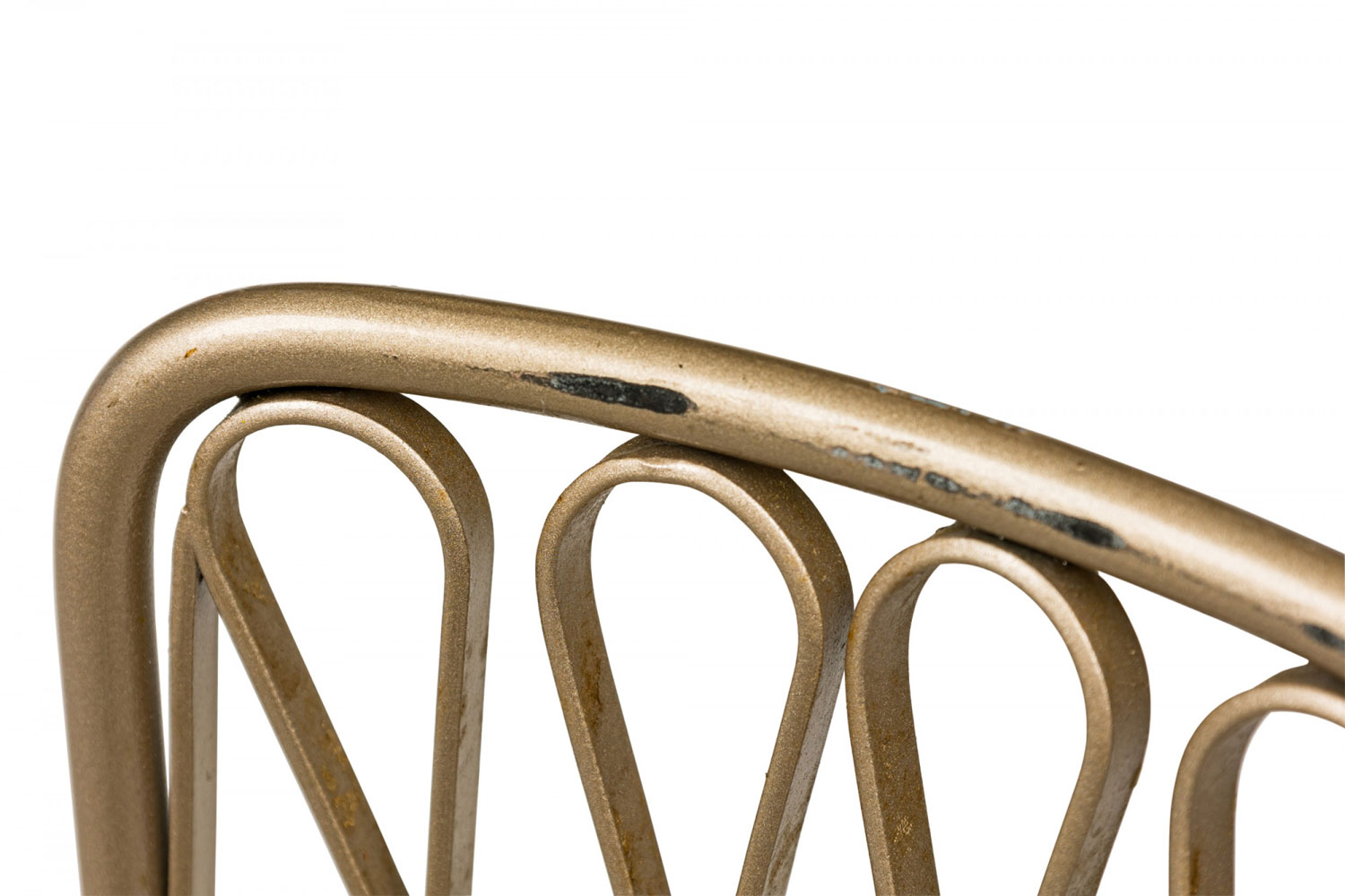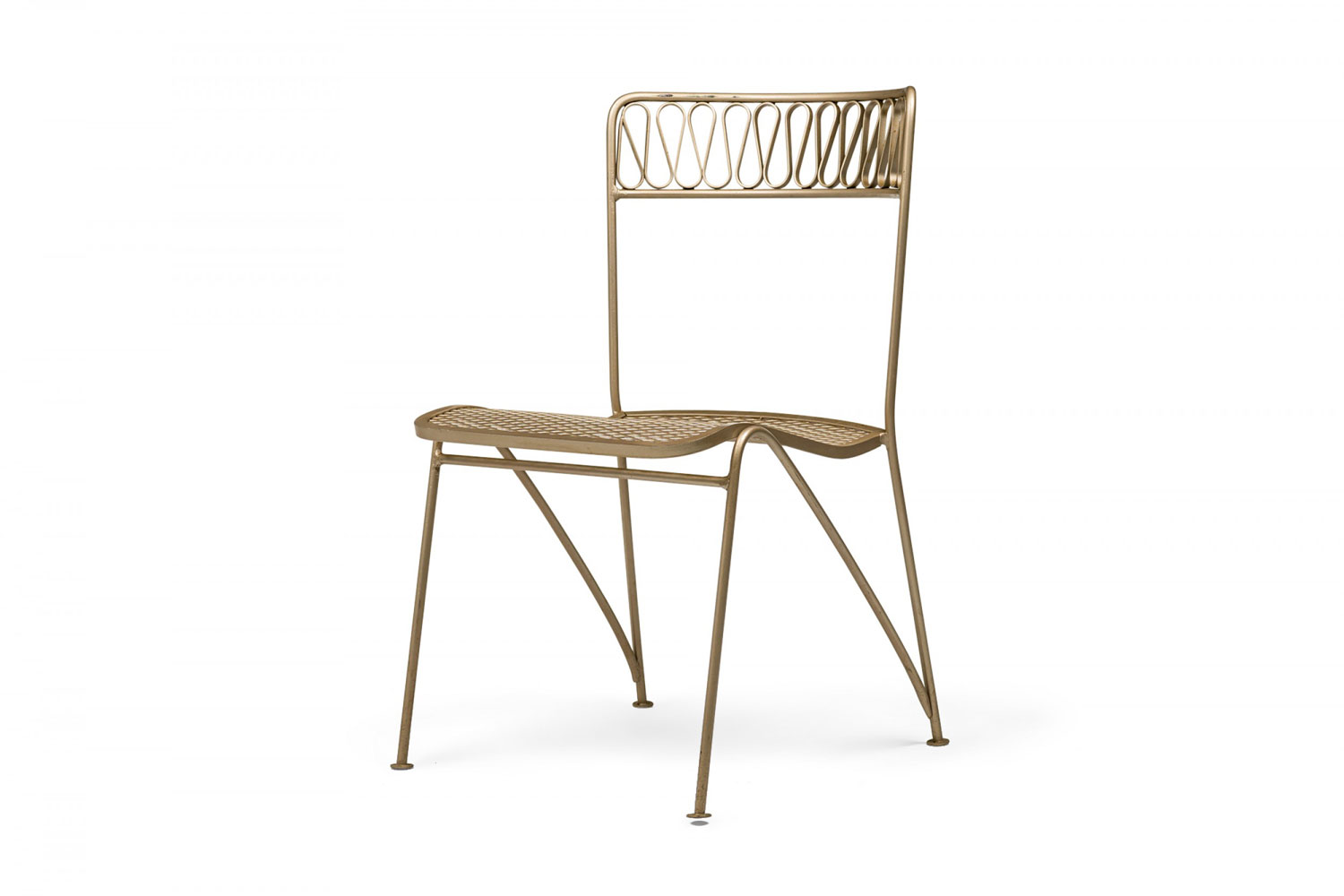 SET of 6 Mid-Century Italian ribbon dining chairs with gently sloped, mesh metal seats and demilune backs in a pale shade of gold. (MAURIZIO TEMPESTINI FOR SALTERINI)(PRICED AS SET)(Other examples in different color: DUF0814).