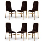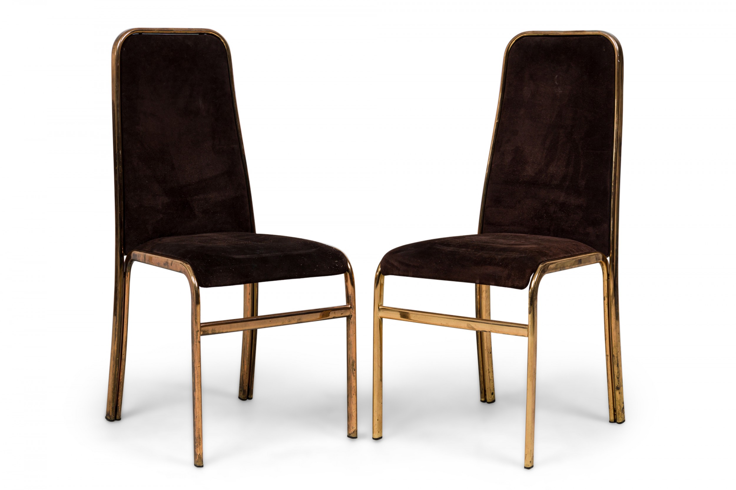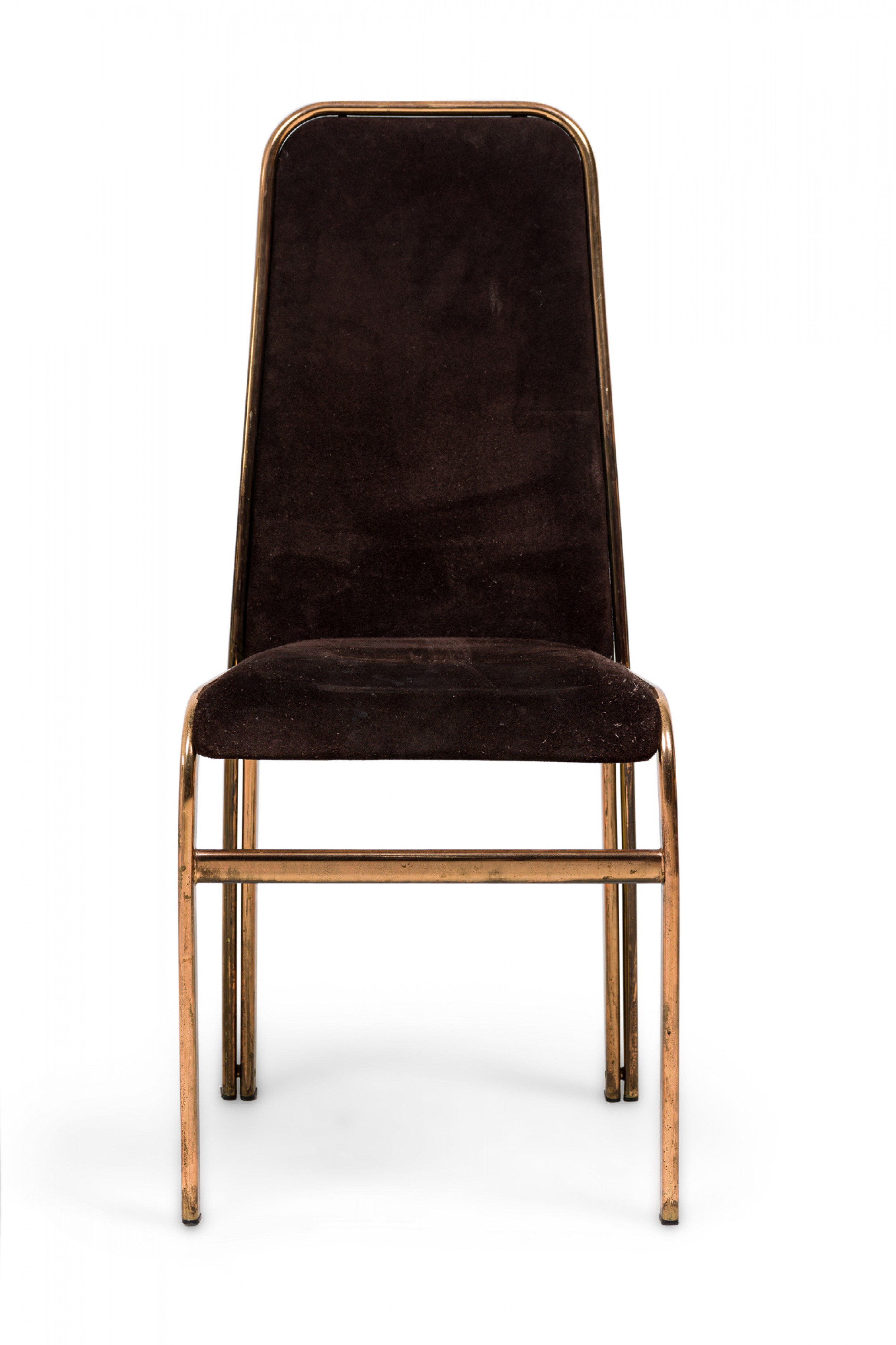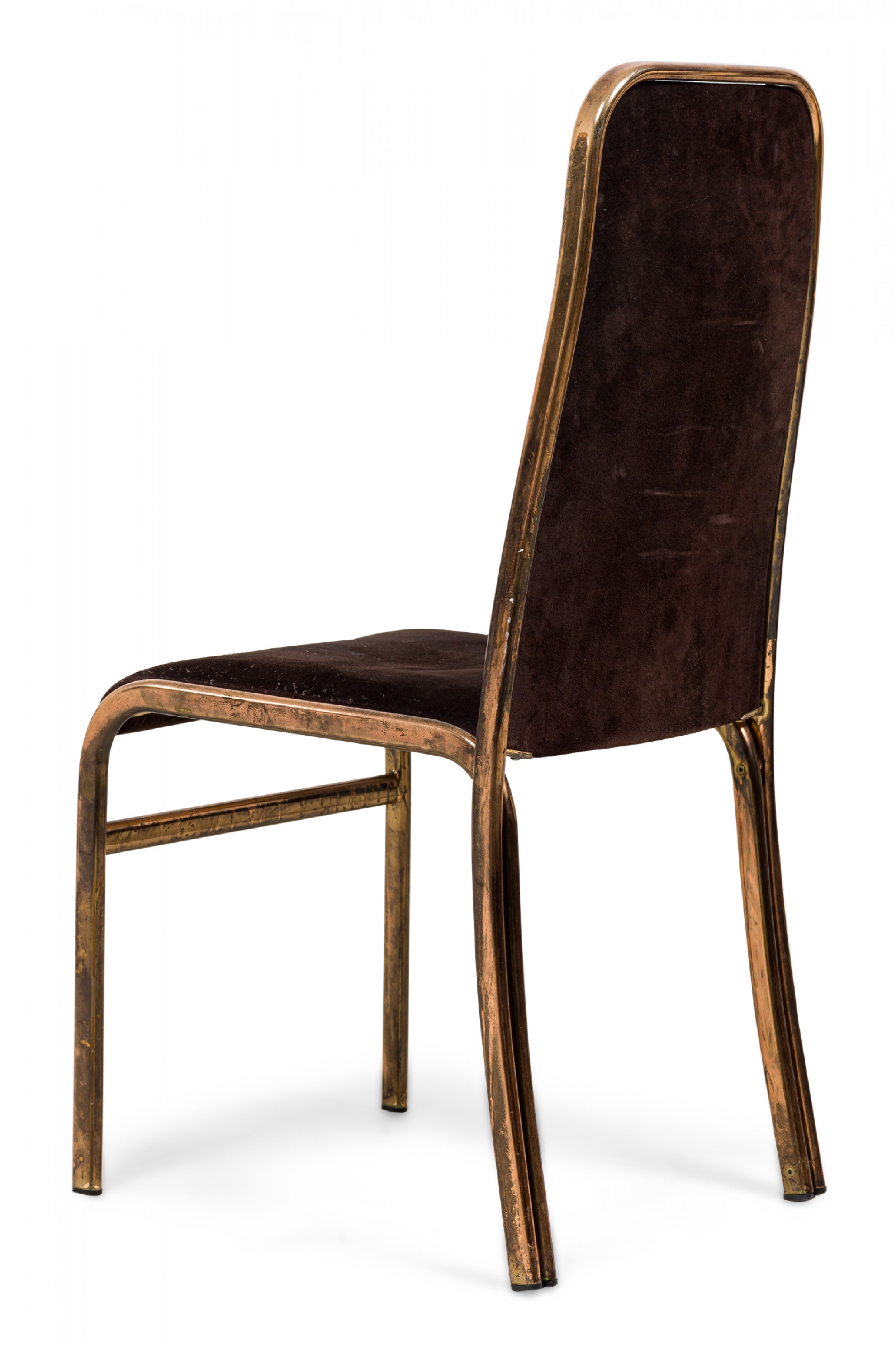 SET of 6 Mid-Century American brass sculptural dining chairs in flattened tubular form featuring sloped and tapered rectangular backs with rounded shoulders and convex seats, upholstered in dark chocolate brown suede. (MILO BAUGHMAN) (PRICED AS SET)