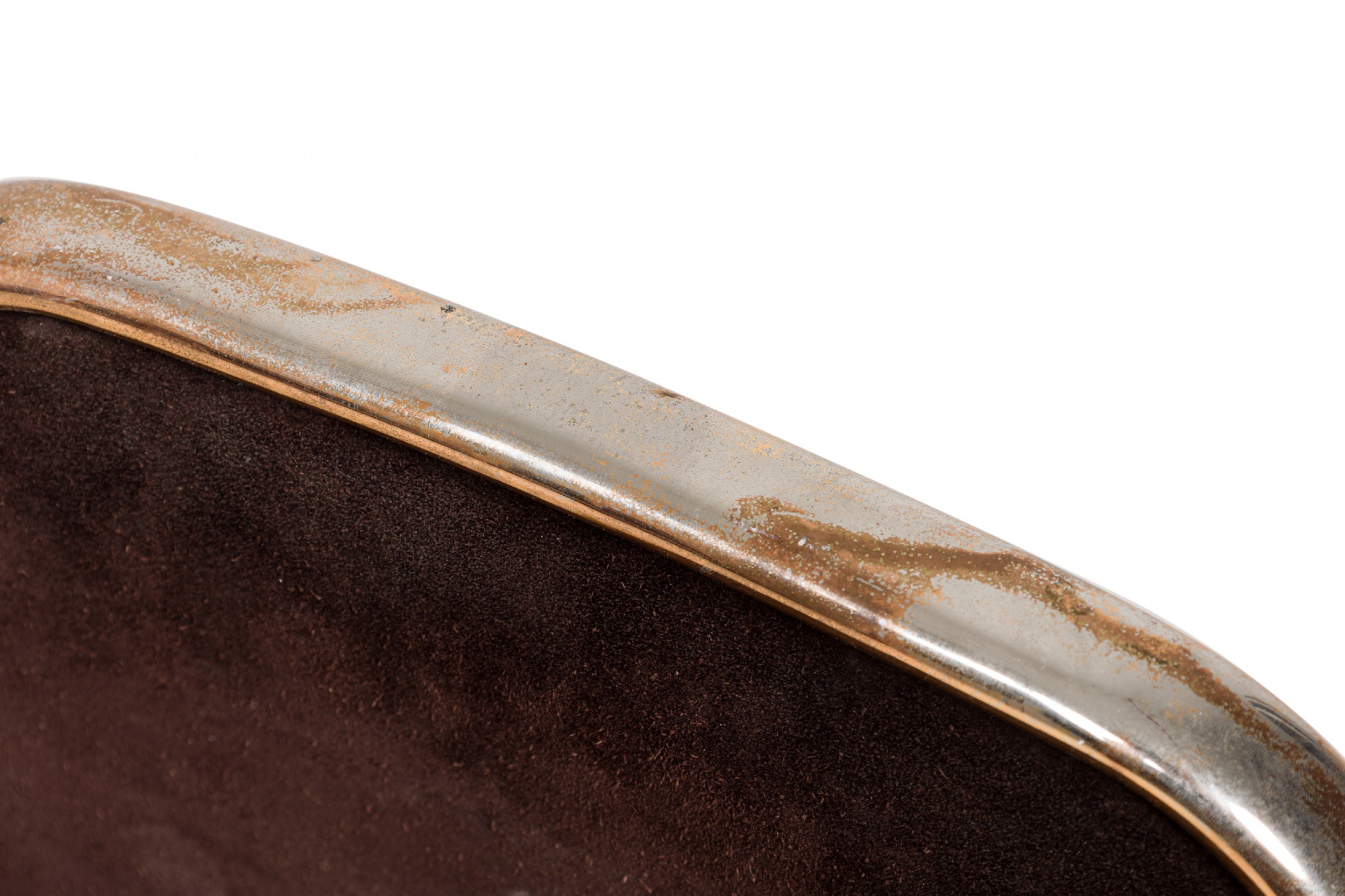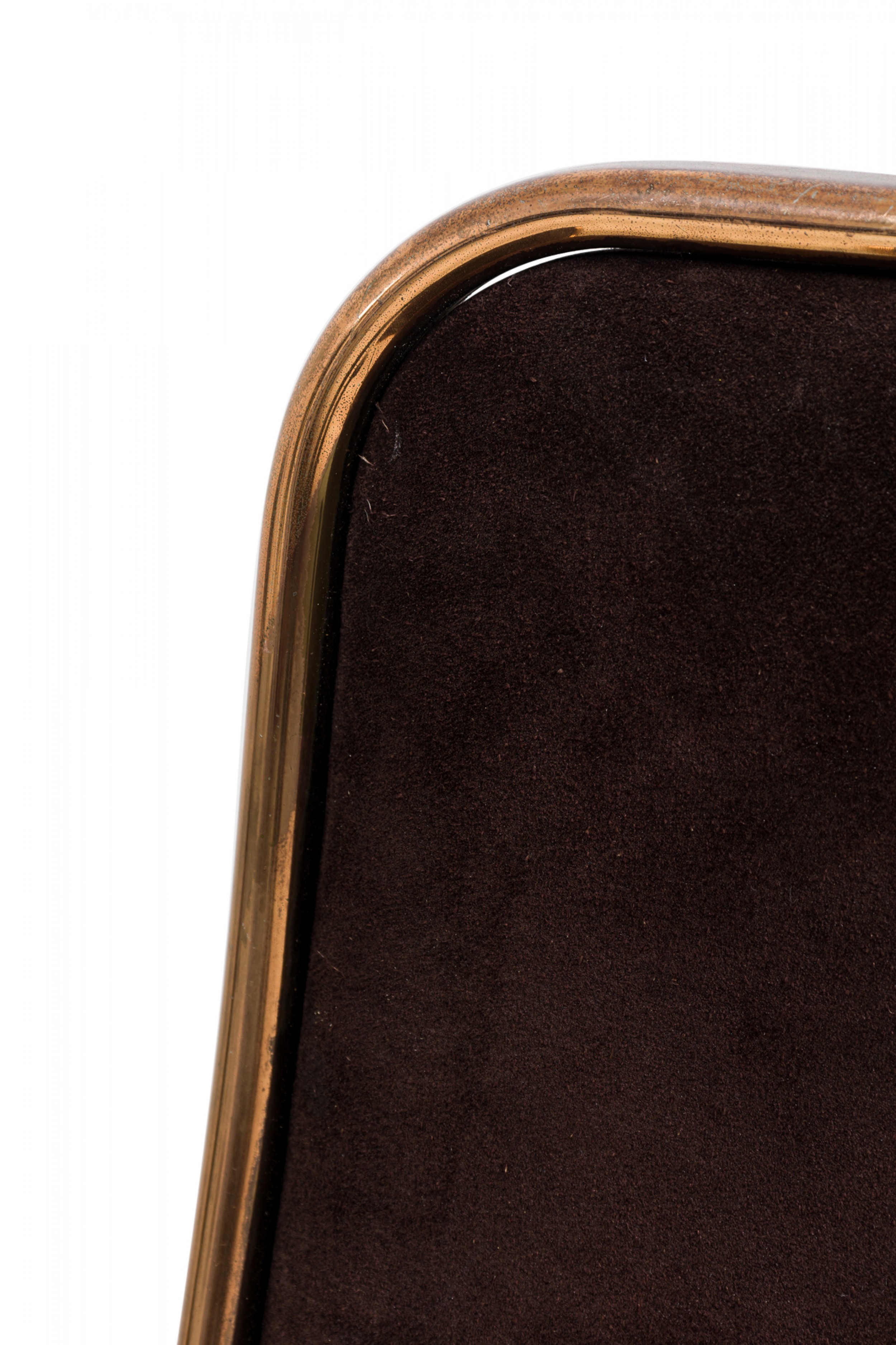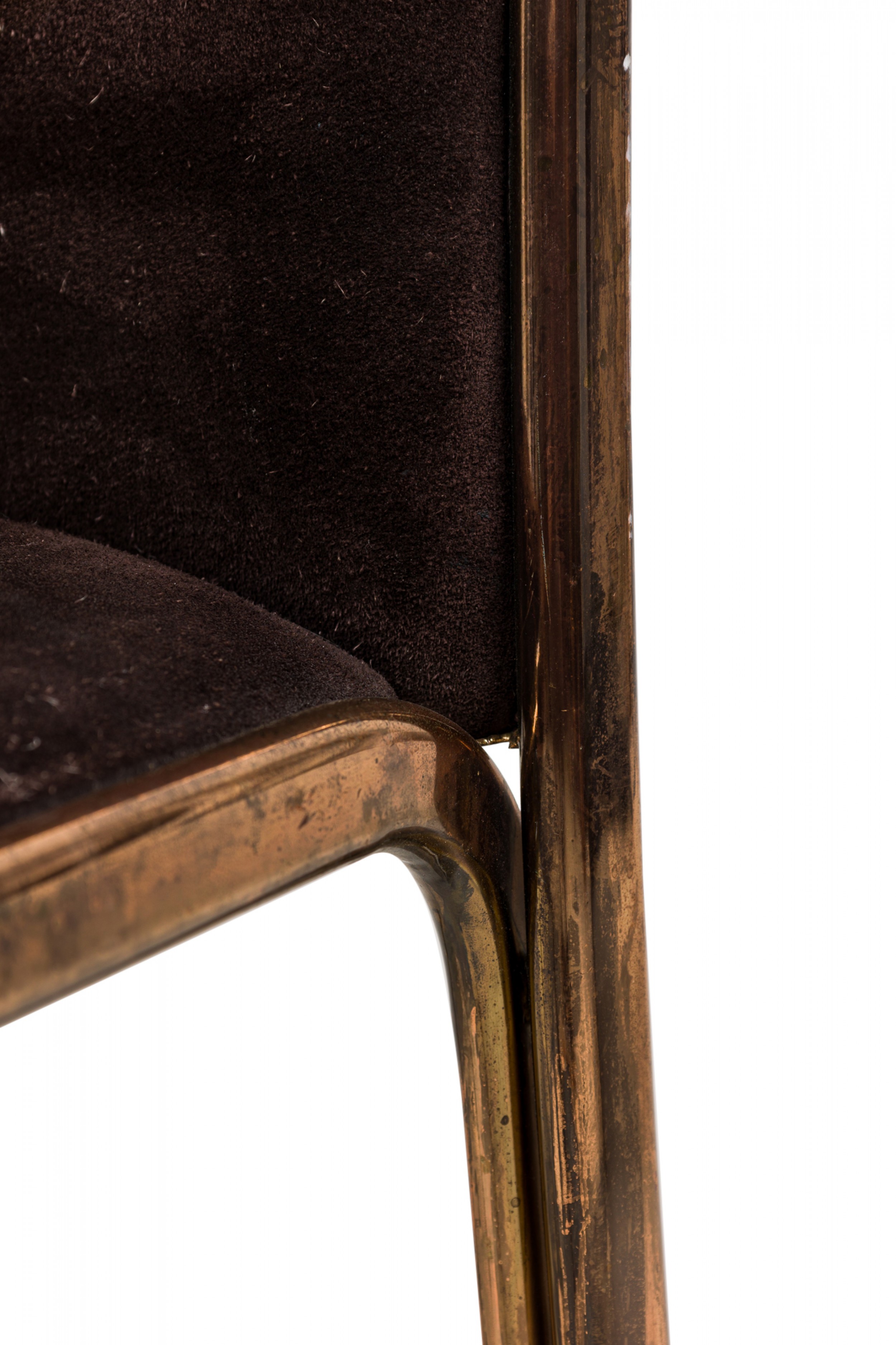 SET of 6 Mid-Century American brass sculptural dining chairs in flattened tubular form featuring sloped and tapered rectangular backs with rounded shoulders and convex seats, upholstered in dark chocolate brown suede. (MILO BAUGHMAN) (PRICED AS SET).