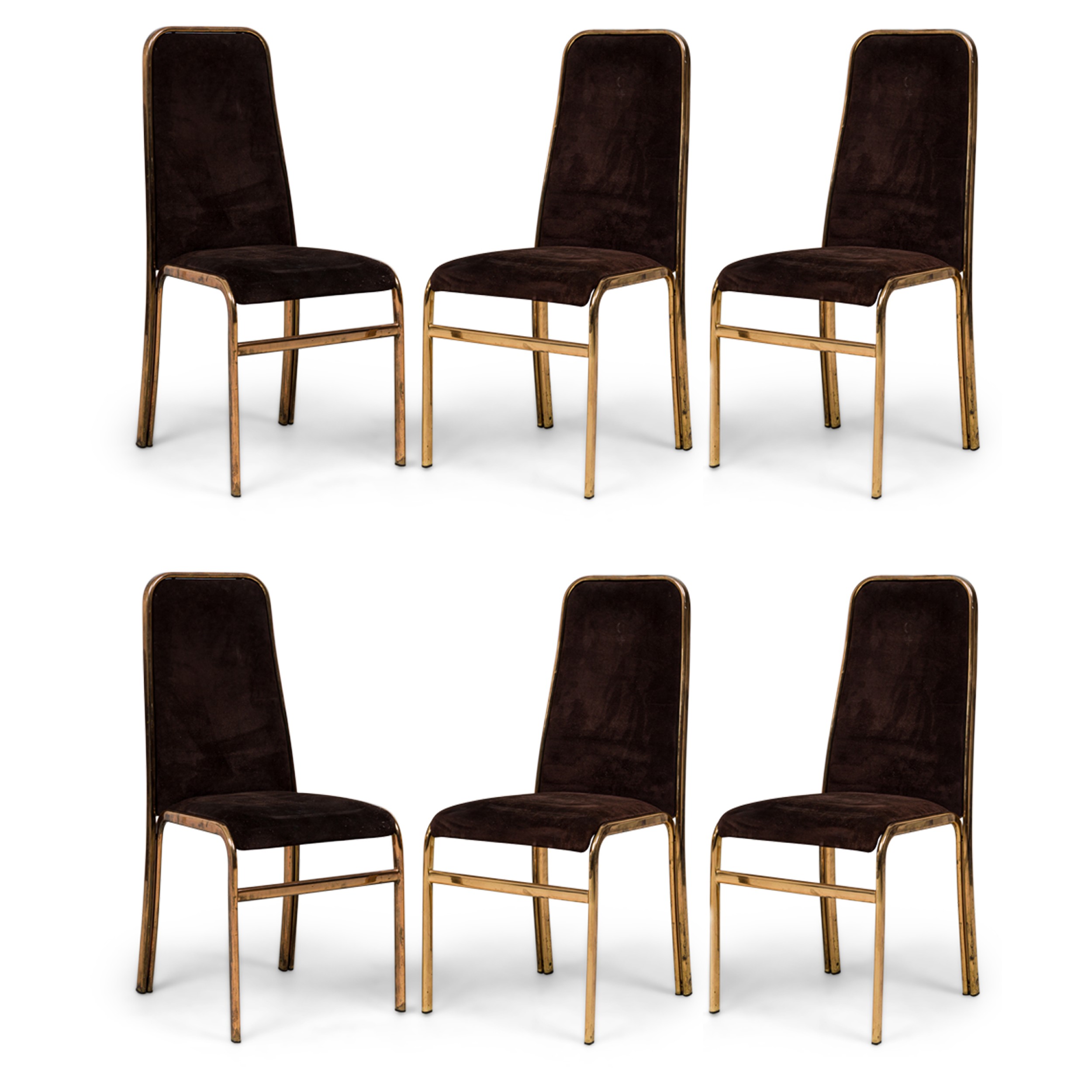 Set of 6 Milo Baughman Mid-Century American Brass Dining Chairs Upholstered in Chocolate Brown Suede