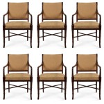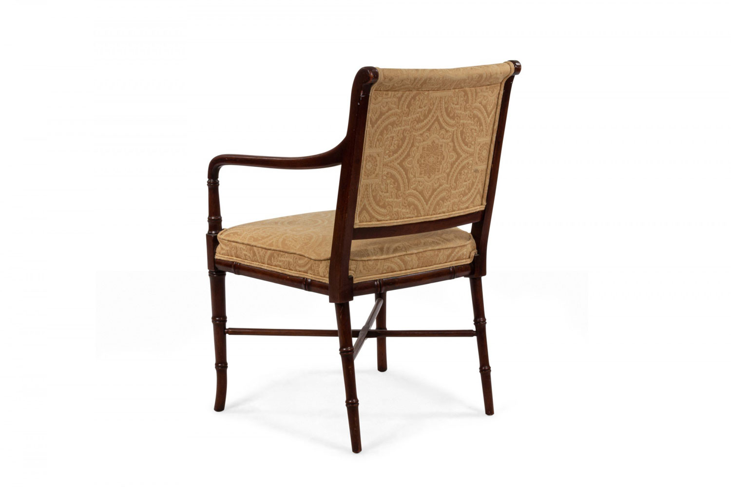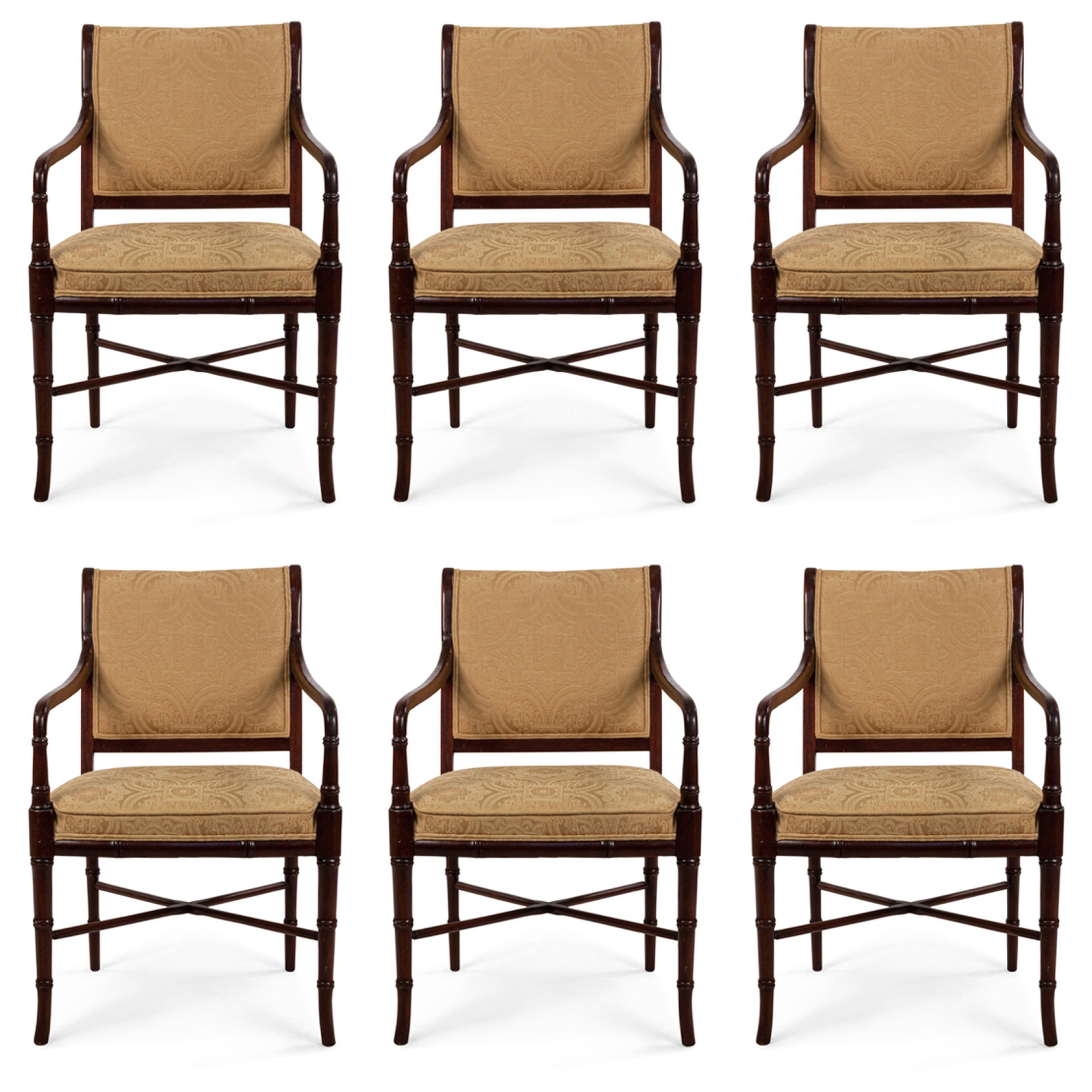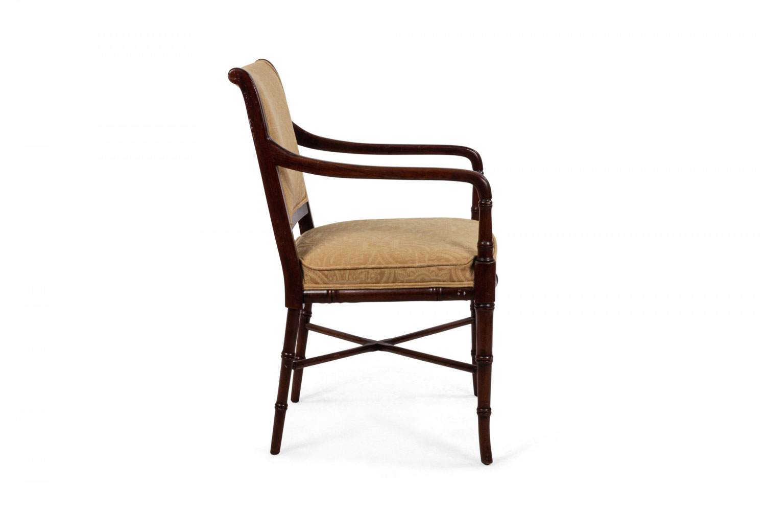 SET of 6 English Regency style mahogany armchairs with yellow damask upholstered seat & back supported on faux bamboo turned legs connected with an x-bar stretcher..