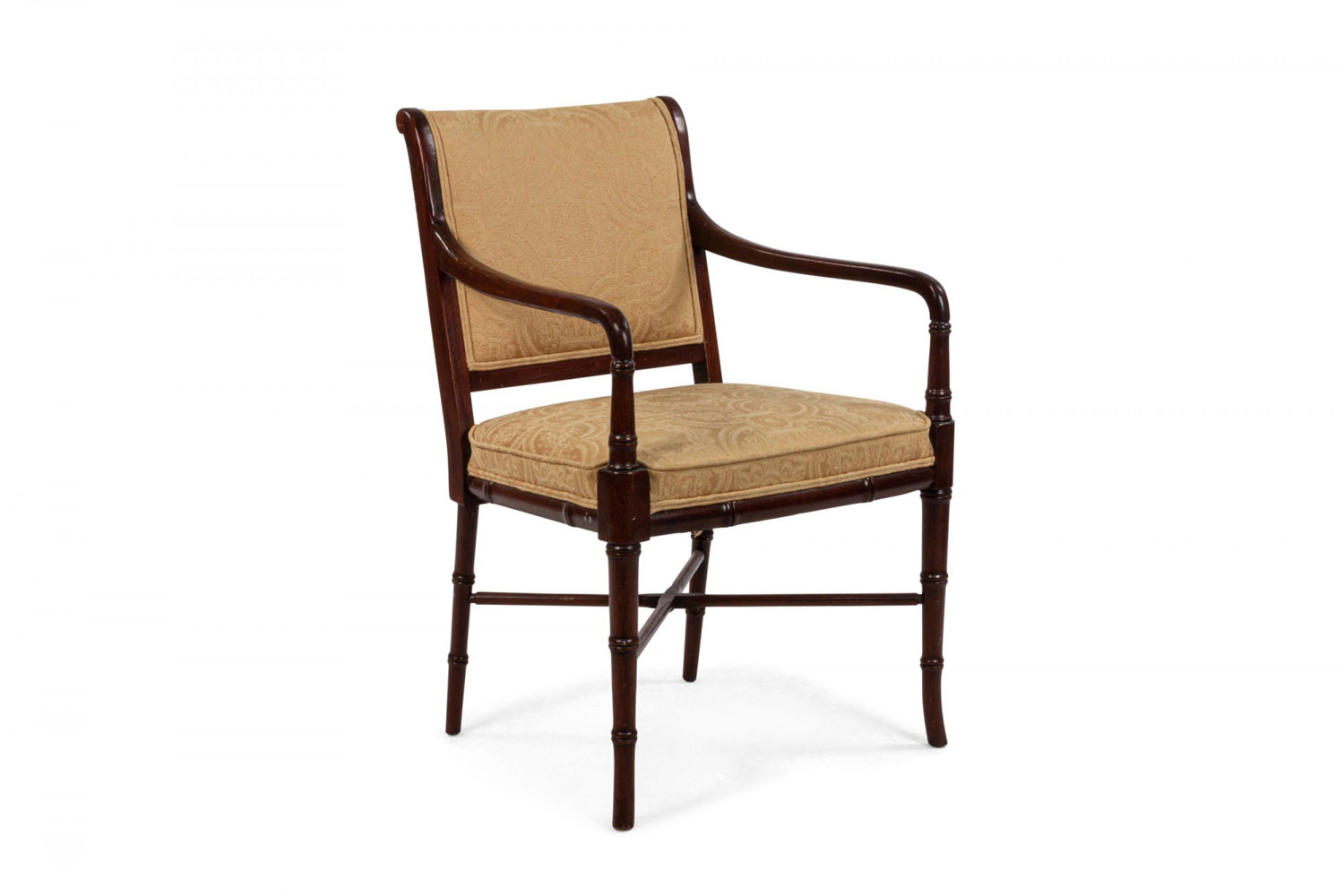 SET of 6 English Regency style mahogany armchairs with yellow damask upholstered seat & back supported on faux bamboo turned legs connected with an x-bar stretcher.