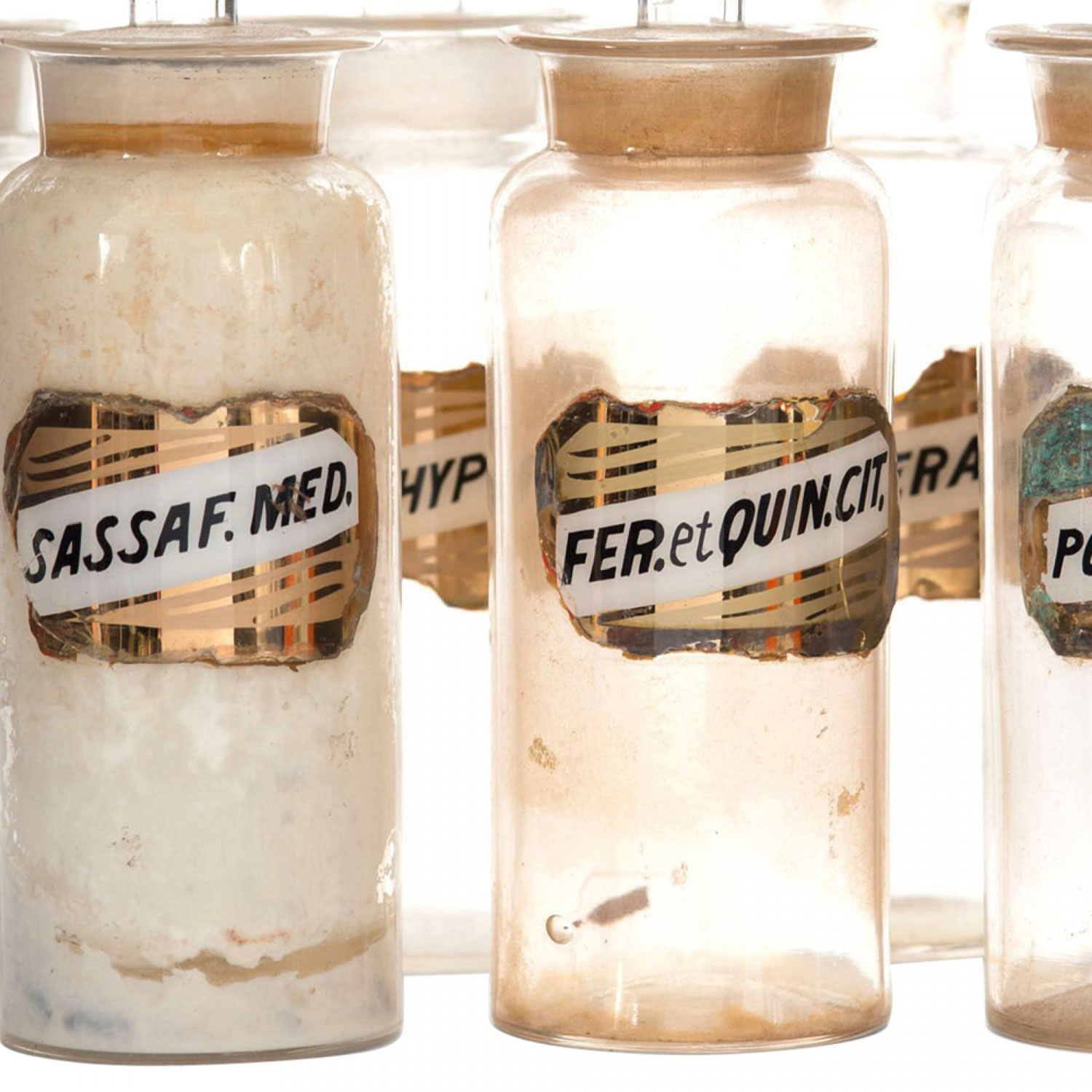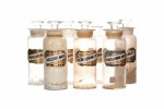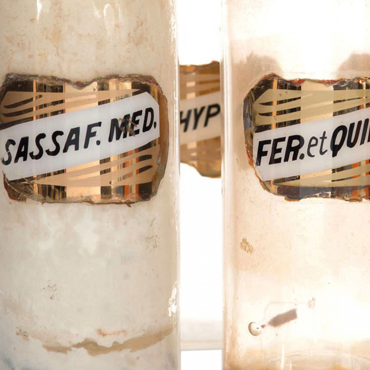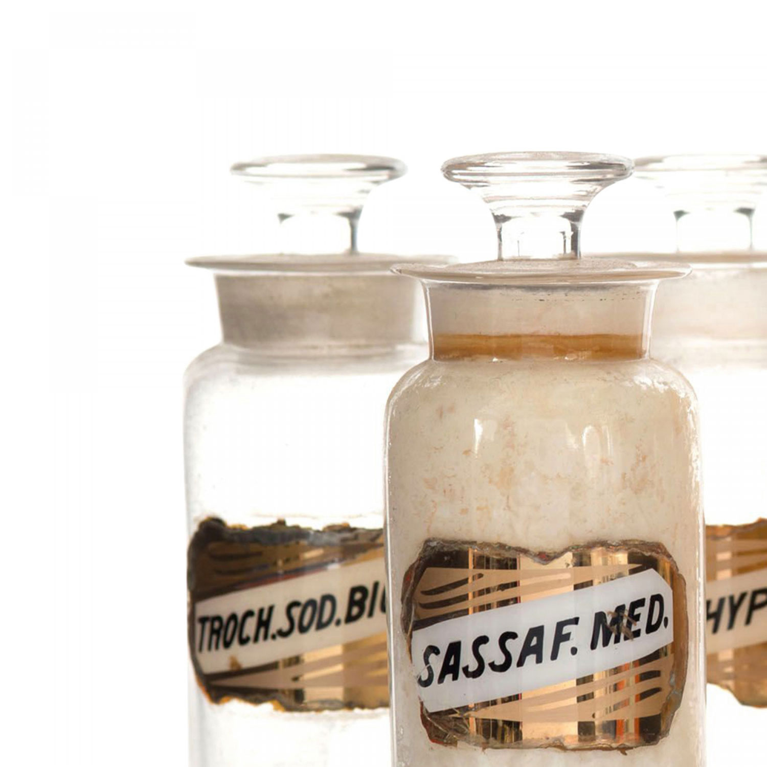 Set of 7 Clear glass apothecary bottles with labels (PRICED AS SET)