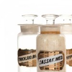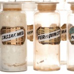 Set of 7 Clear glass apothecary bottles with labels (PRICED AS SET).