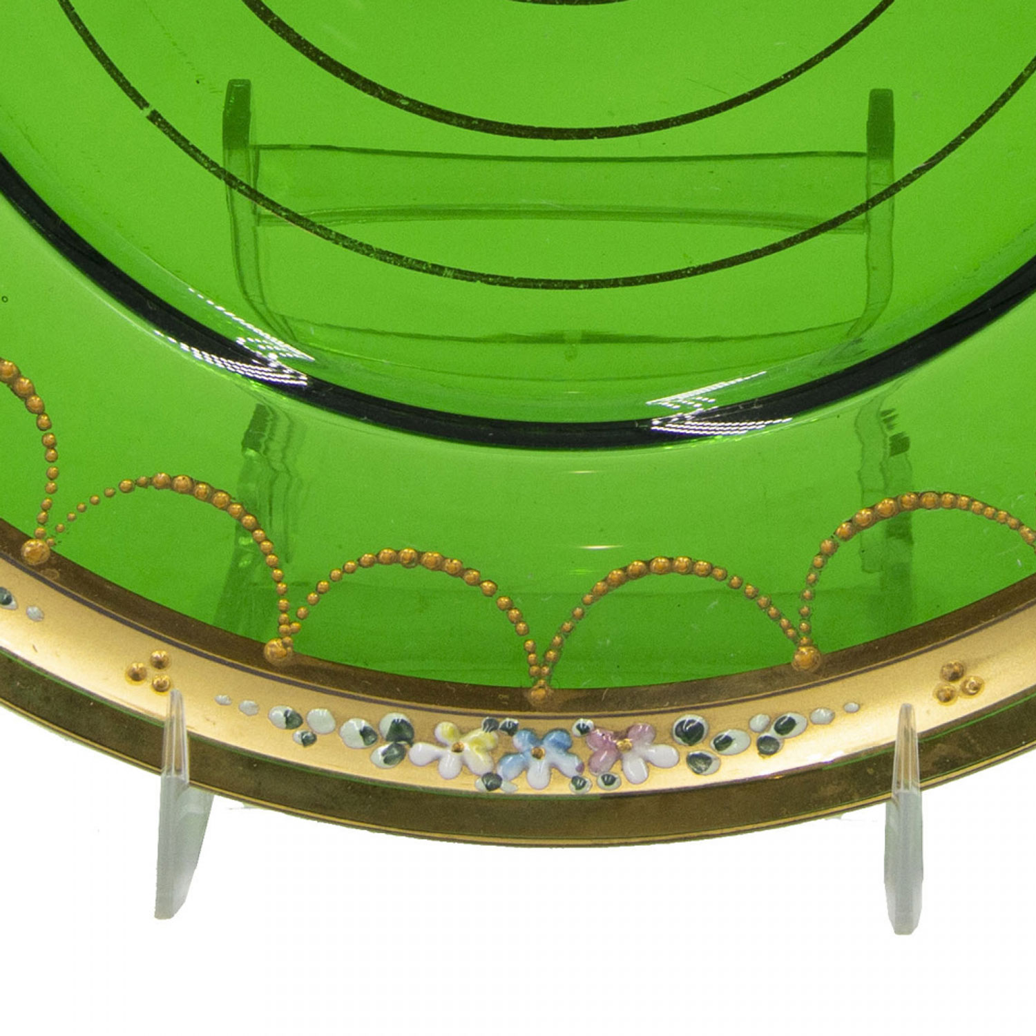 Set of 8 green crystal dinner plates with floral enamel border and gold trim.