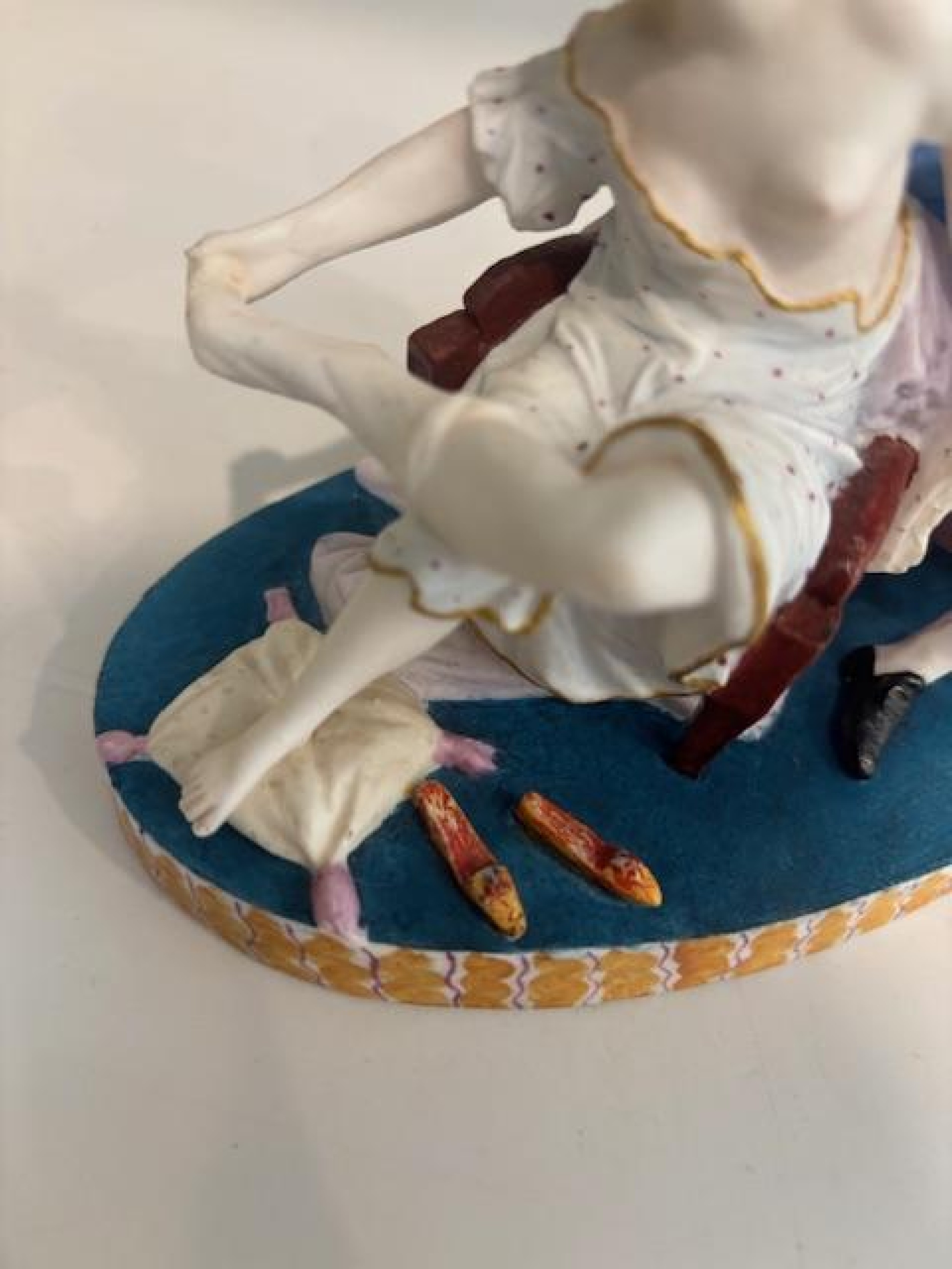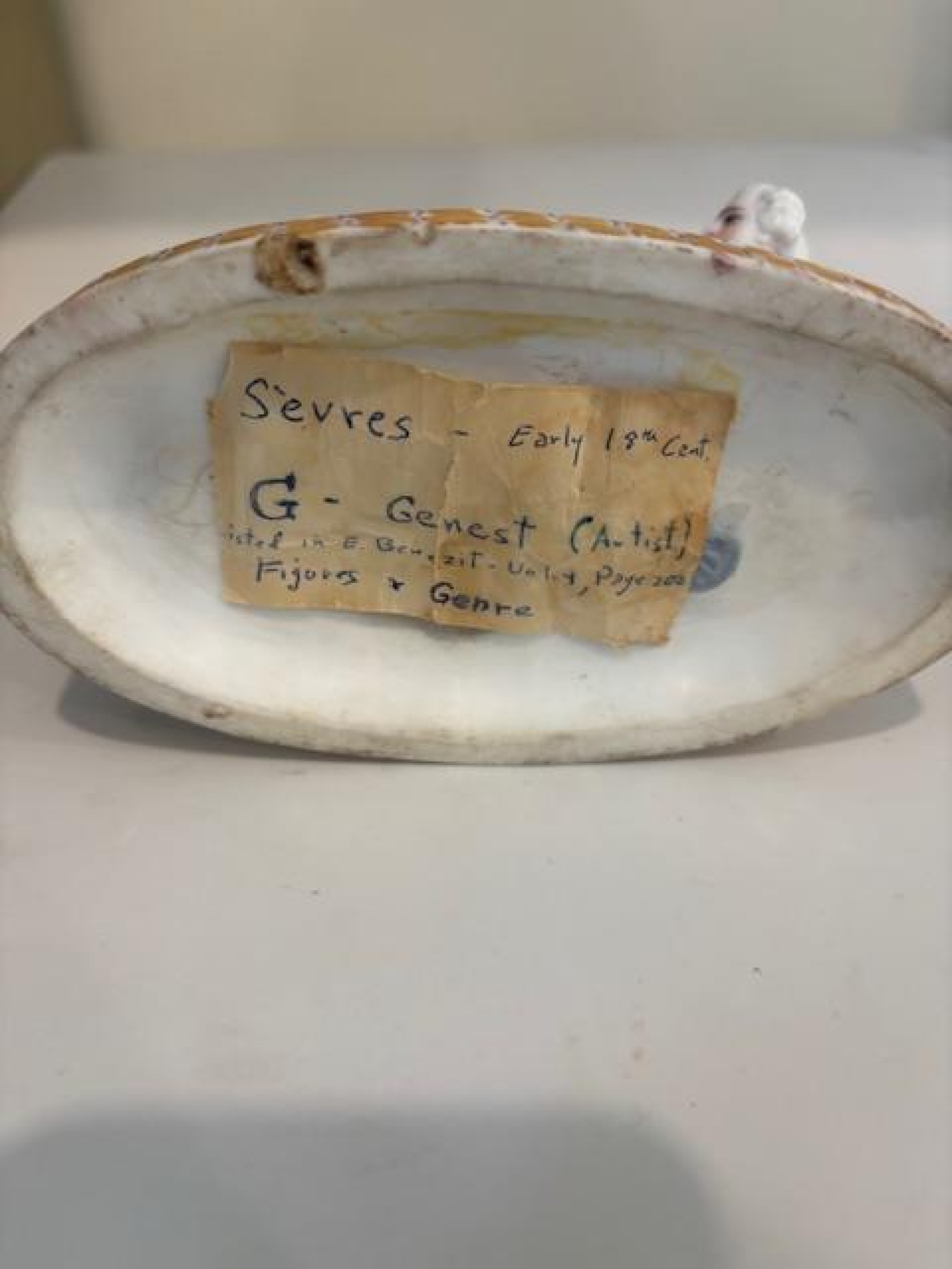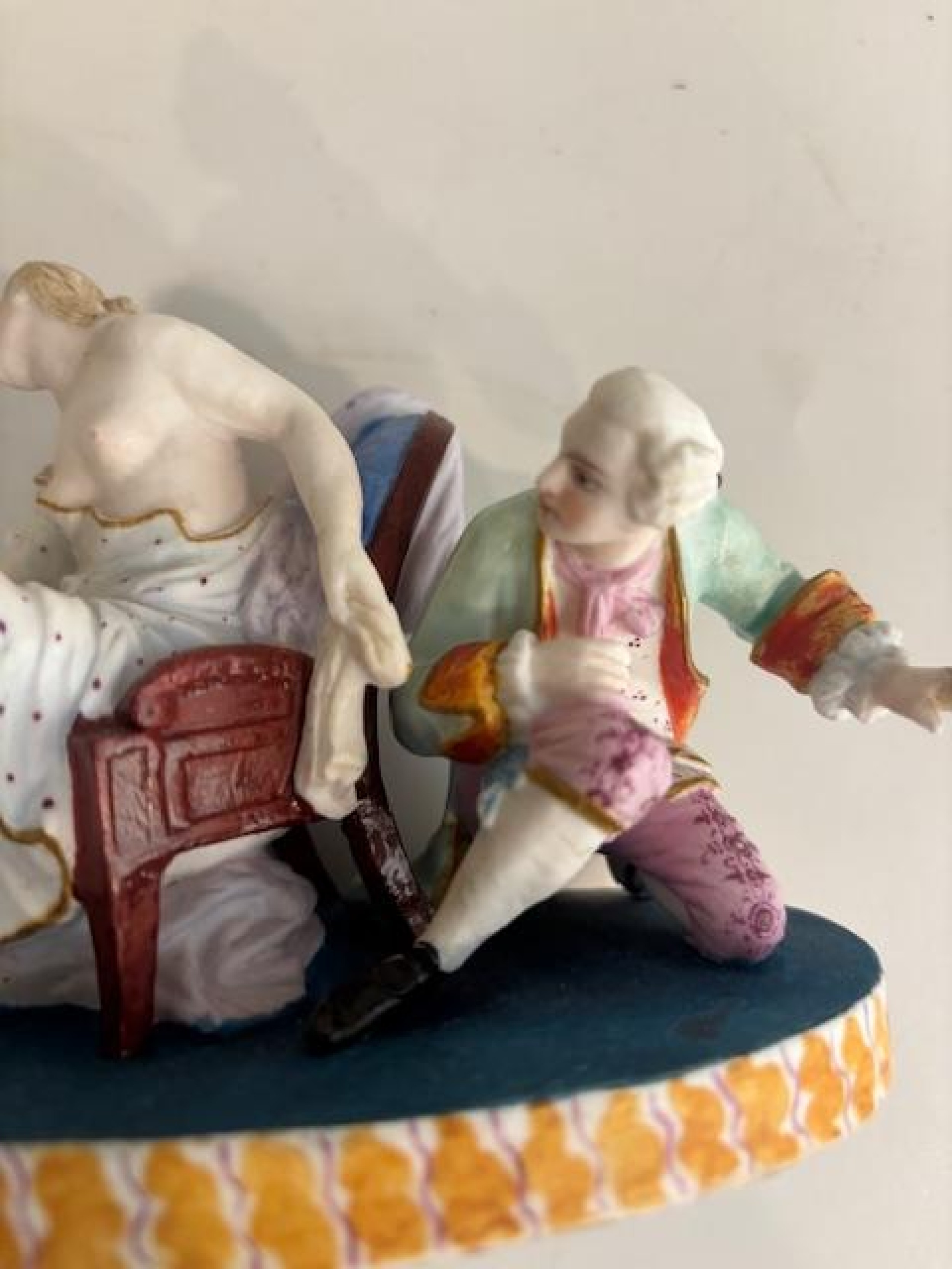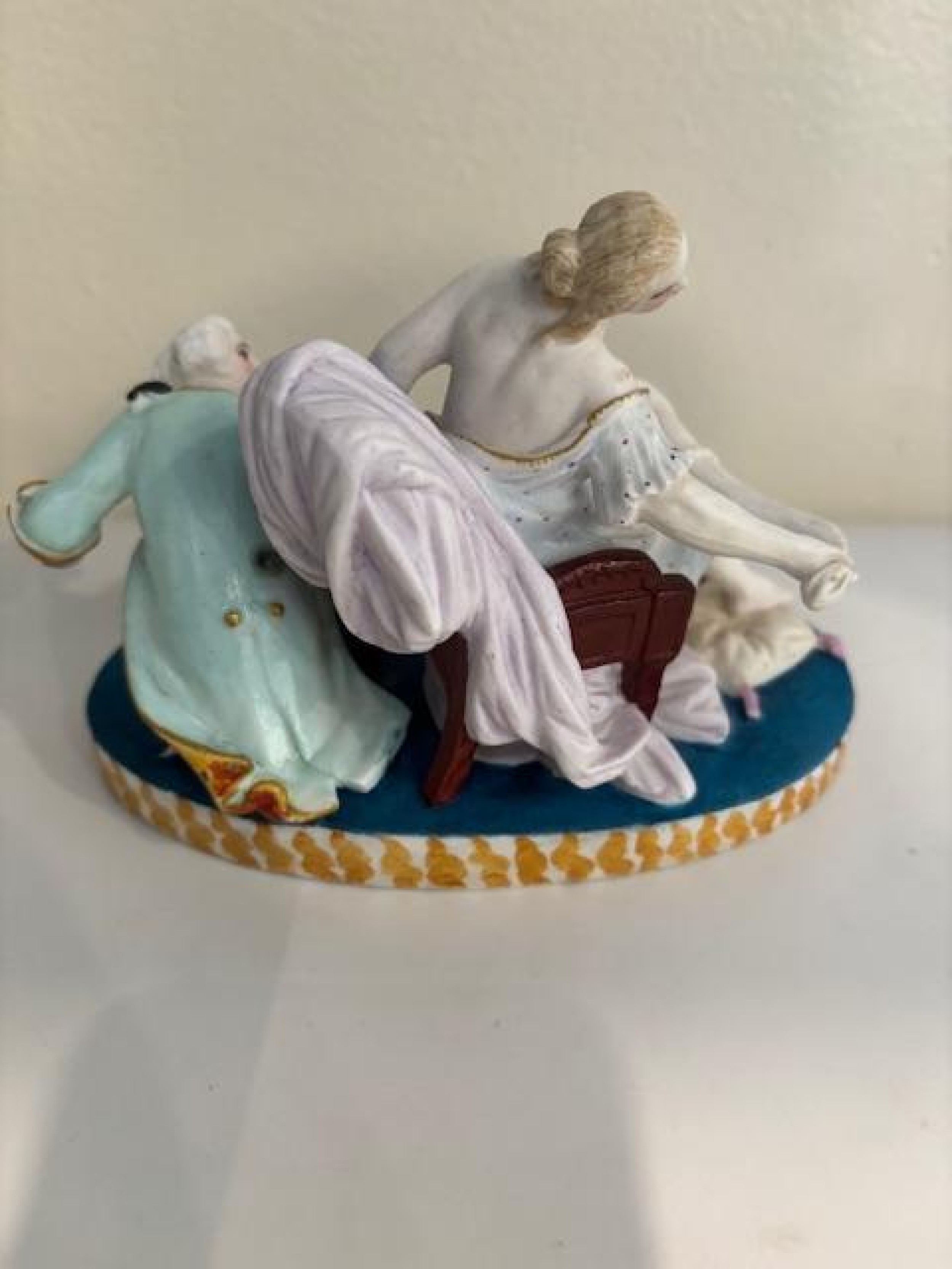 French Louis XV (18th Century) unglazed Sevre porcelain scene of a seated lady undressing while a man observes behind a chair on an oval base (blue marking: "G" GENEST).