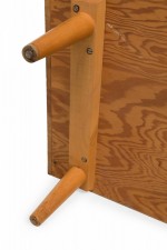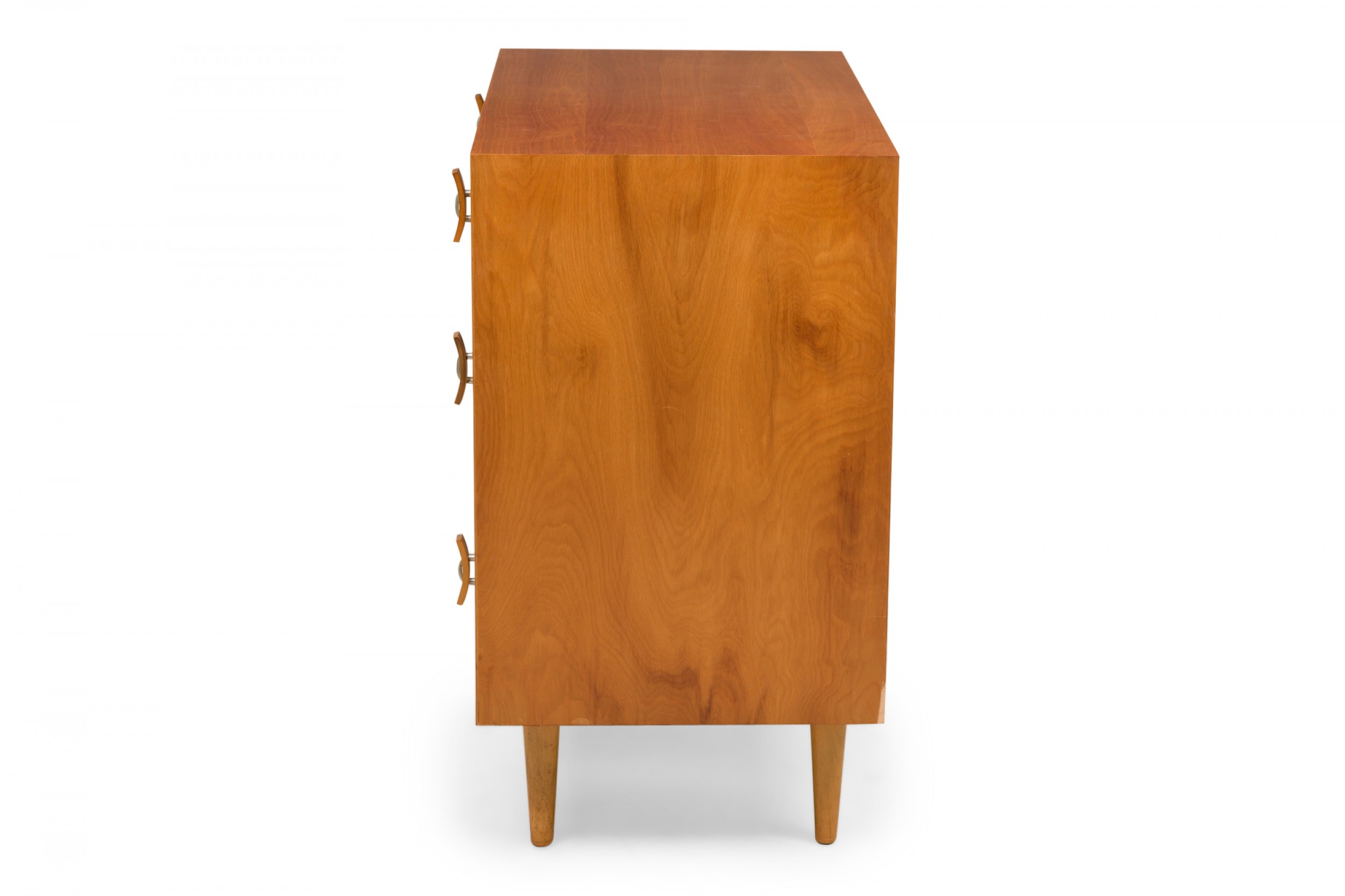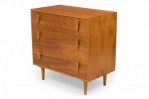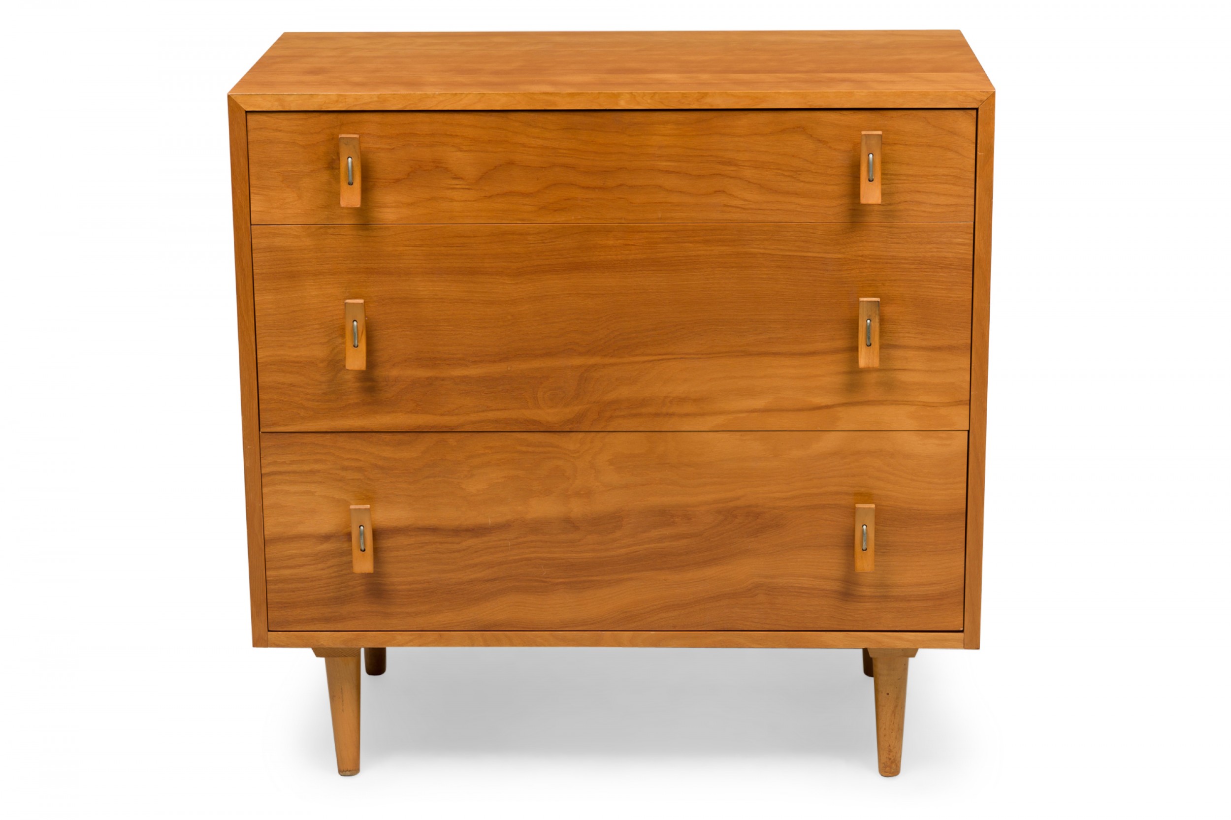 American Mid-Century blonde wood three drawer chest with curved plywood drawer pulls resting on four tapered dowel legs. (STANLEY YOUNG FOR GLENN OF CALIFORNIA)