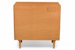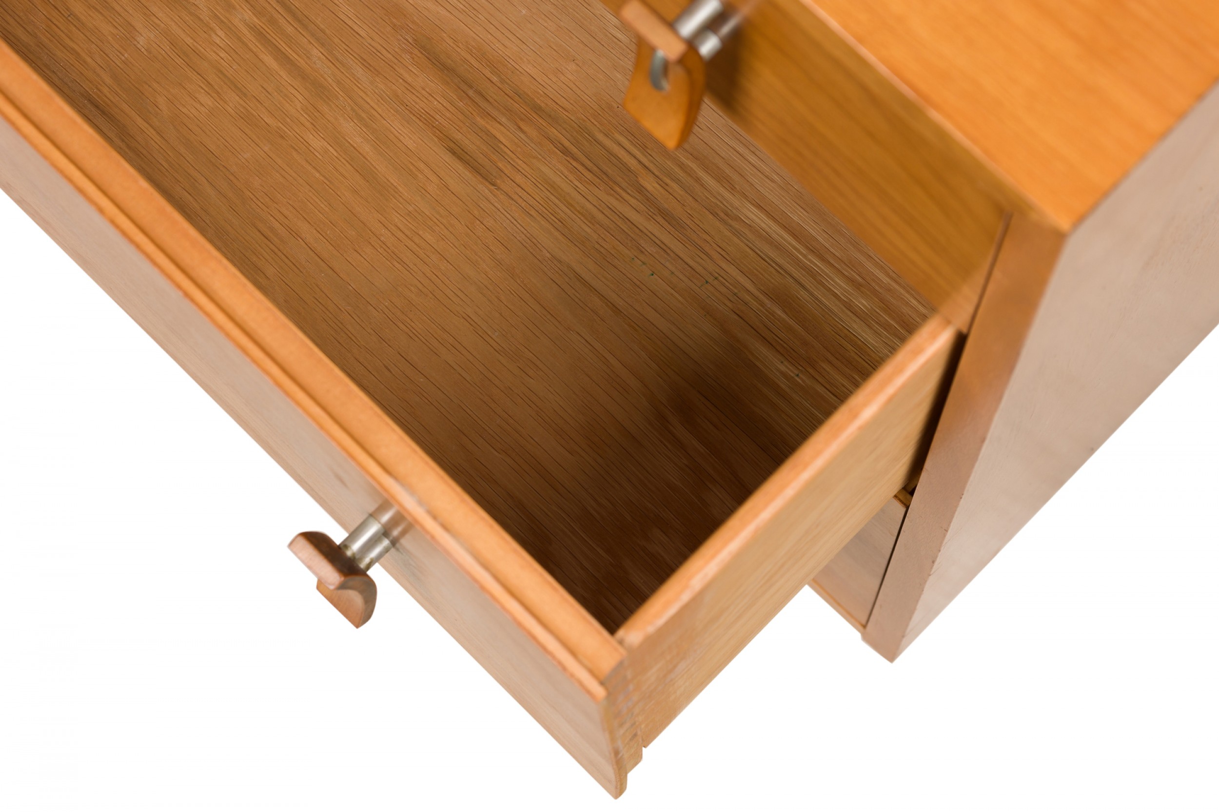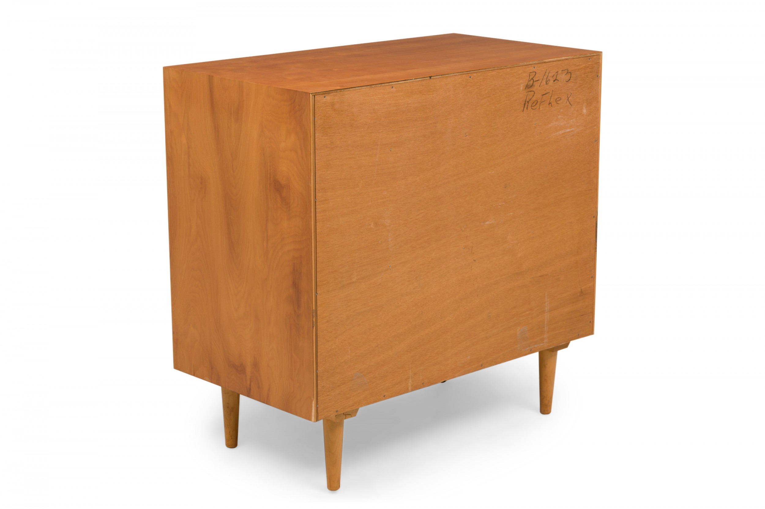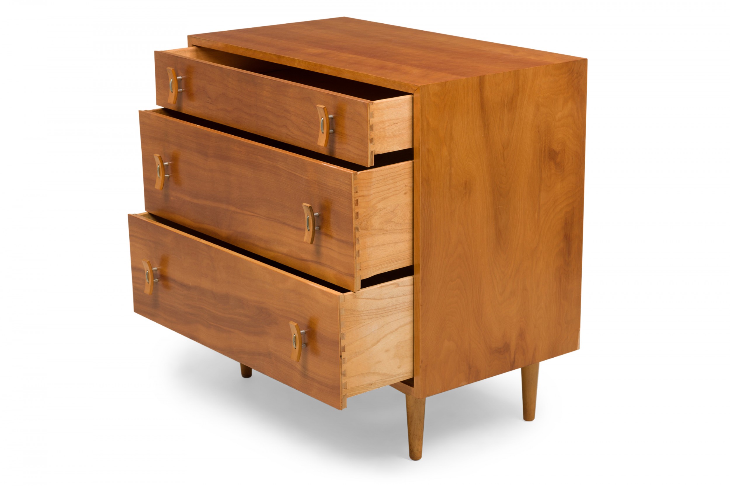 American Mid-Century blonde wood three drawer chest with curved plywood drawer pulls resting on four tapered dowel legs. (STANLEY YOUNG FOR GLENN OF CALIFORNIA).