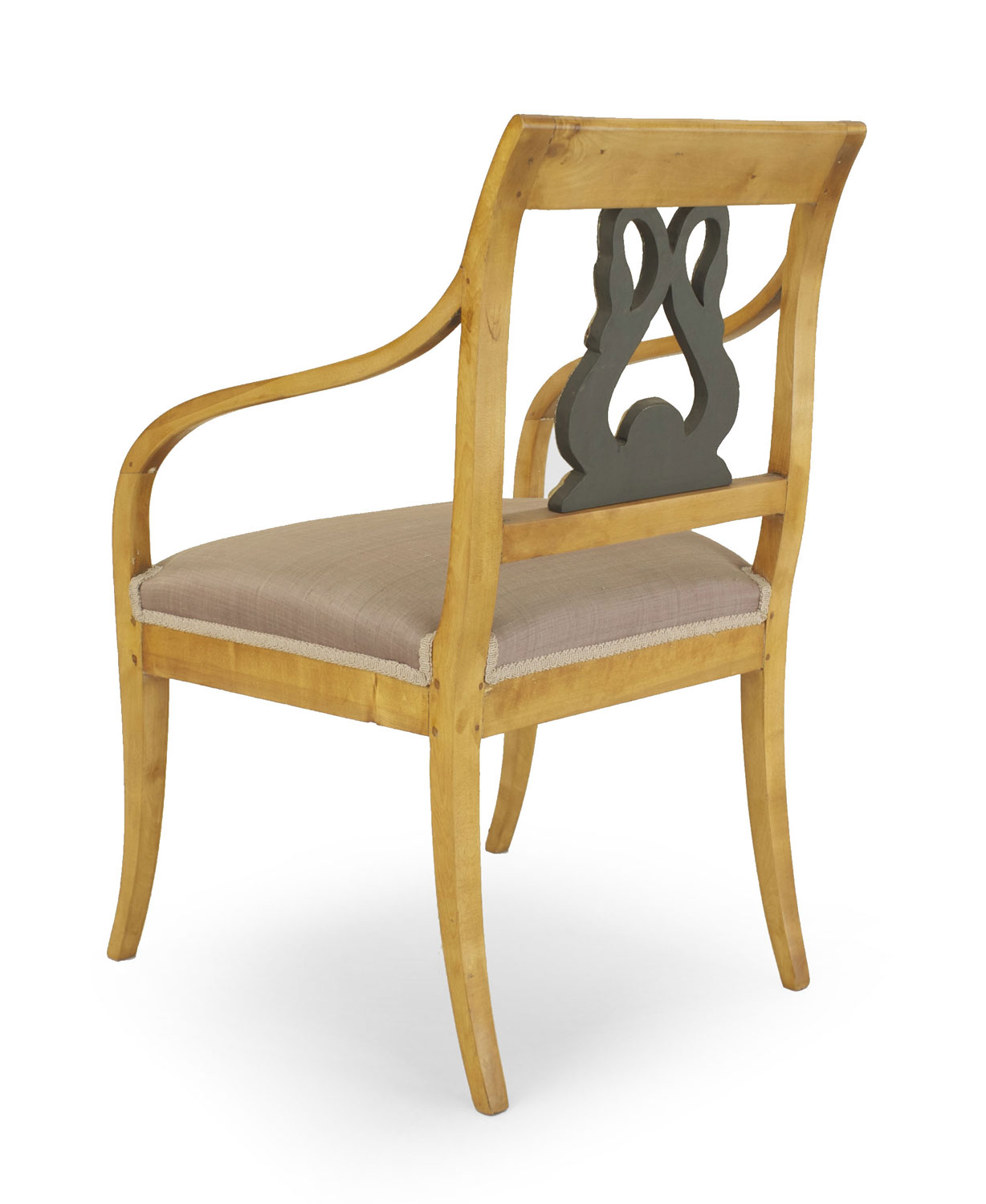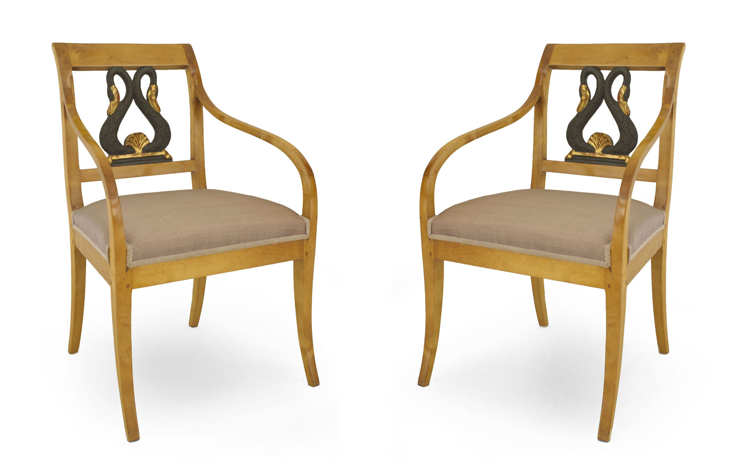 PAIR of Swedish Biedermeier birch open Armchairs with a green painted & parcel gilt double swan splat back and upholstered seat (19th Century)