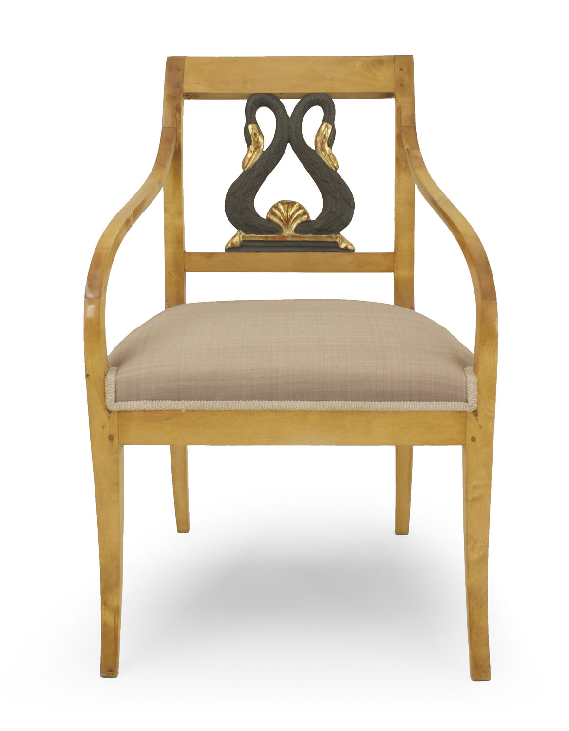 PAIR of Swedish Biedermeier birch open Armchairs with a green painted & parcel gilt double swan splat back and upholstered seat (19th Century).
