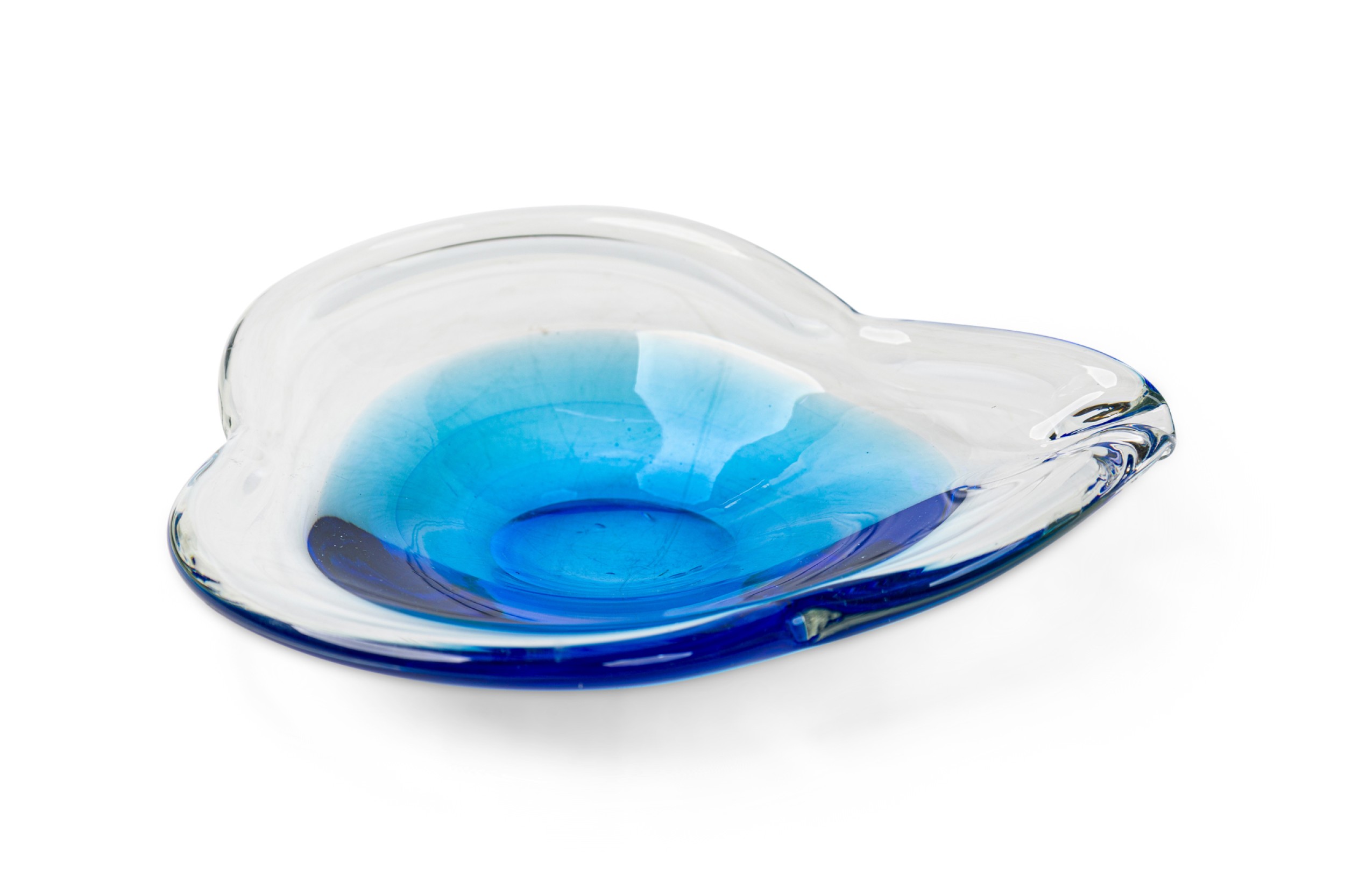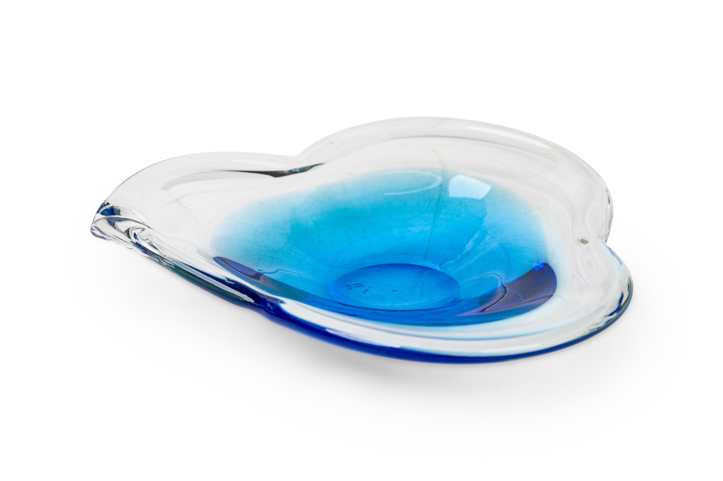 Swedish Mid-Century heart shaped clear and blue centered art glass ashtray with an elegantly carved cigarette holder on a round base