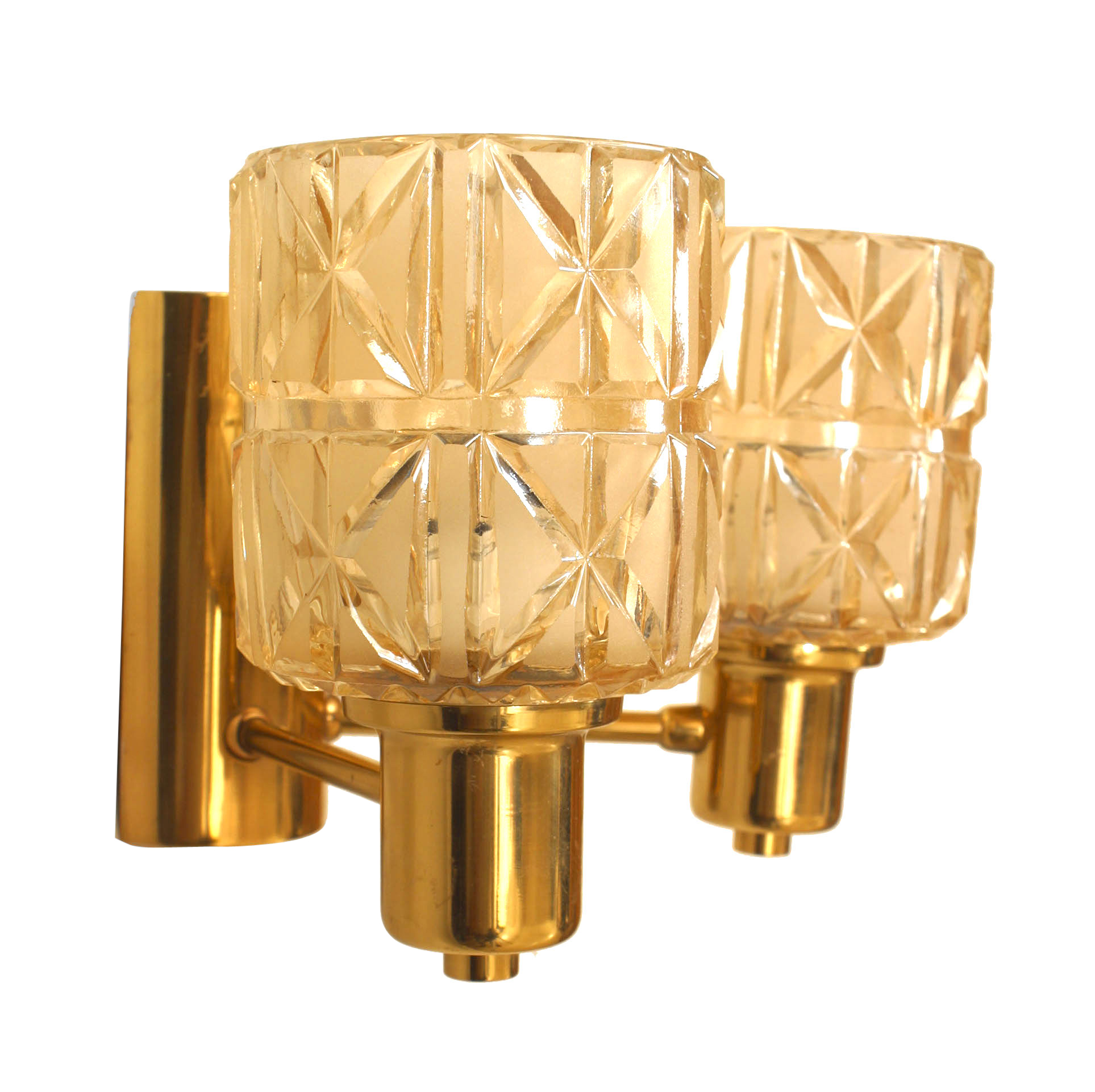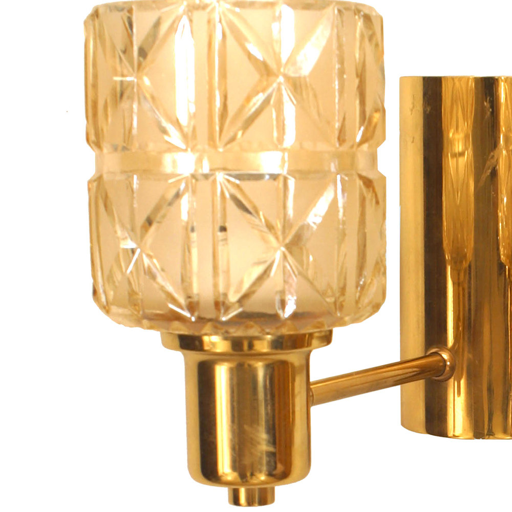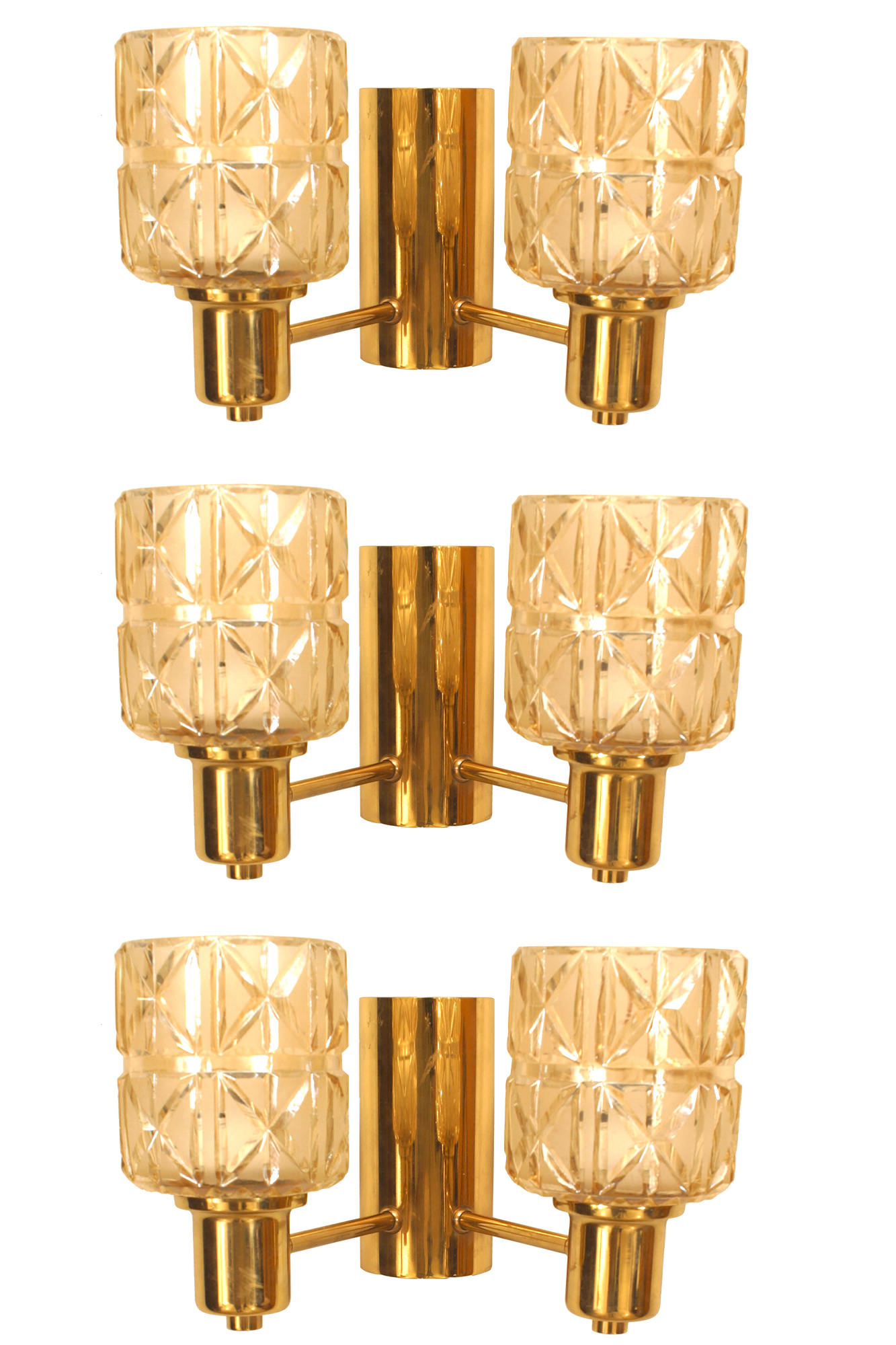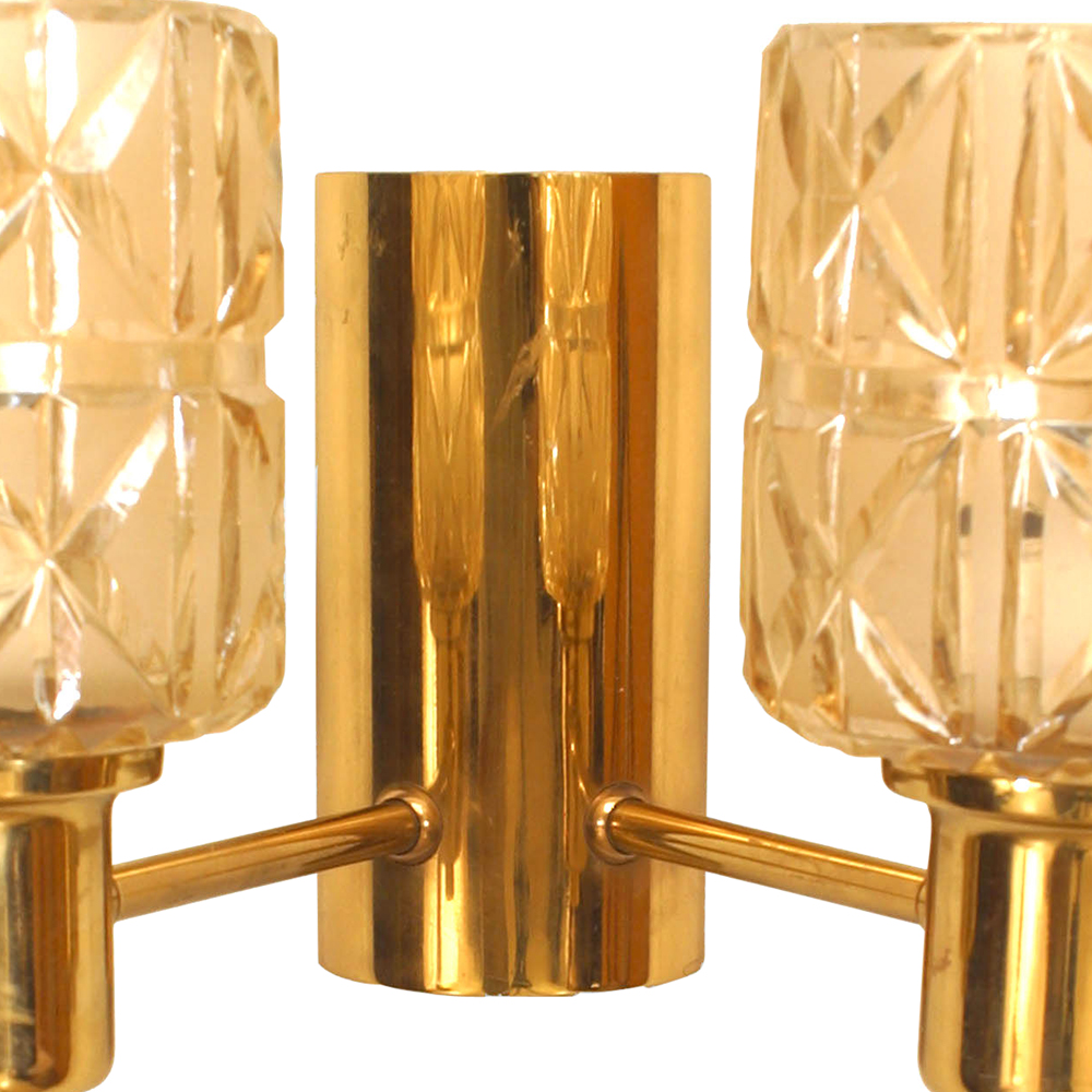 3 Swedish Mid-Century (1950s) brass wall sconces with two arms with two cut glass shades on either side. (attributed to HANS-AGNE JAKOBSSON) (PRICED EACH).