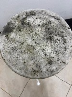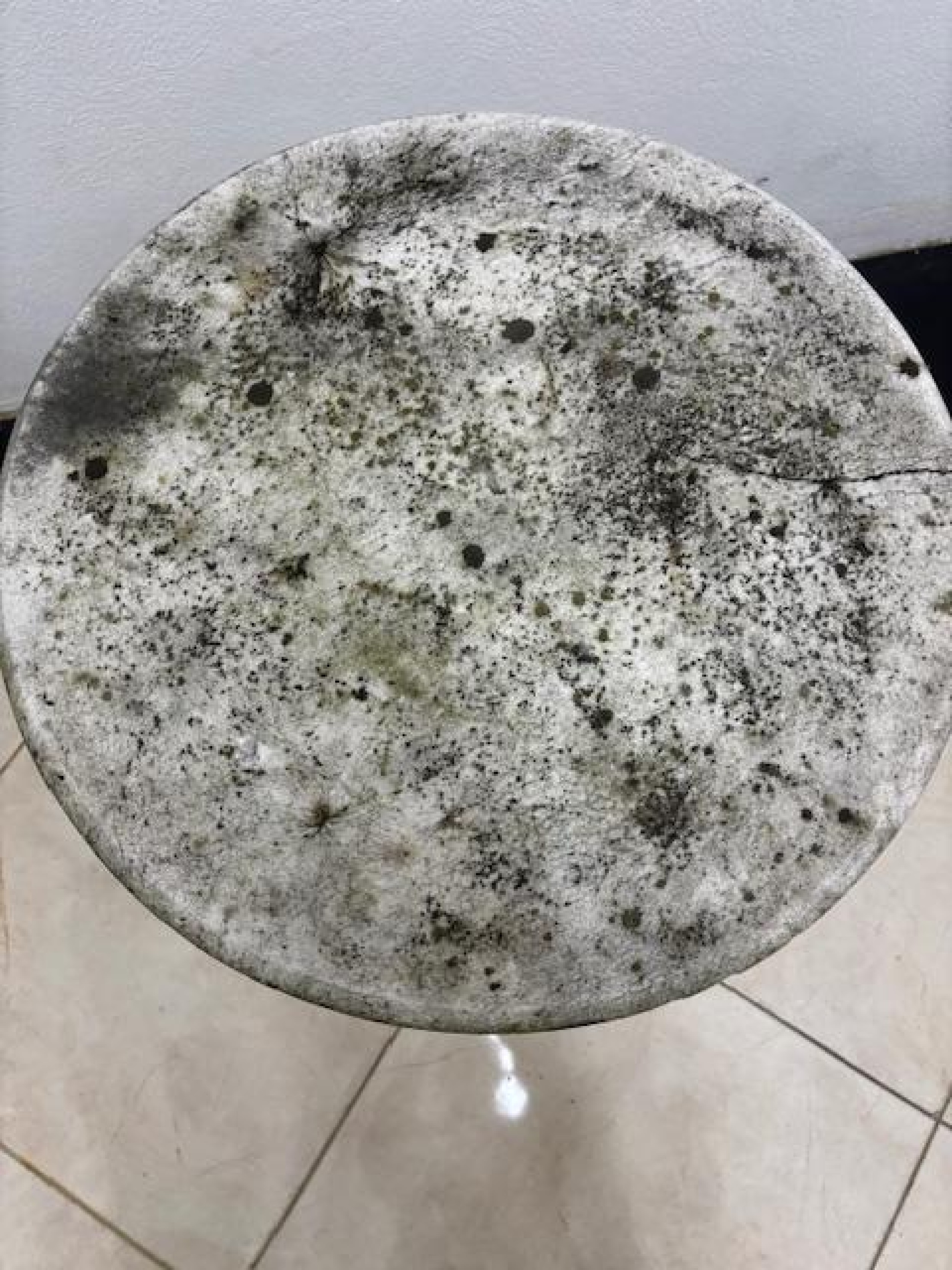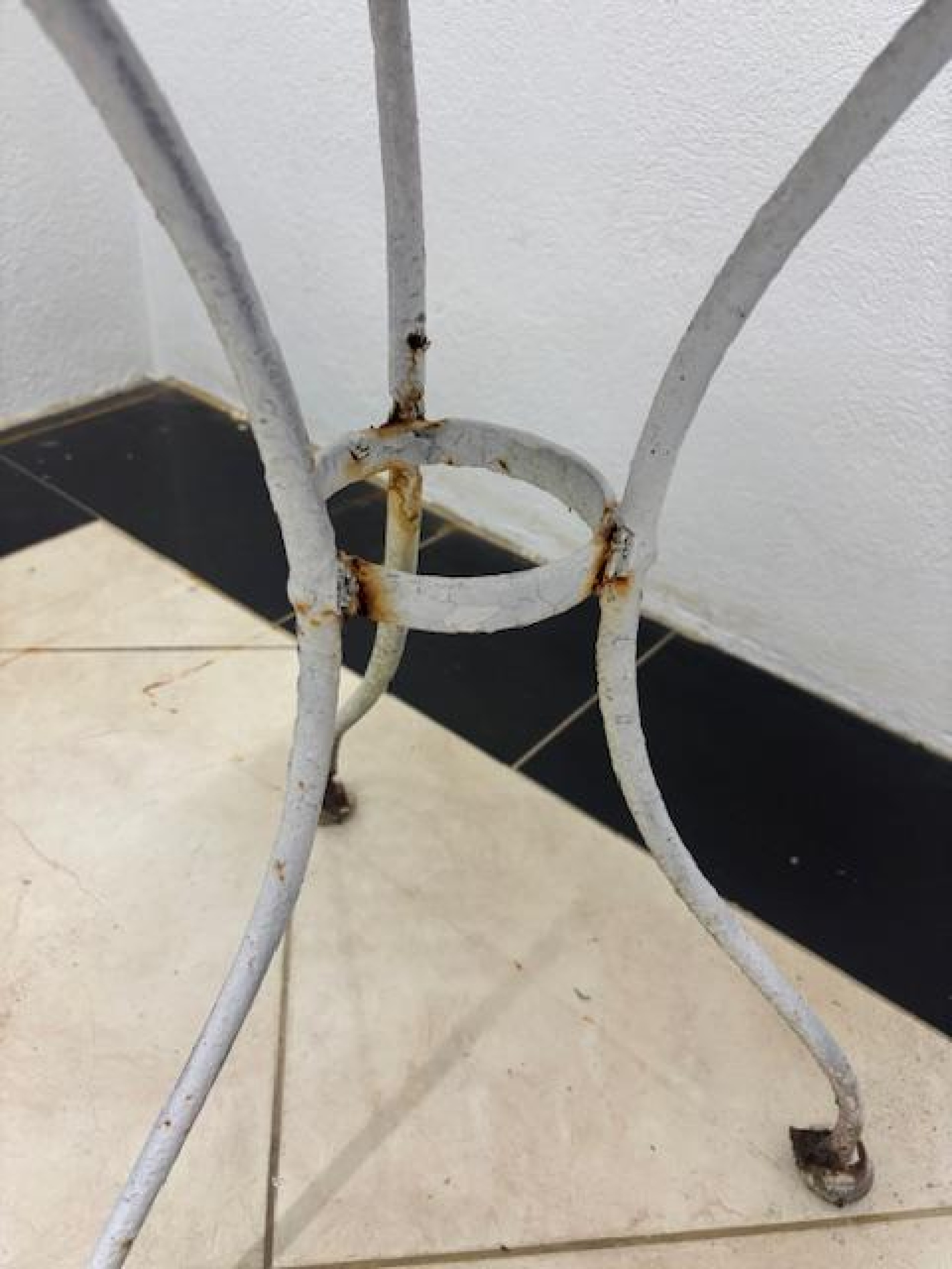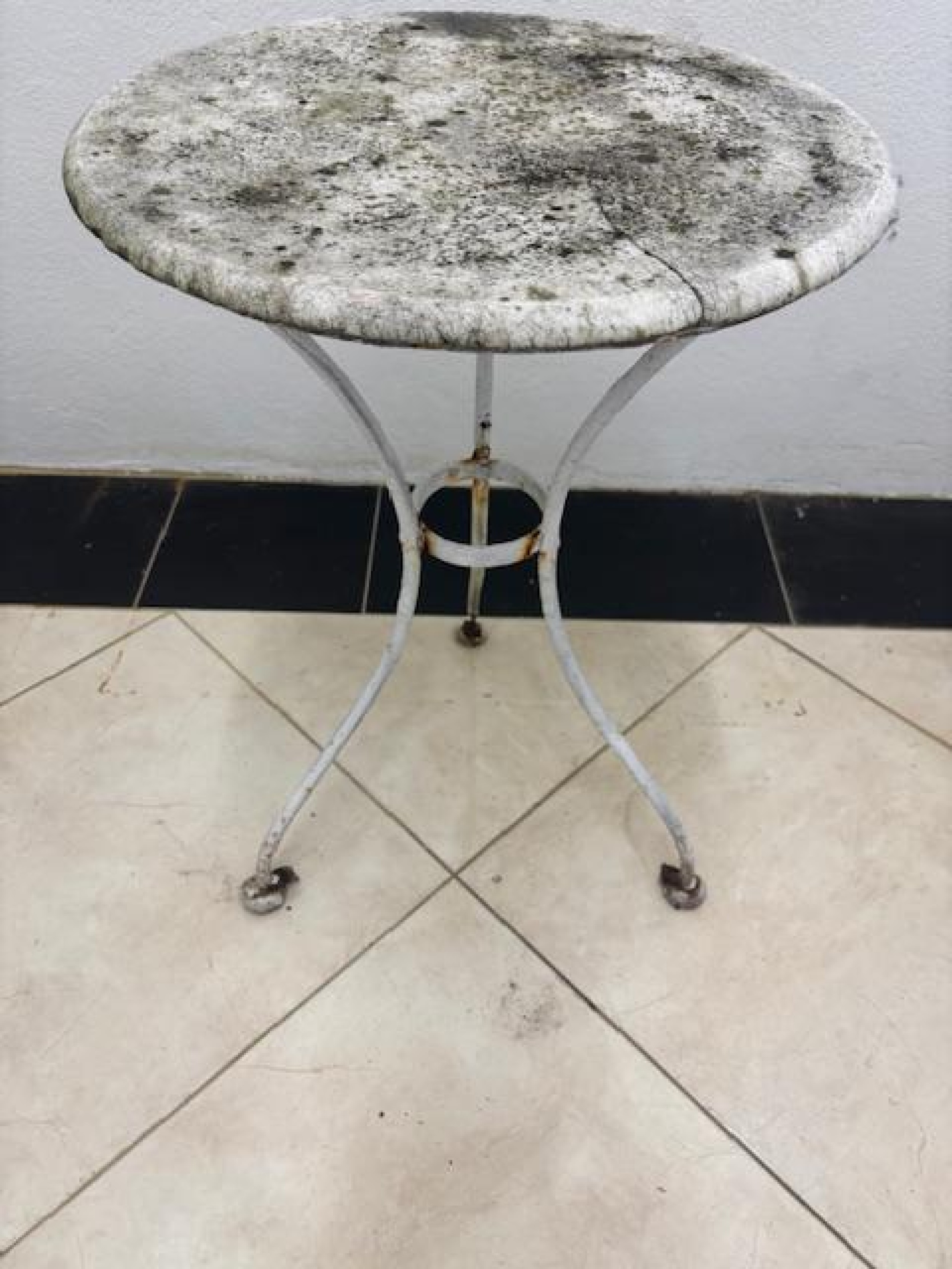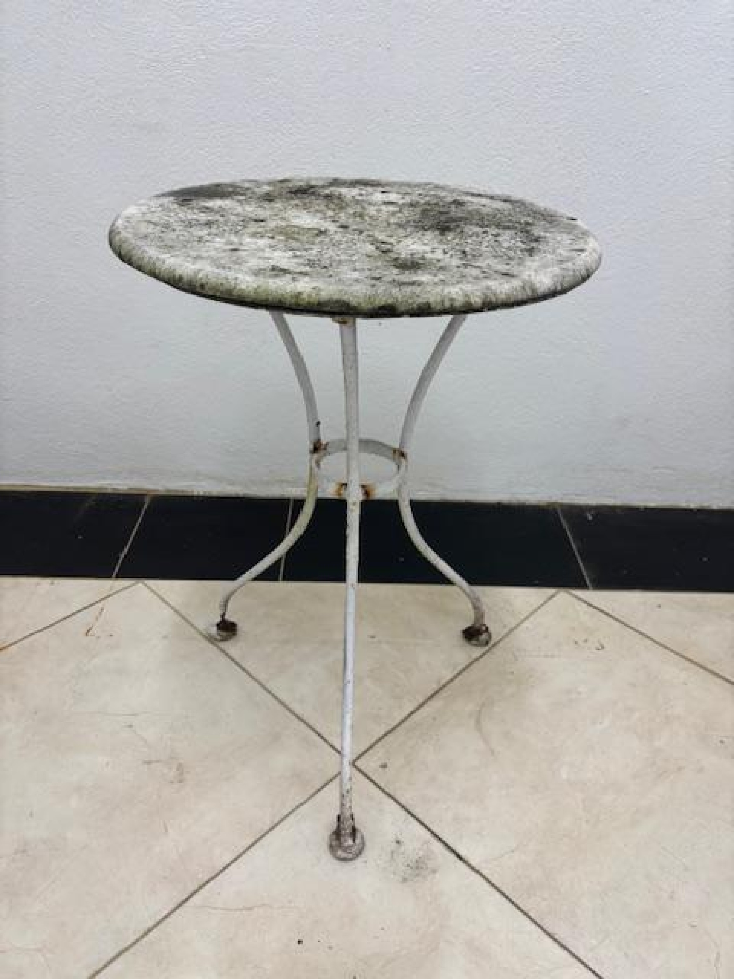 Outdoor French style painted iron 3 legged café table with stretcher and roiund (weathered) white marlbe top (20th Century)