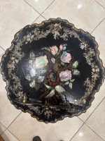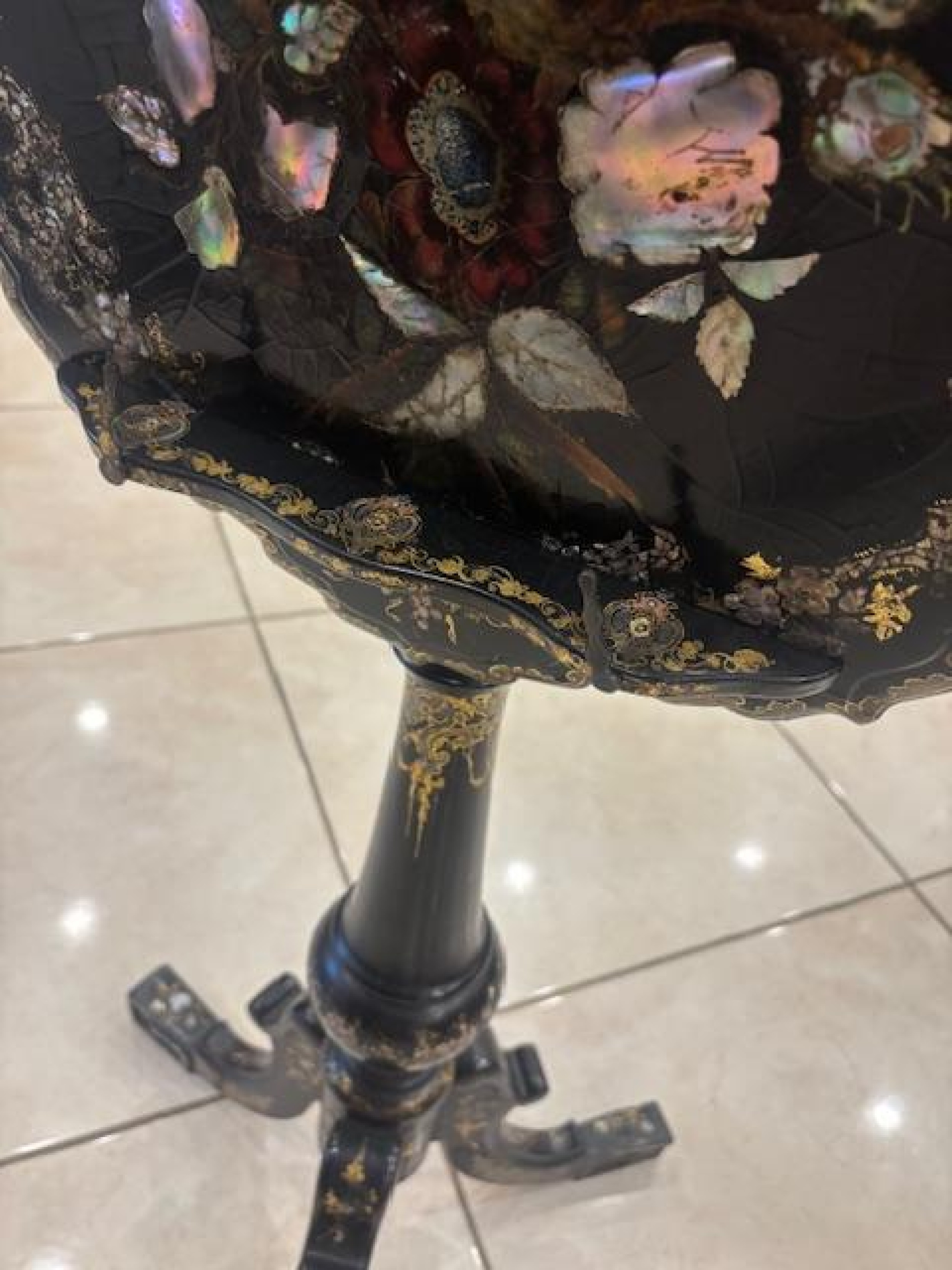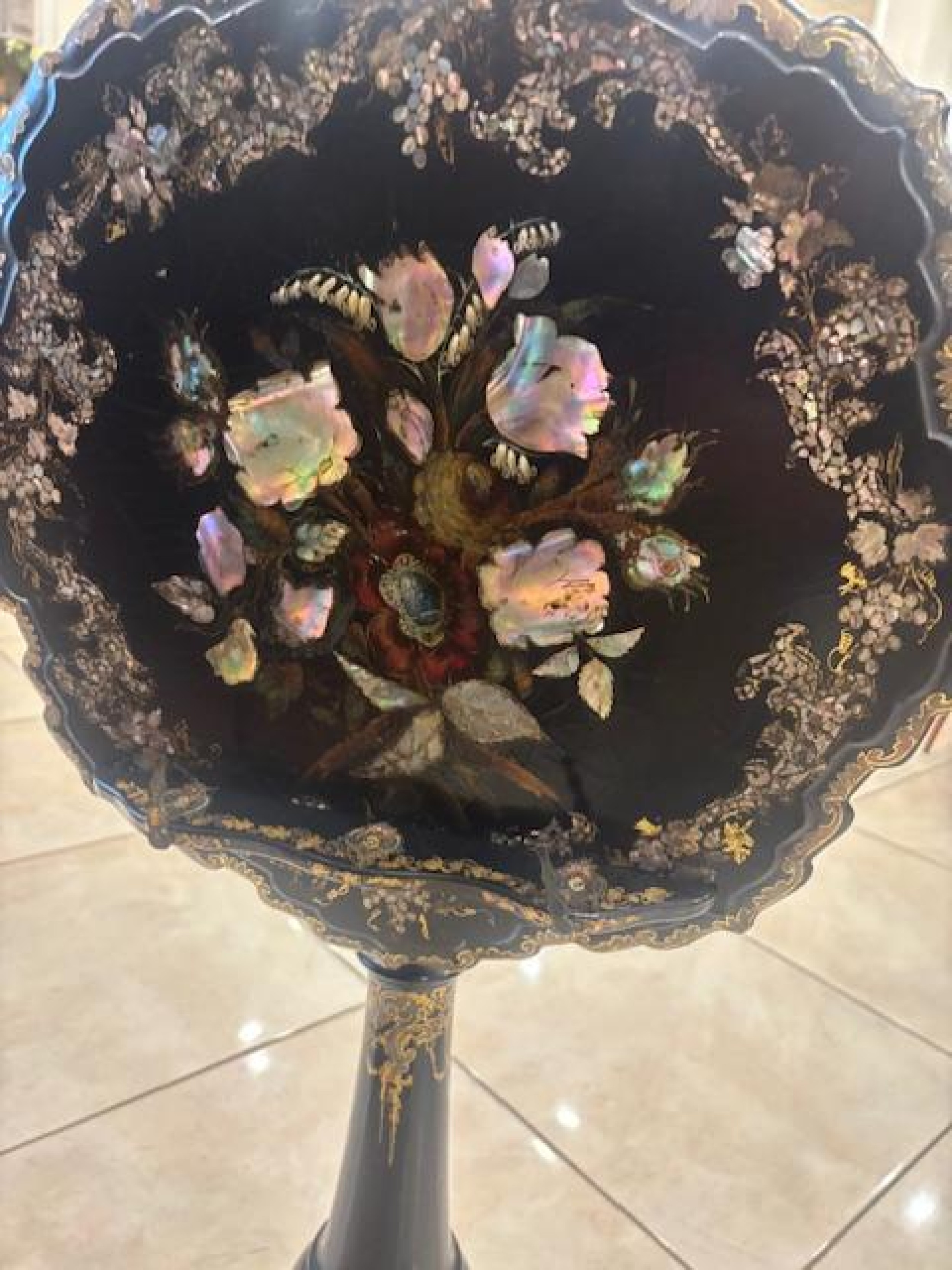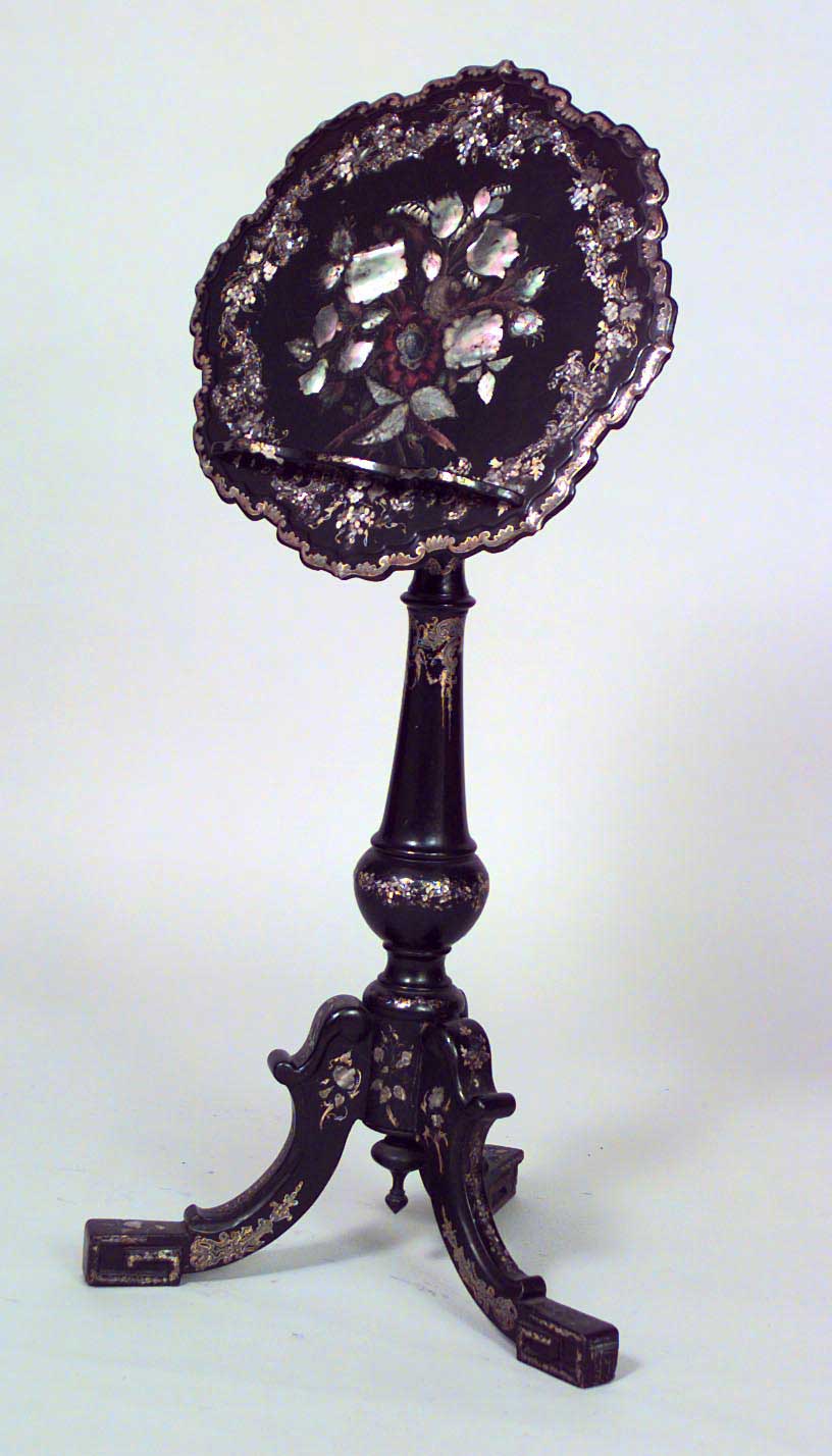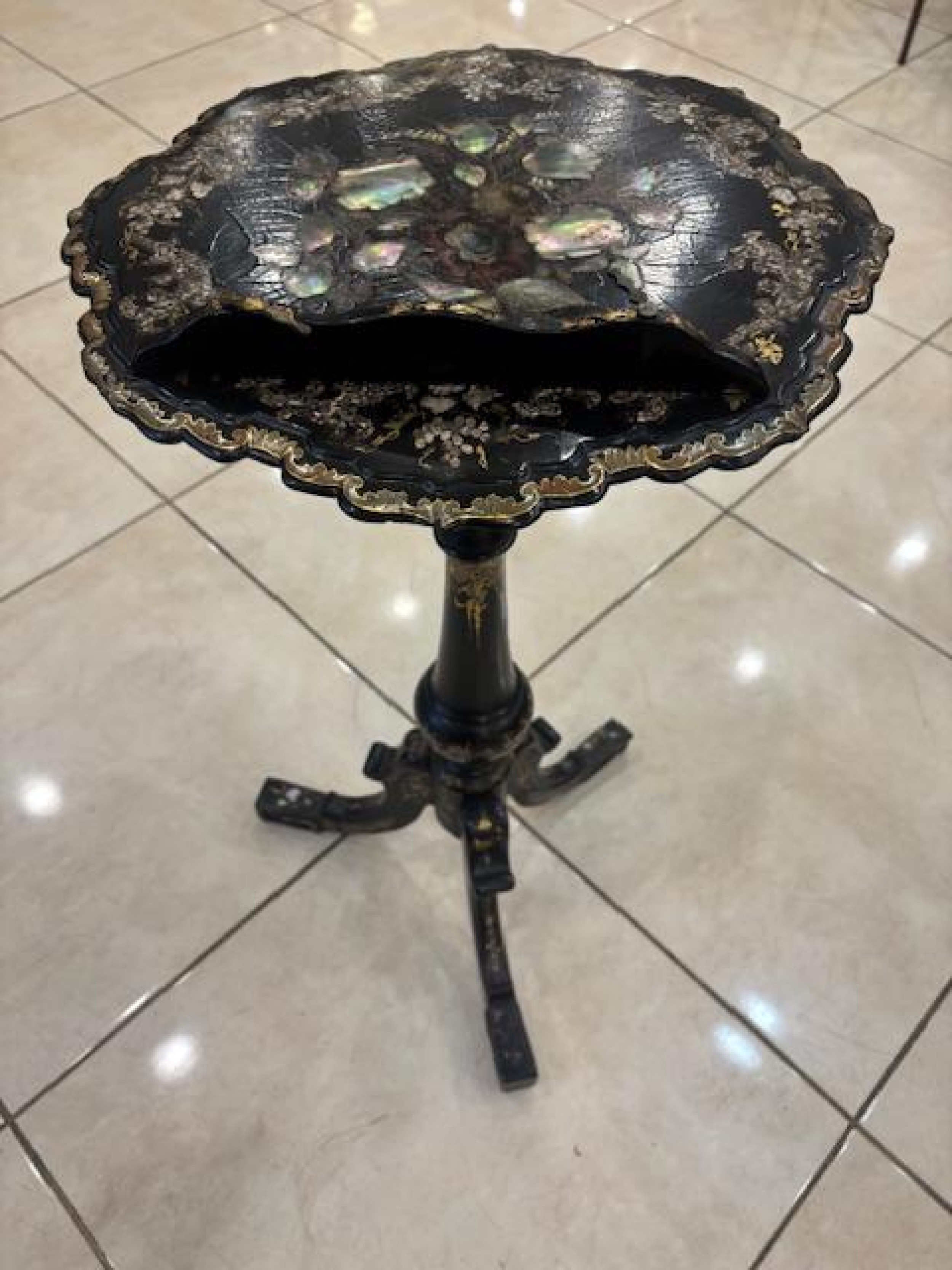 Style: English Materials & Techniques: Inlaid, lacquered, pearl, scalloped Category: Tables, Accessories/Décor/Bric-a-Brac