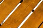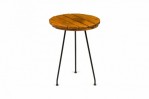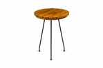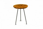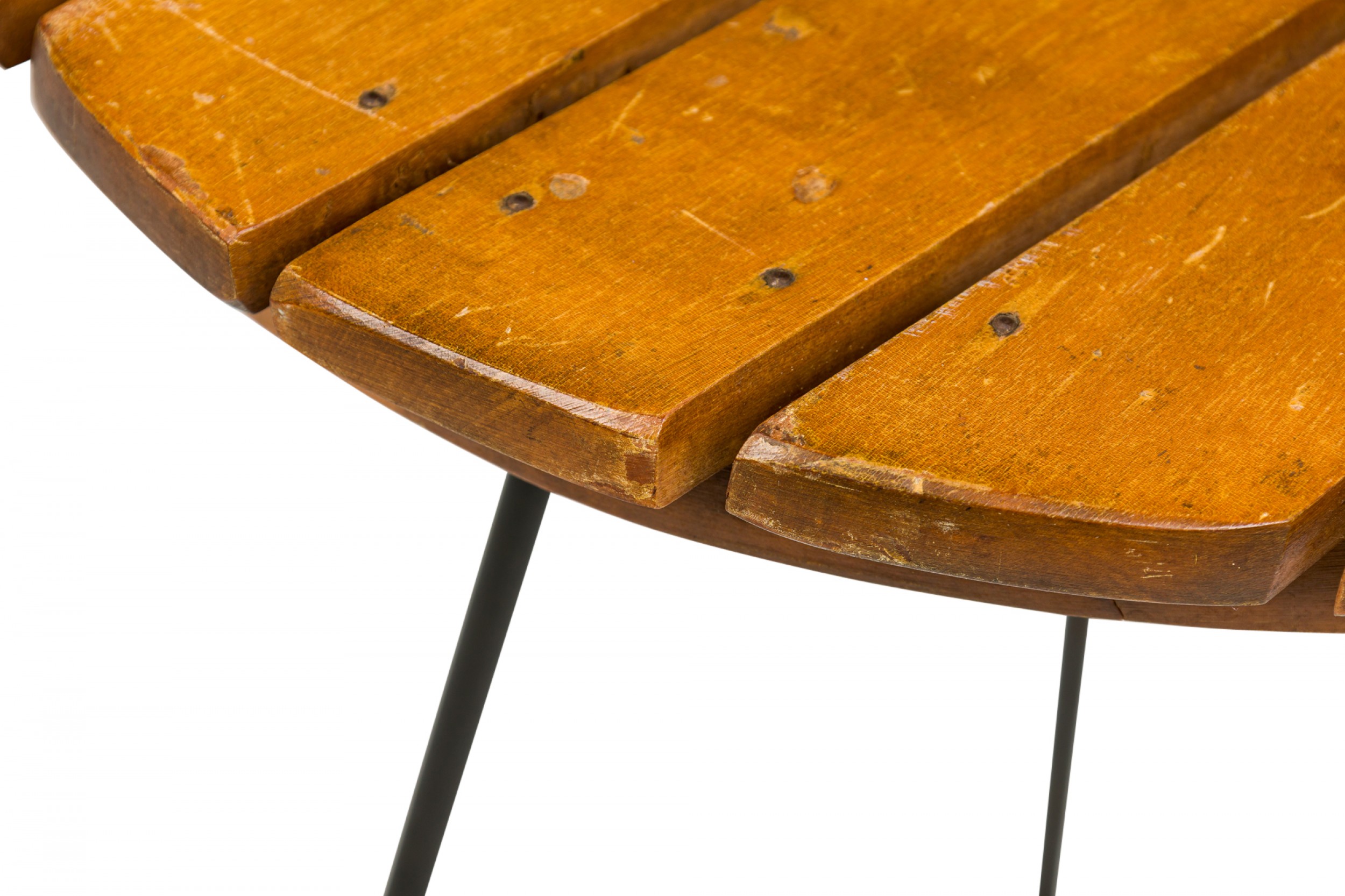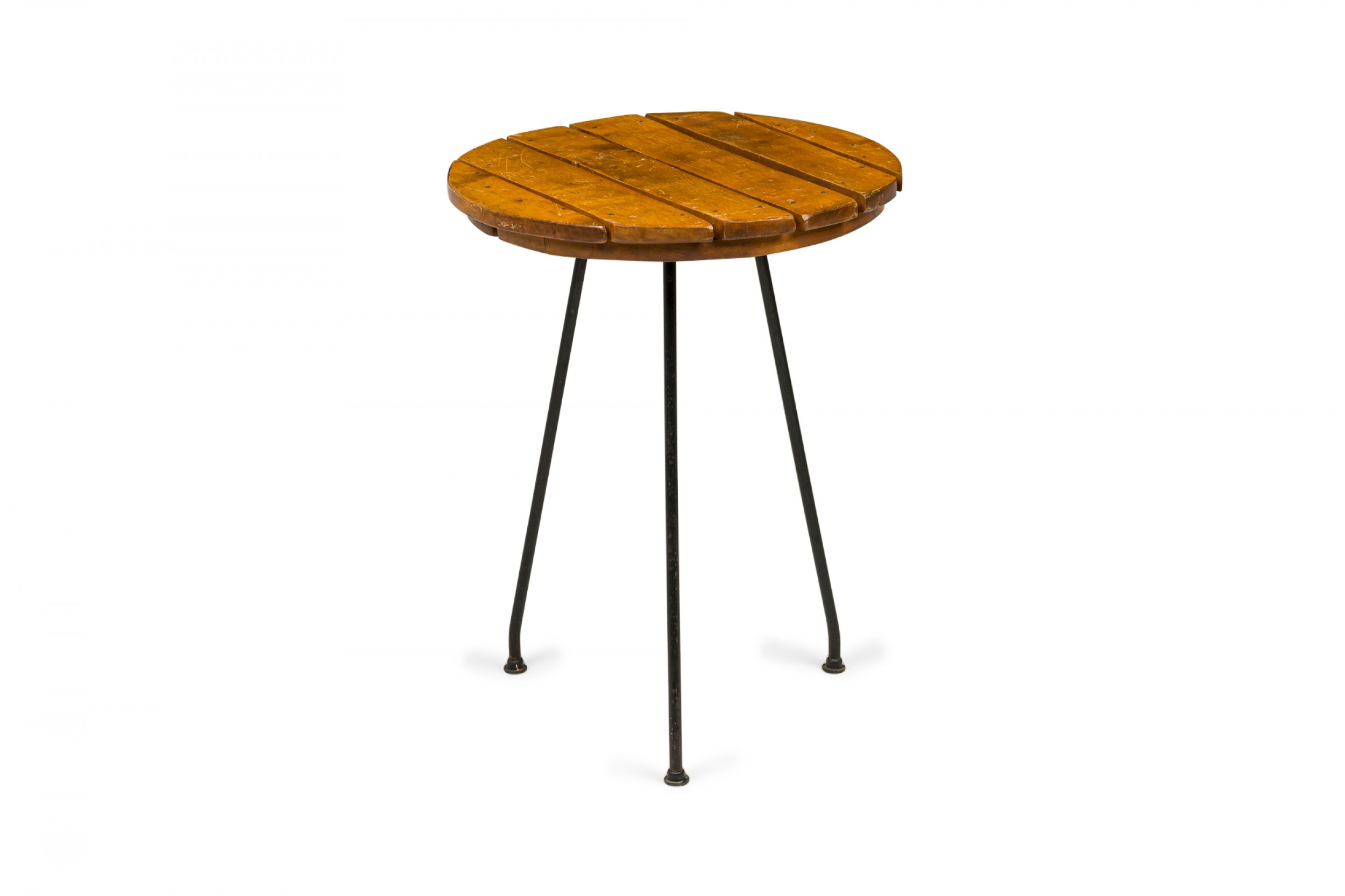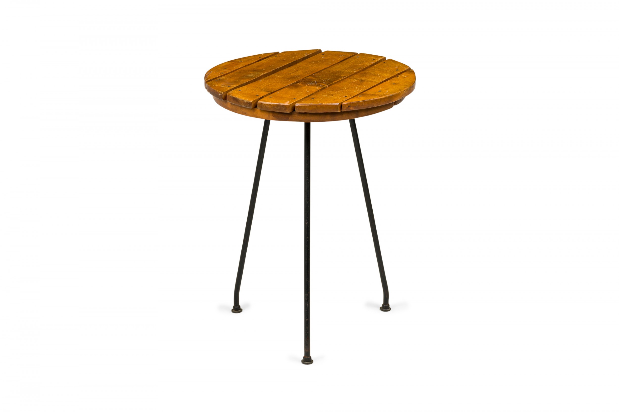 American Mid-Century circular end / side table with a wooden slat top resting on three angled black iron legs. (TONY PAUL)