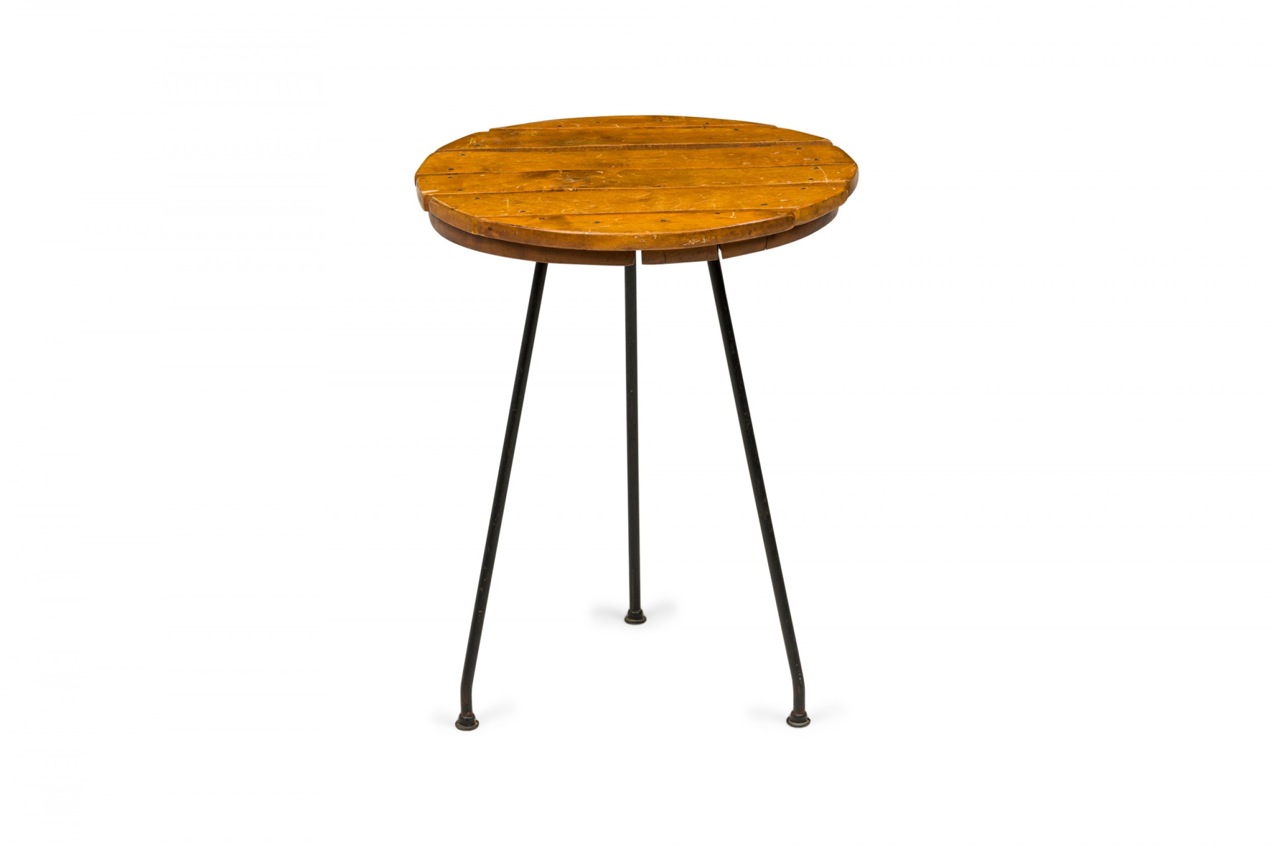 American Mid-Century circular end / side table with a wooden slat top resting on three angled black iron legs. (TONY PAUL).