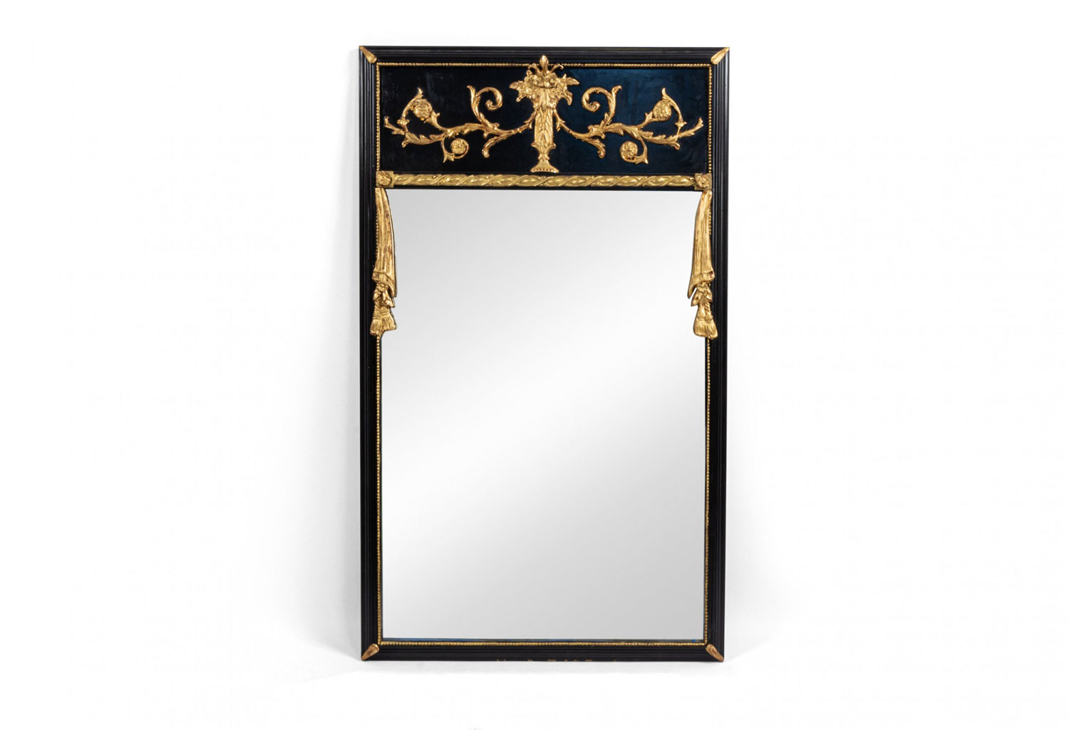 PAIR of Italian Neoclassic-style (20th Century) black lacquered vertical wall mirrors with carved gilt swag and scroll design with an inner gilt beaded trim. (PRICED AS PAIR).