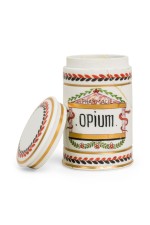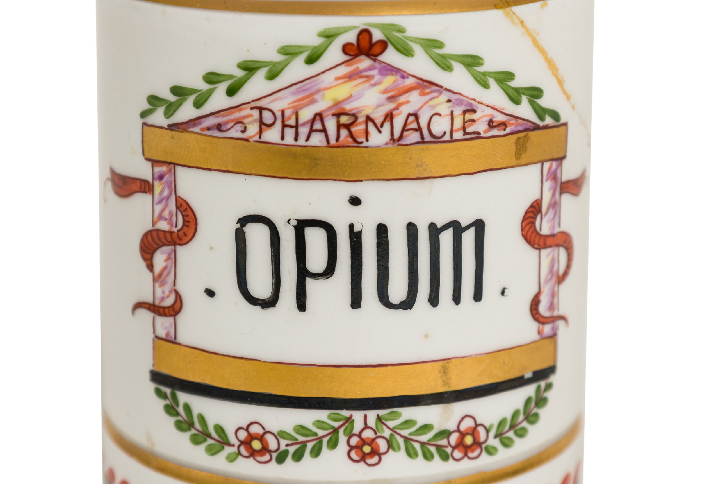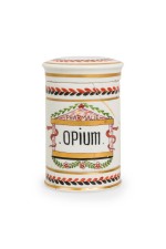 French Victorian gilt trimmed and hand painted apothecary ceramic jar labelled "PHARMACIE" and "OPIUM" in an arch detail with snakes coiled around the pillars adorned with floral and wreath details (AS IS).