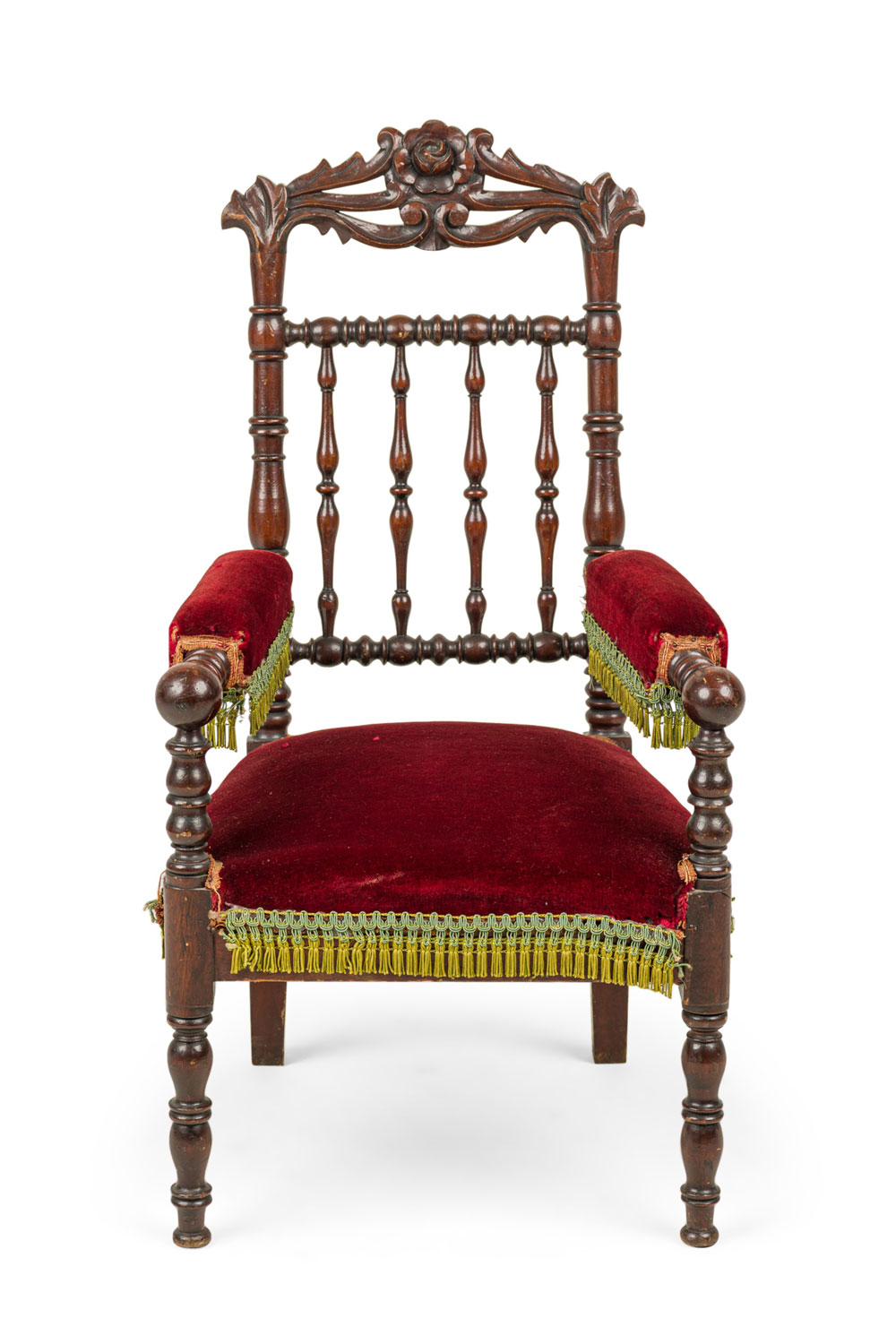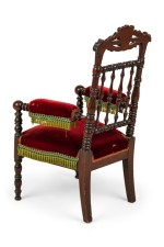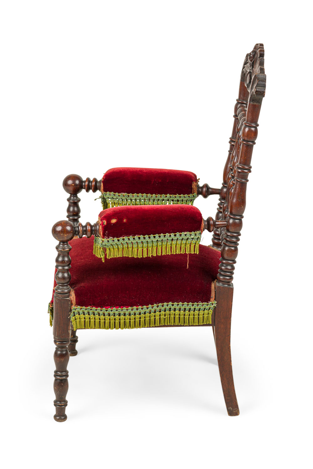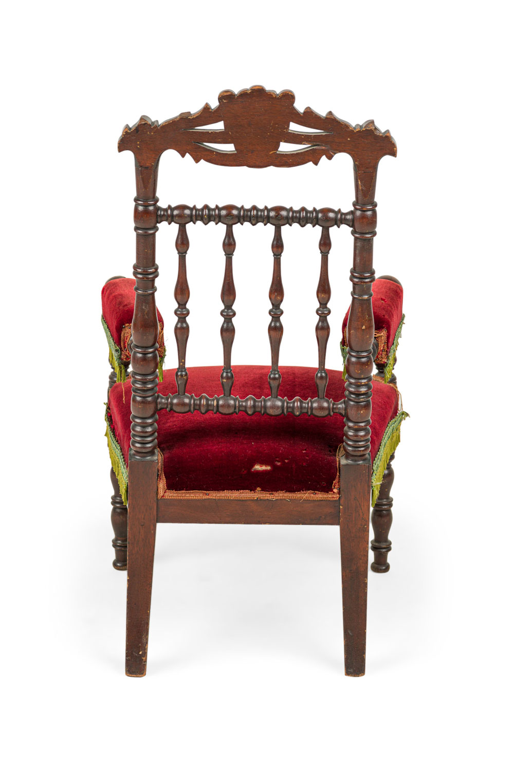English Victorian mahogany spindle back child's arm chair with red velvet seat.