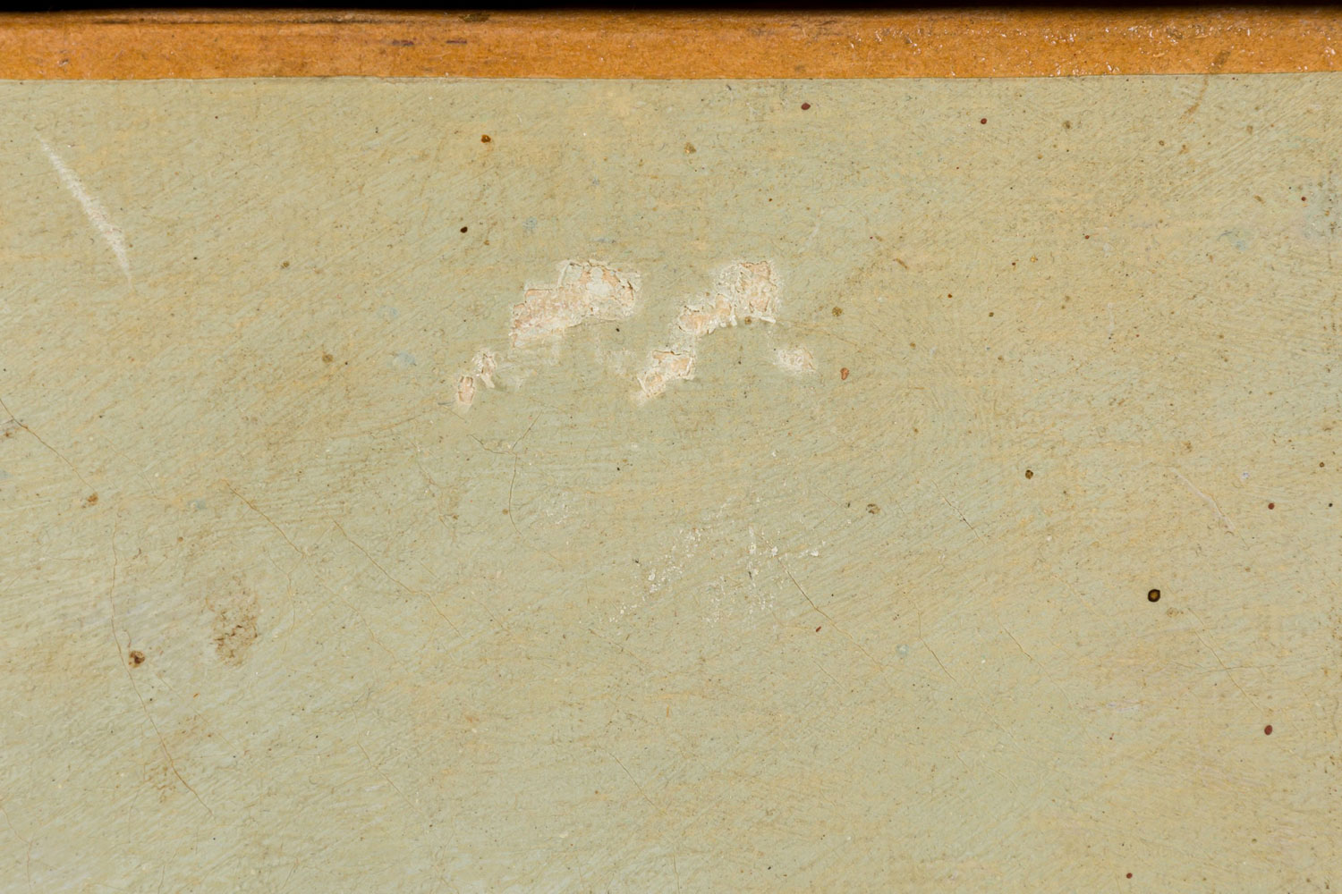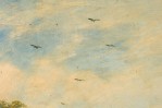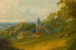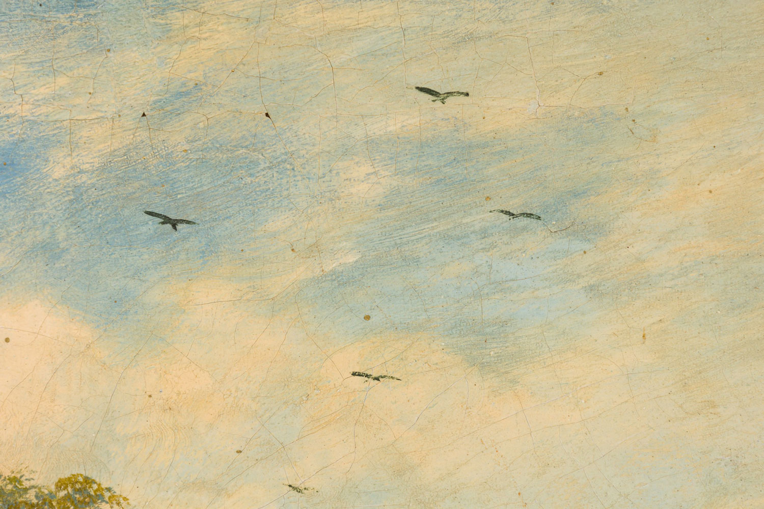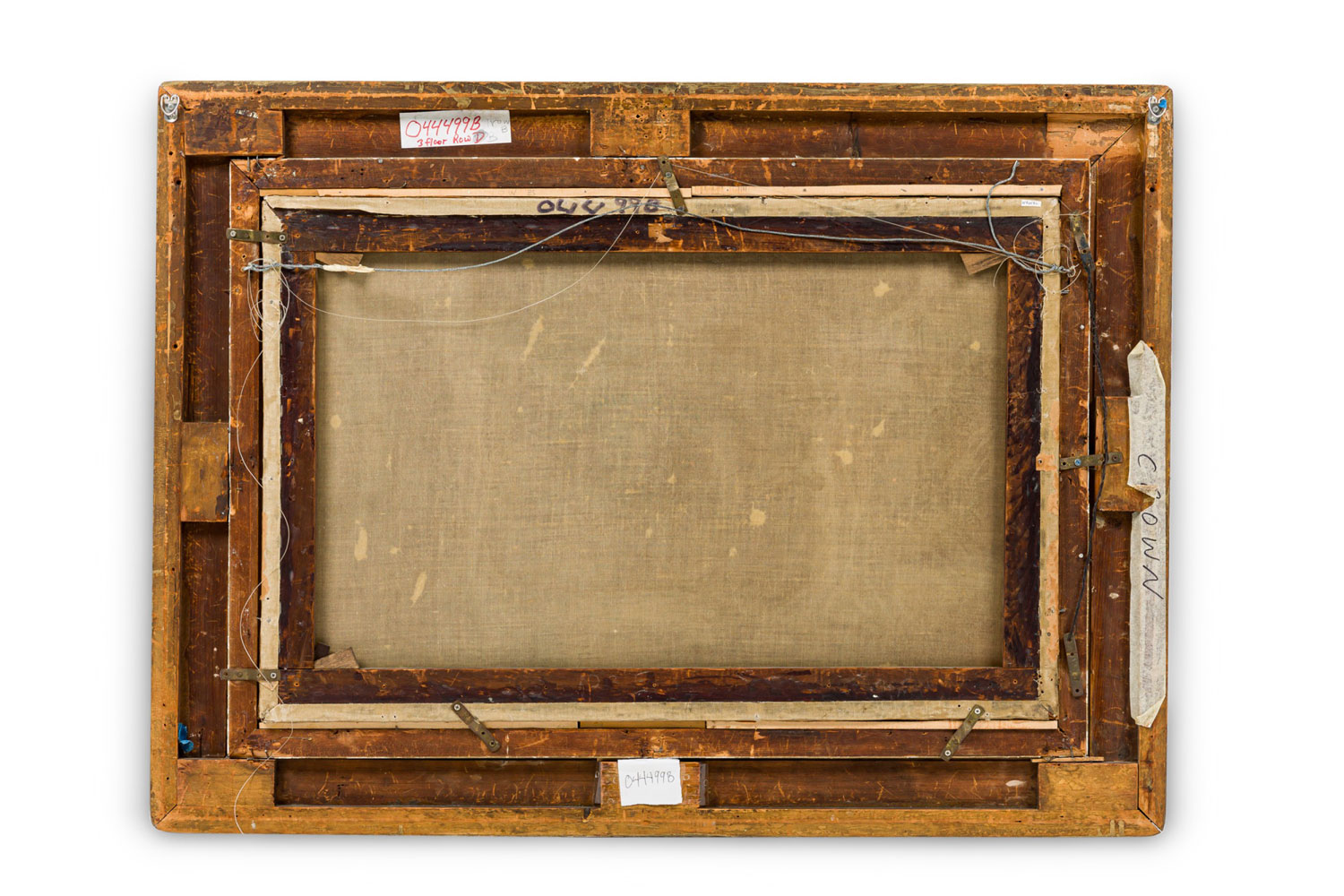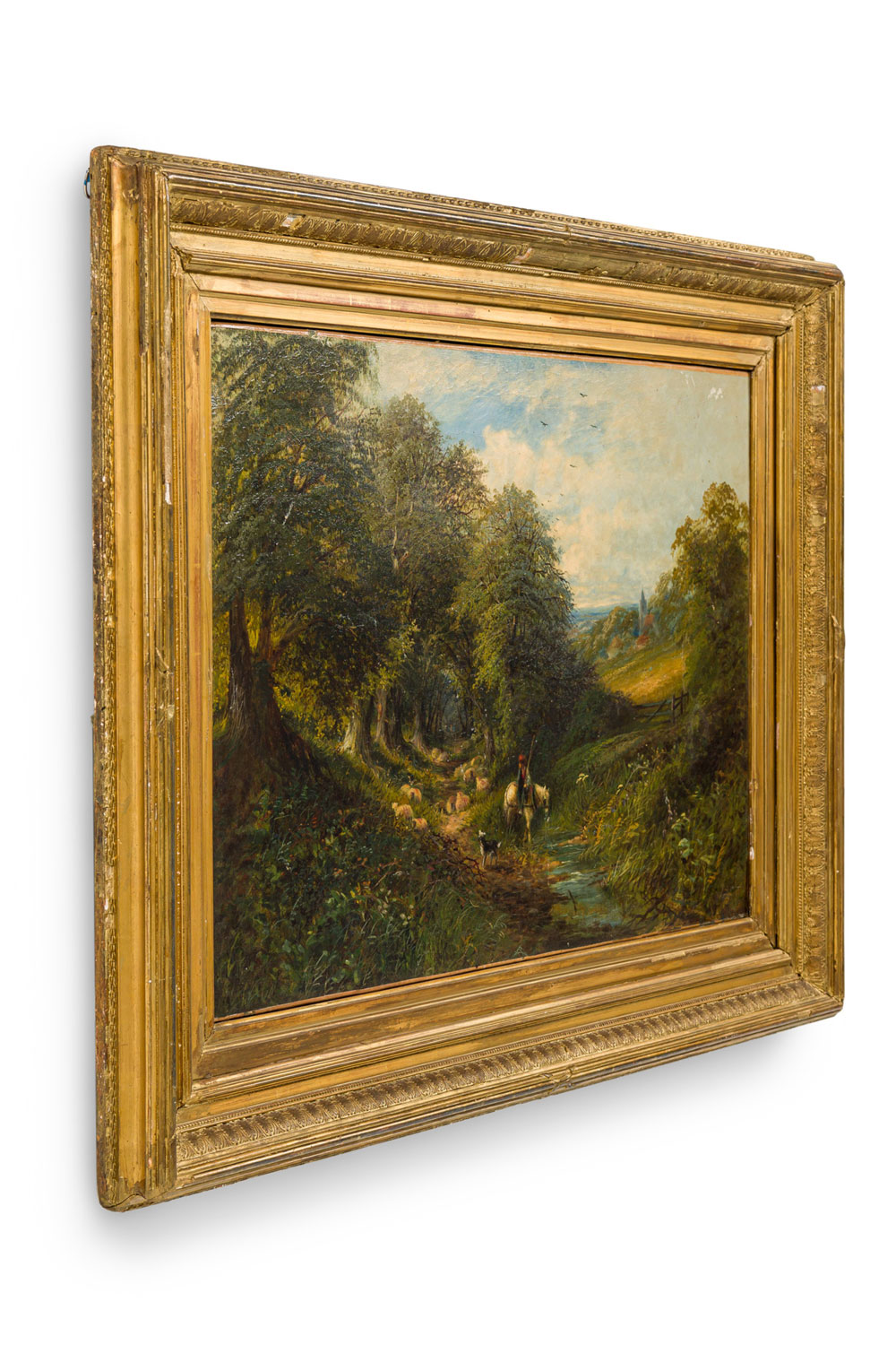 English Victorian style gilt framed oil painting of man on white horse with dog by creek.