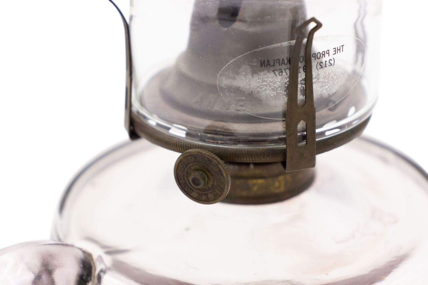 Vintage glass oil lamp with brown tinted glass oil font, hurricane chimney shade, and glass handle.