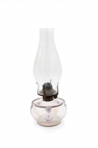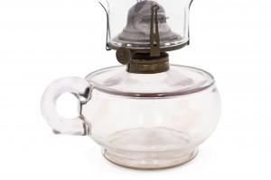 Vintage glass oil lamp with brown tinted glass oil font, hurricane chimney shade, and glass handle..