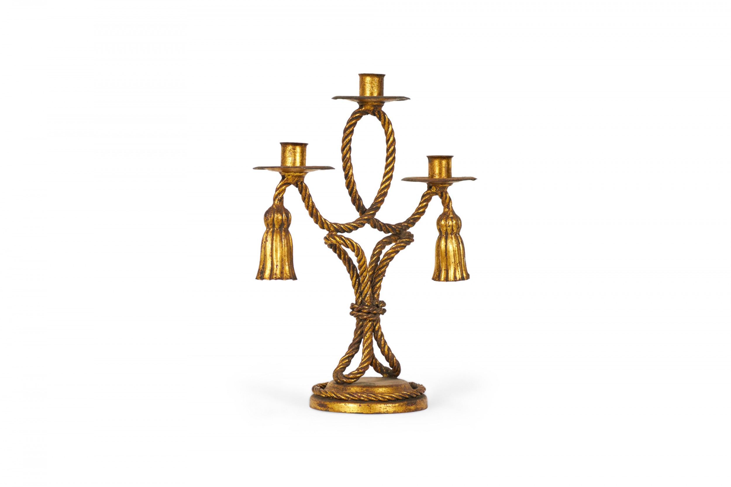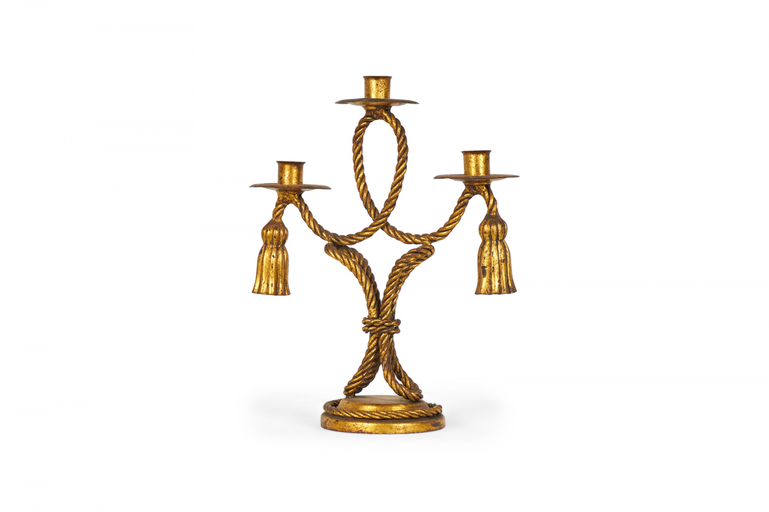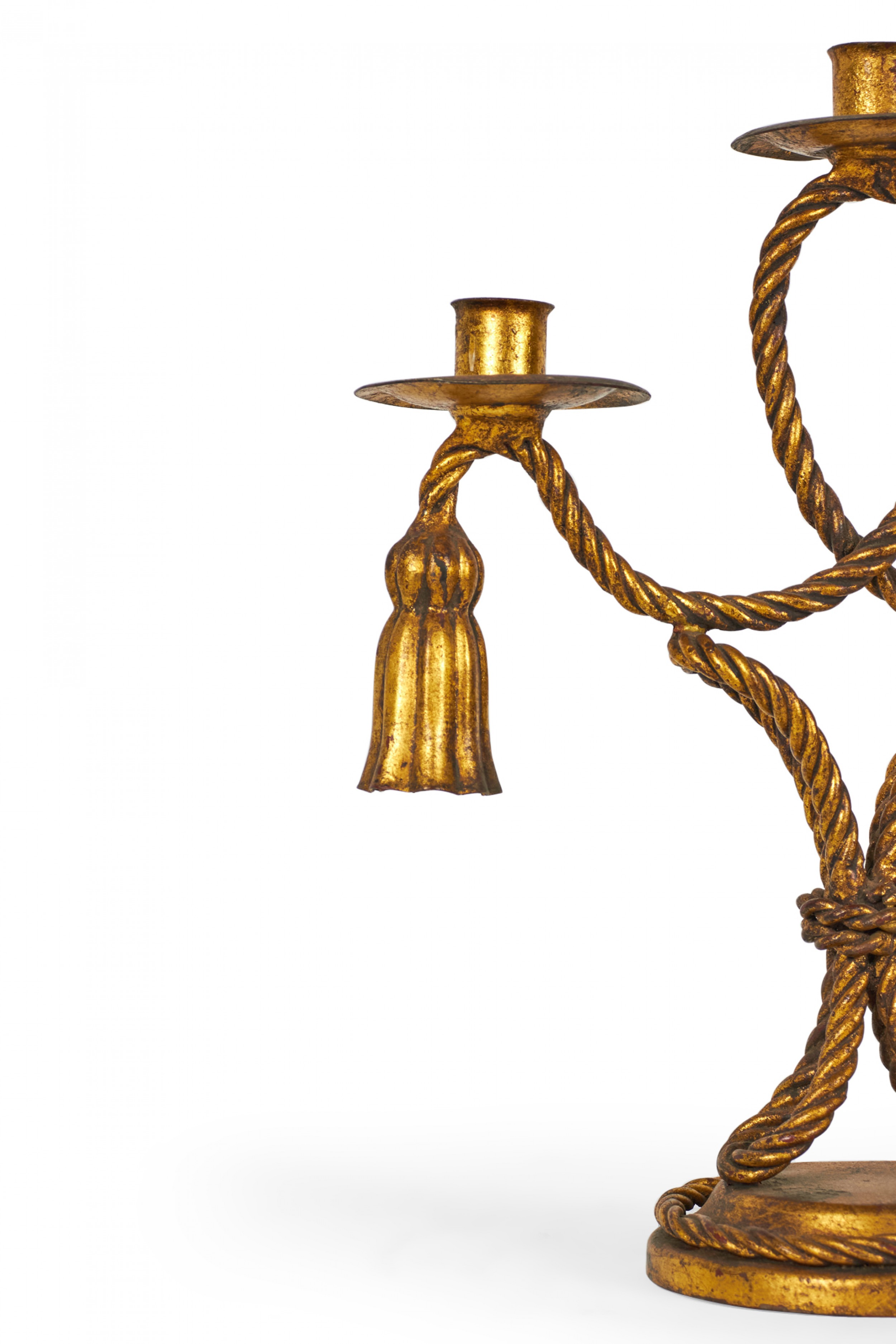 PAIR of Mid-Century Rope and Tassel (20th Century) gilt metal triple arm candelabras on round bases (PRICED AS PAIR)
