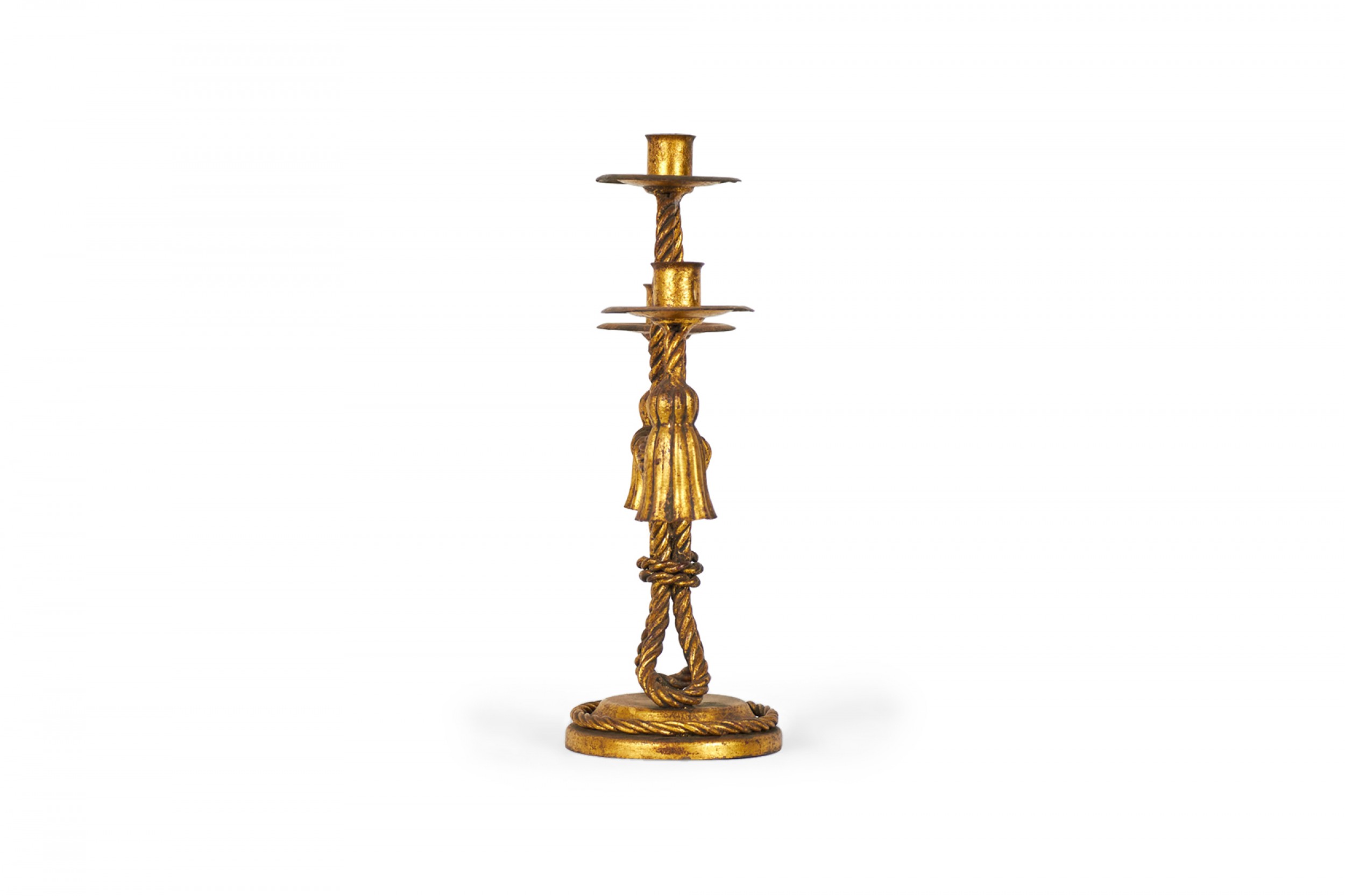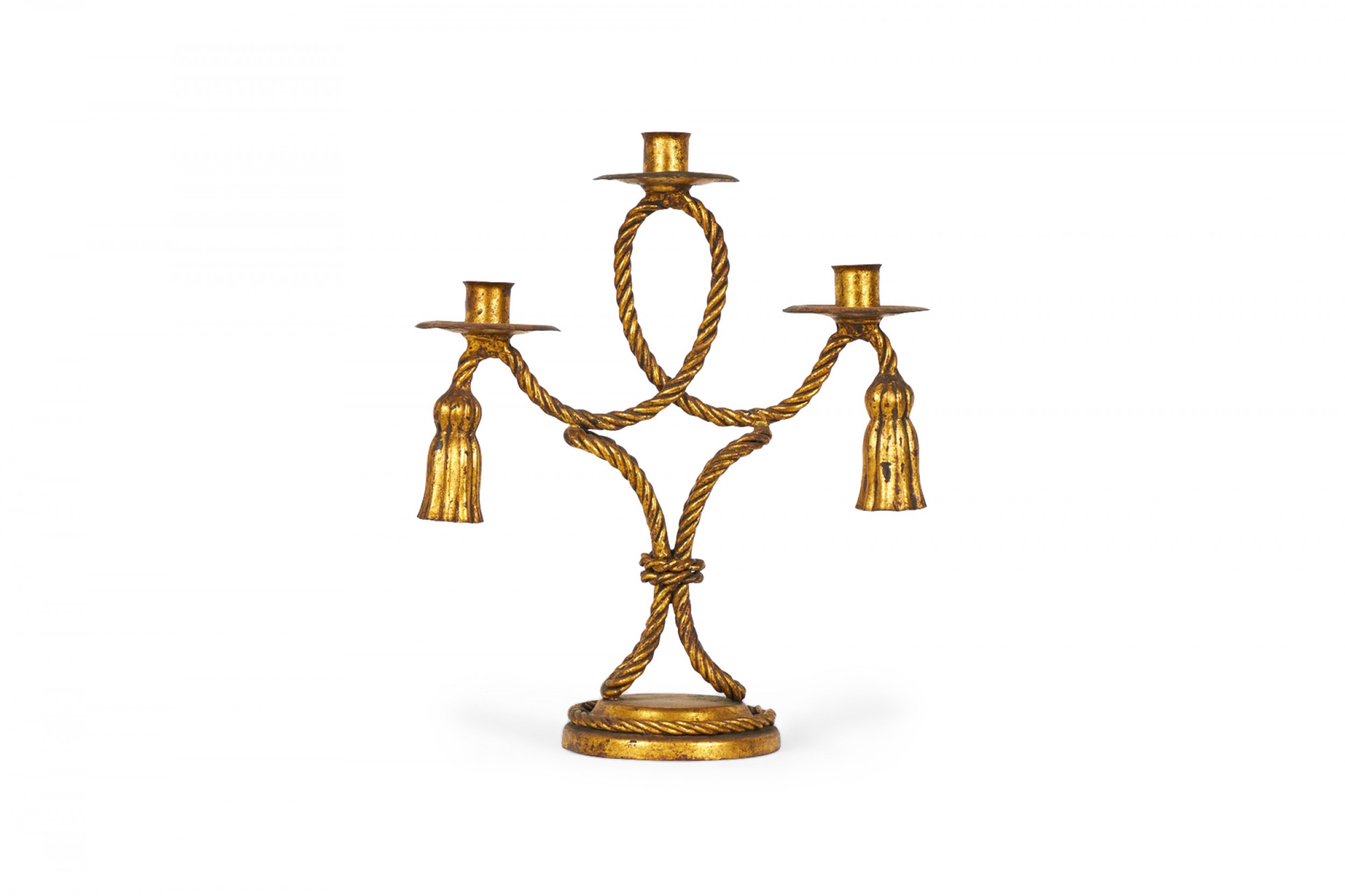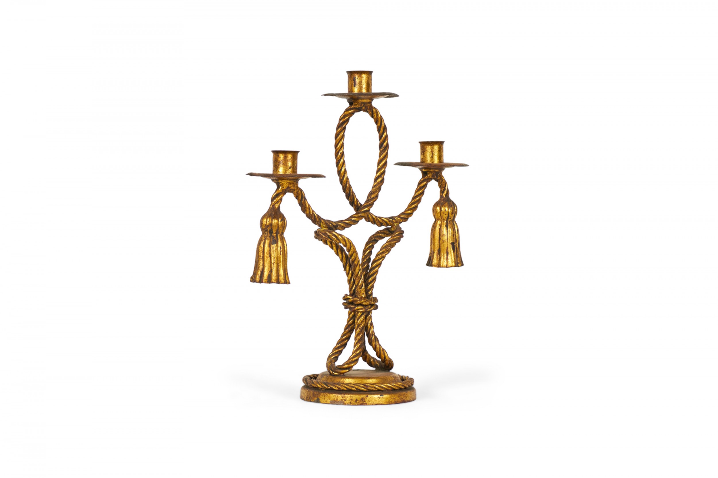 PAIR of Mid-Century Rope and Tassel (20th Century) gilt metal triple arm candelabras on round bases (PRICED AS PAIR)
