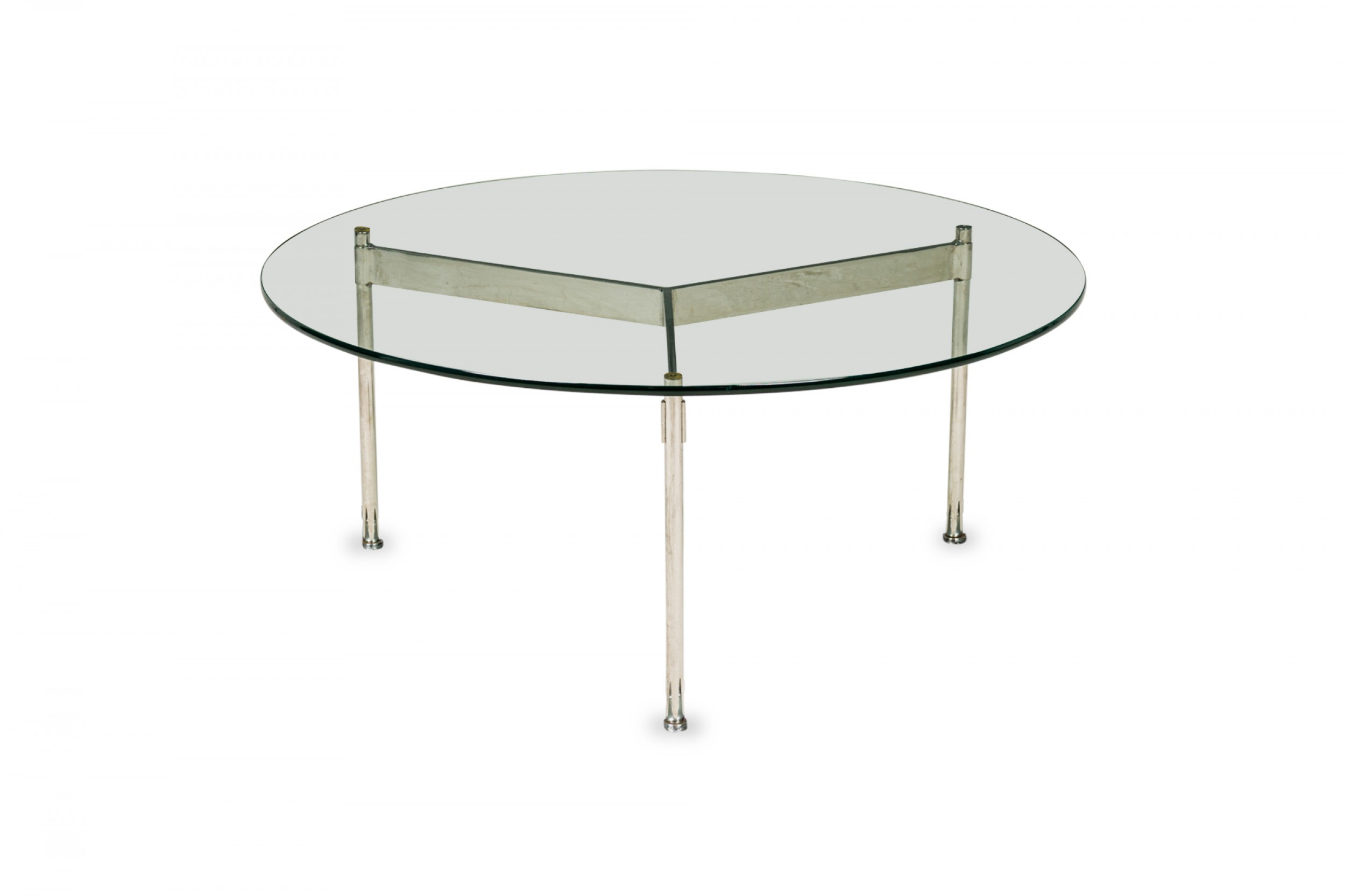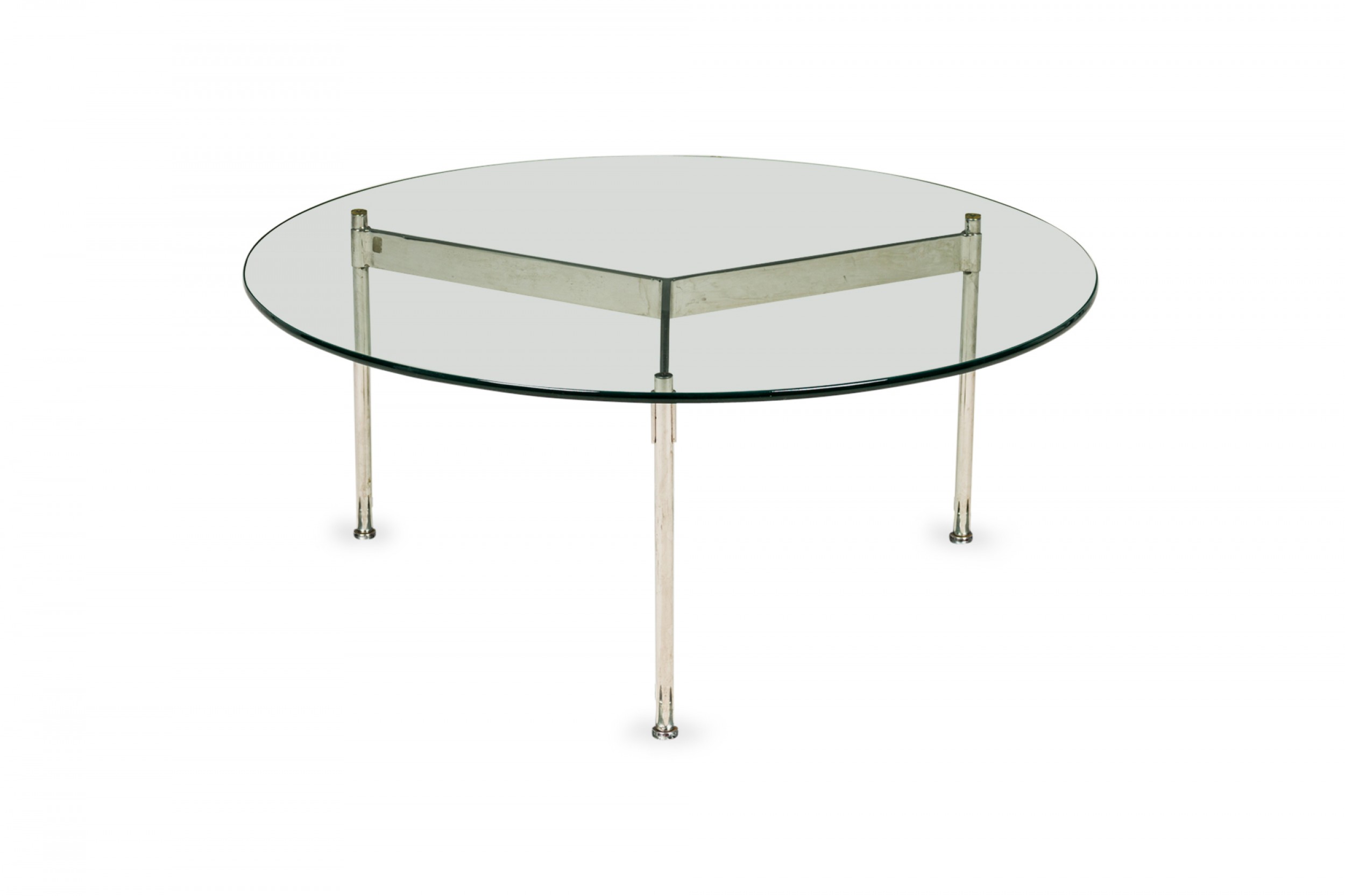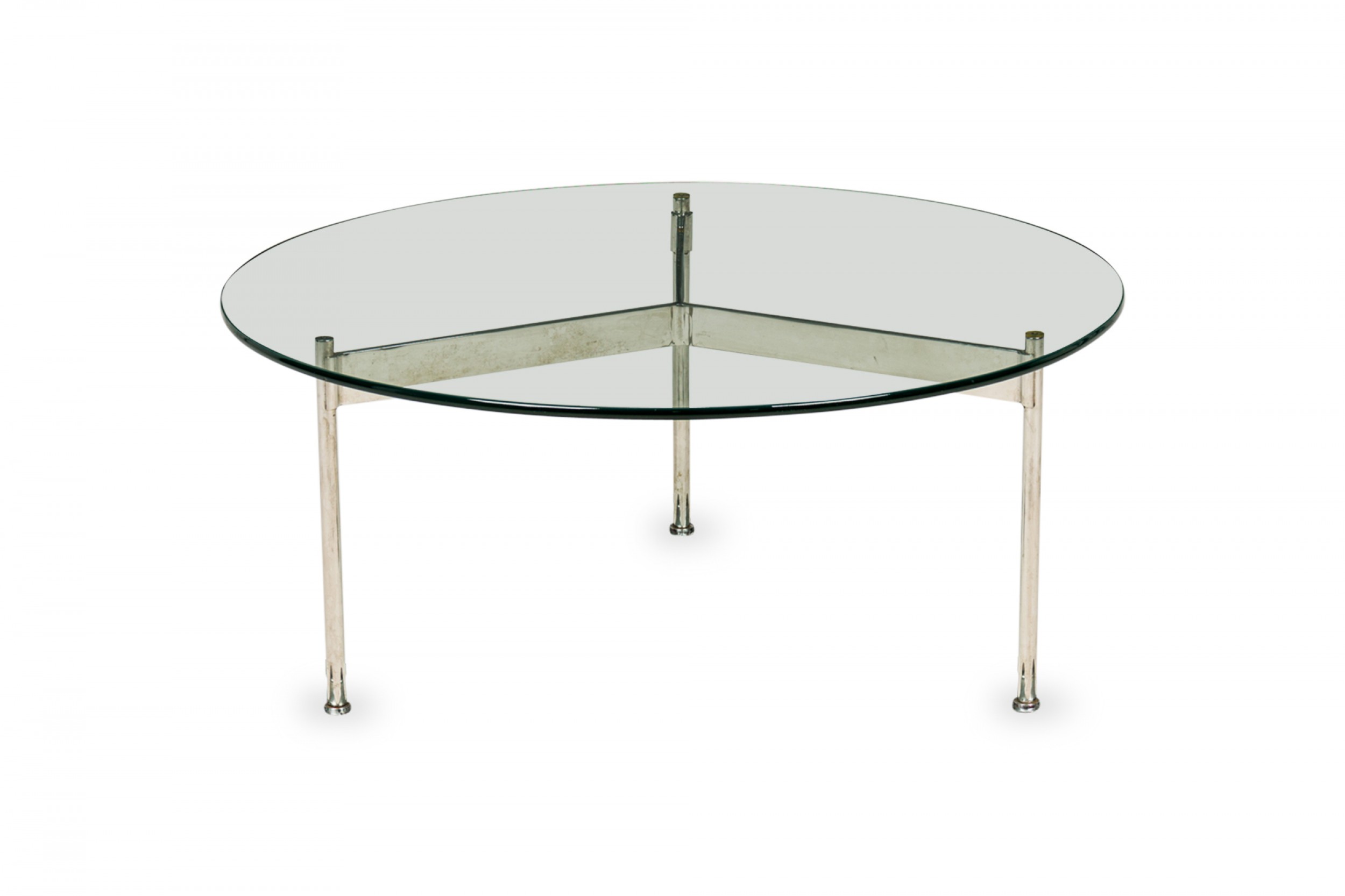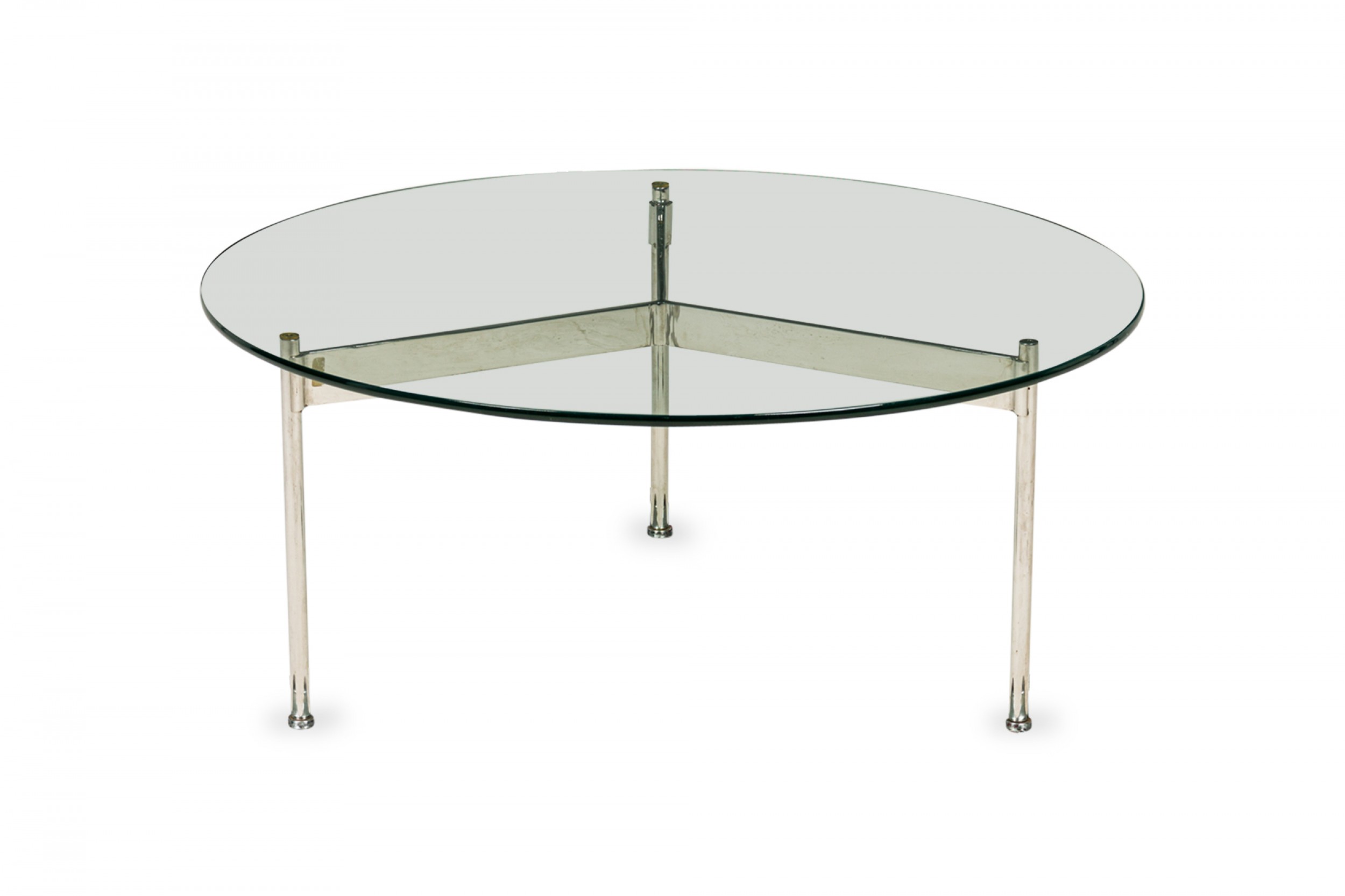 American Mid-Century round coffee / cocktail table with a circular clear glass top resting on a three bar chrome plated steel base. (WARD BENNETT).