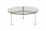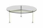 American Mid-Century round coffee / cocktail table with a circular clear glass top resting on a three bar chrome plated steel base. (WARD BENNETT)