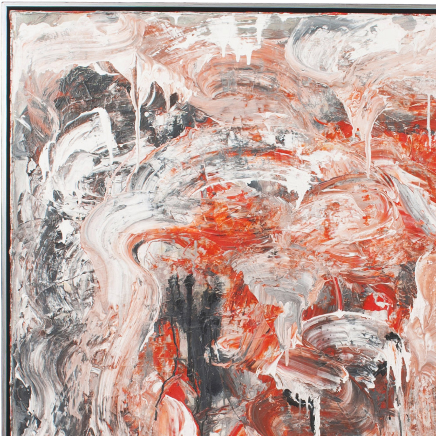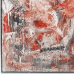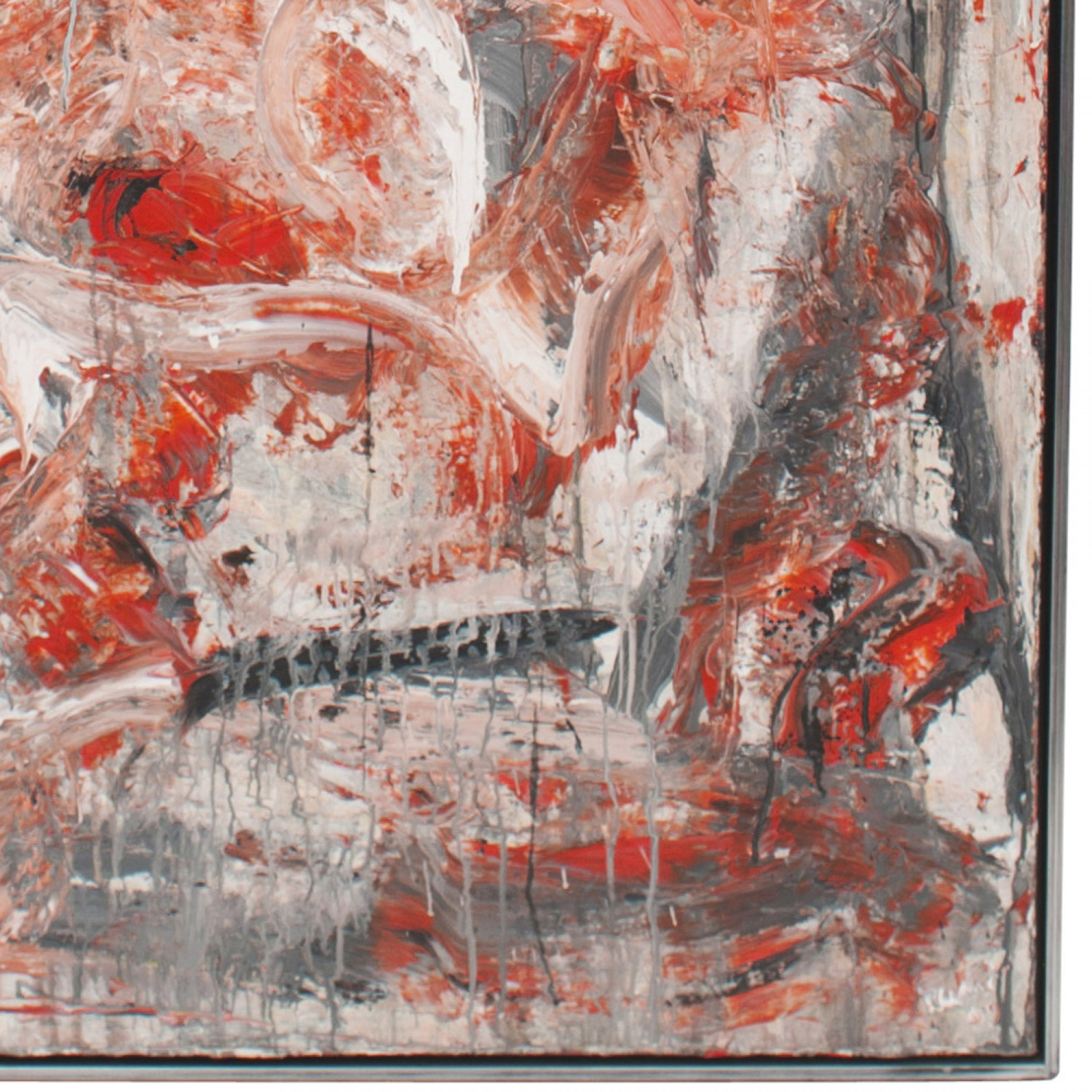 Contemporary acrylic painting on canvas with red orange, black, and beige colors in a black frame; titled: "WHACKO" by Ricardo Rumi, 2009