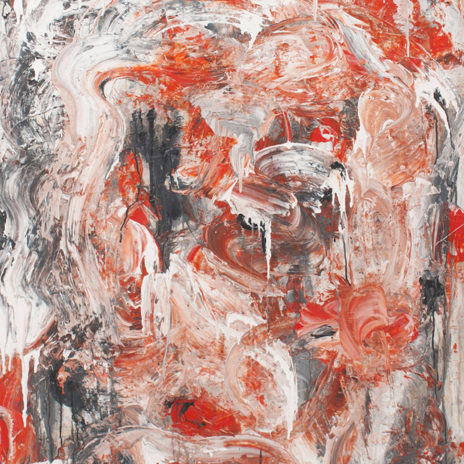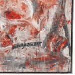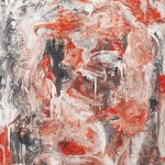 Contemporary acrylic painting on canvas with red orange, black, and beige colors in a black frame; titled: "WHACKO" by Ricardo Rumi, 2009.