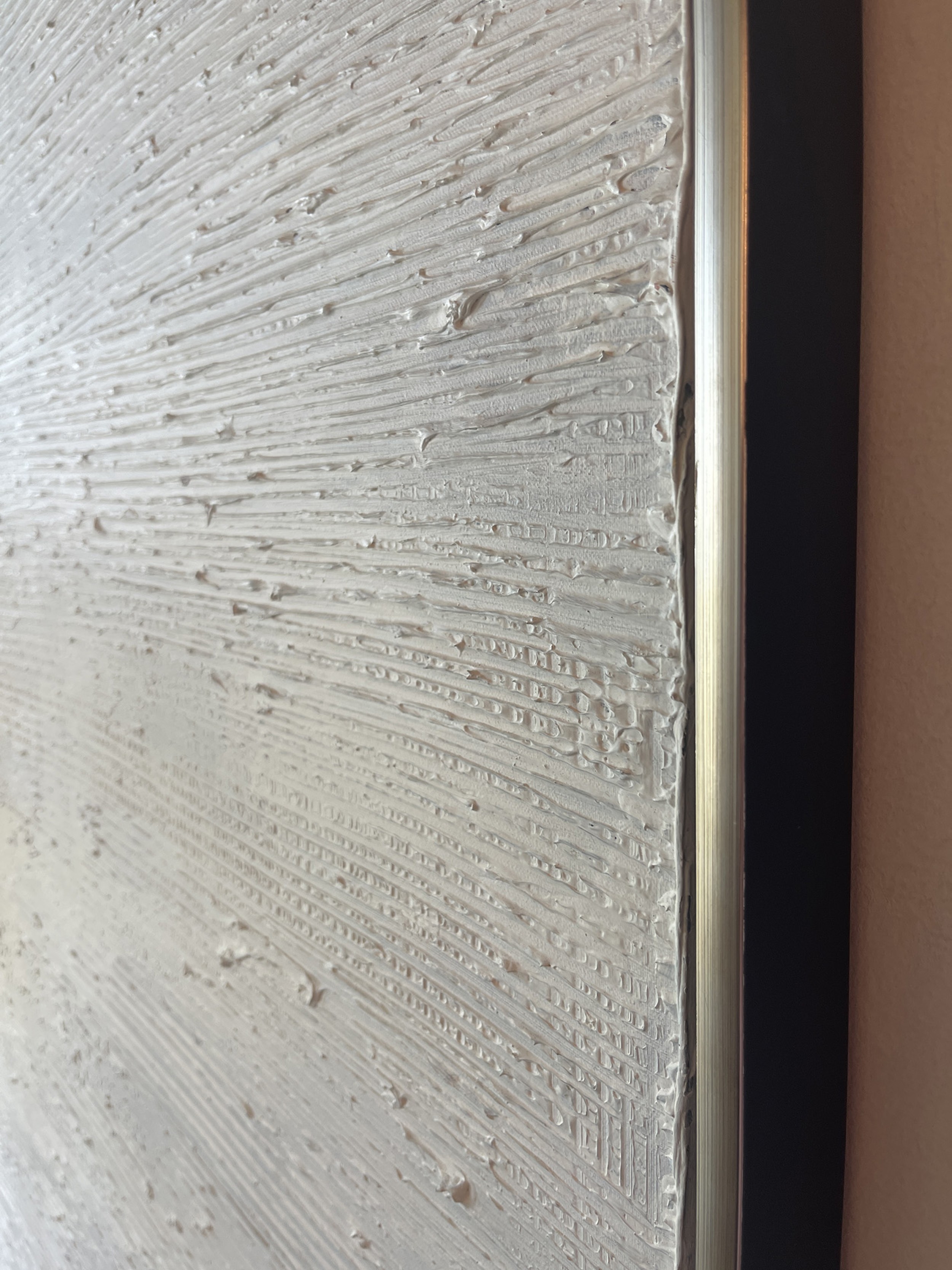 Contemporary oil on canvas painting depicting a ridge textured abstract composition in white with a grey underpainting in a silver leaf frame (RICARDO RUMI).
