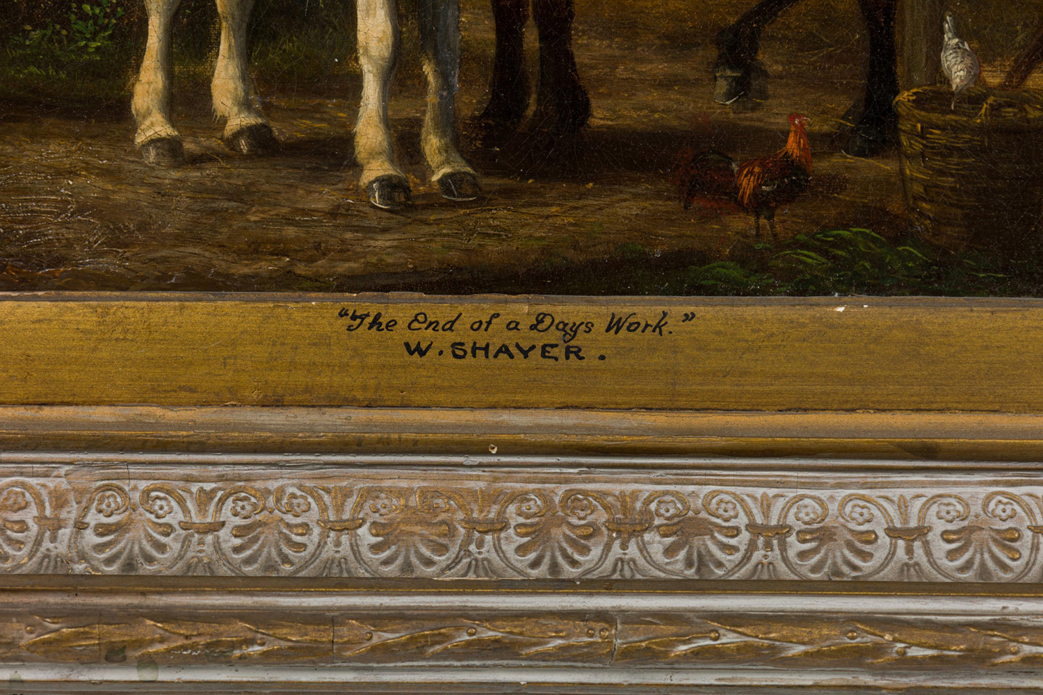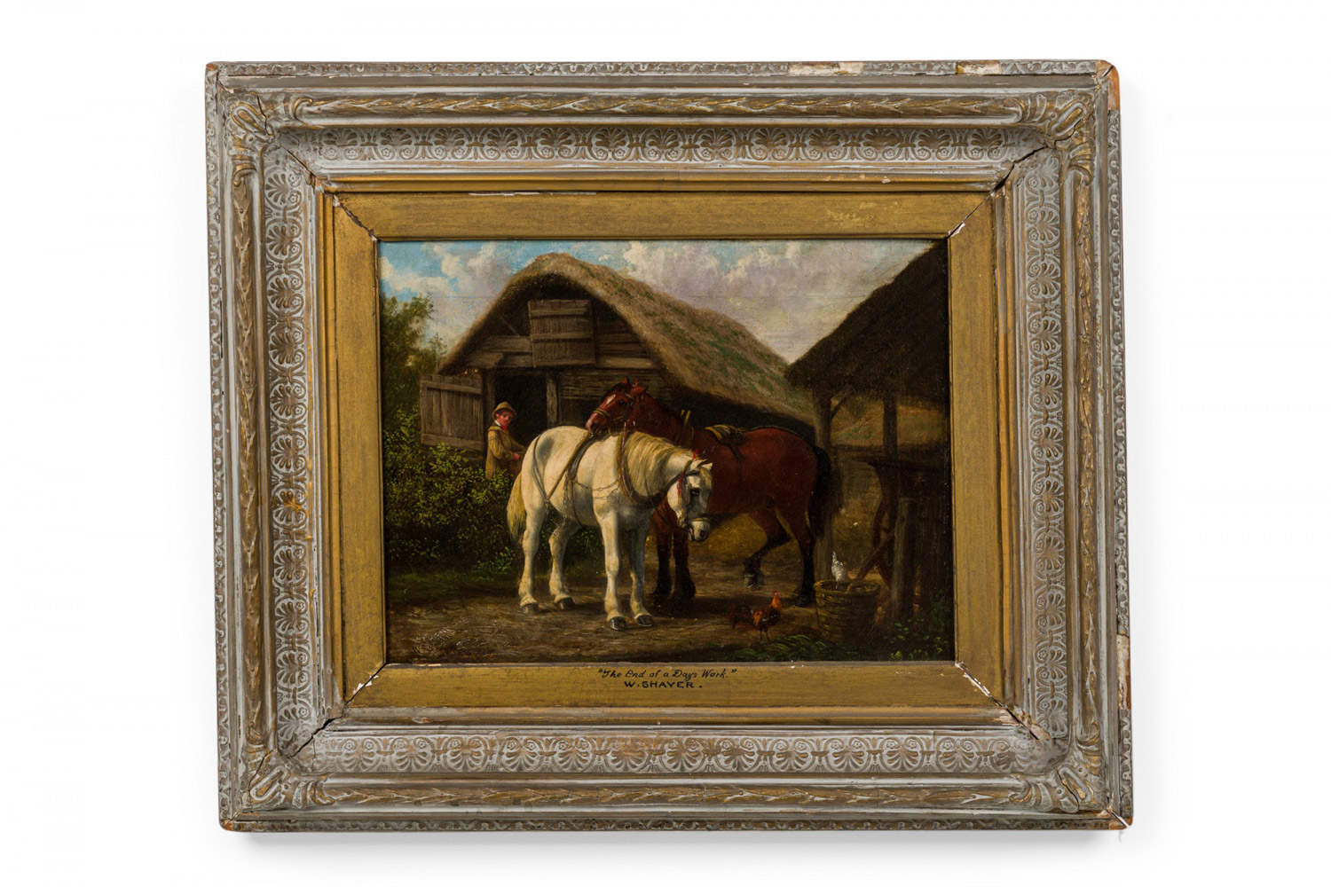 English Victorian (19th Cent) oil painting of a stable scene featuring a brown and a white horses by WILLIAM SHAYER (1787-1879), signed, in a carved frame.