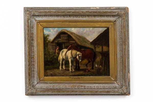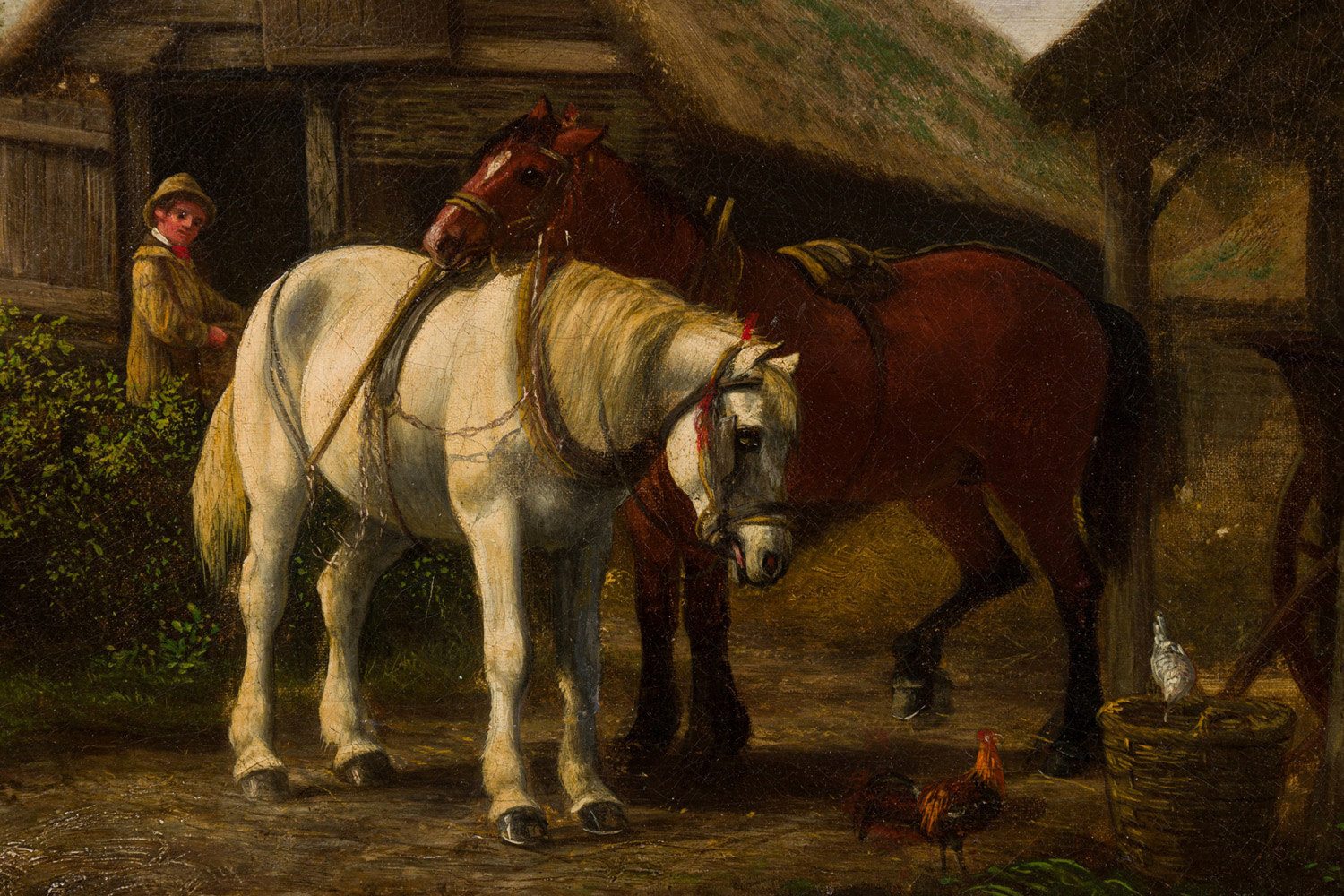 English Victorian (19th Cent) oil painting of a stable scene featuring a brown and a white horses by WILLIAM SHAYER (1787-1879), signed, in a carved frame..