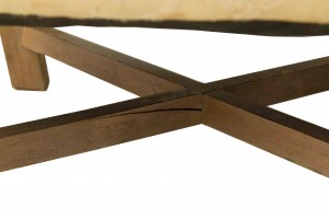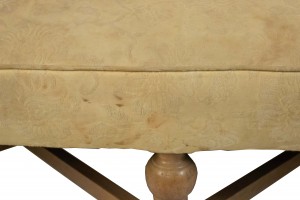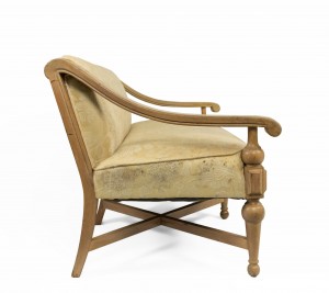 Style: Mid-Century Materials & Techniques: Fabric, maple, sycamore, wood Category: Seating Condition: There are heavy seat stains to the upholstery and split in the stretcher under the seat.