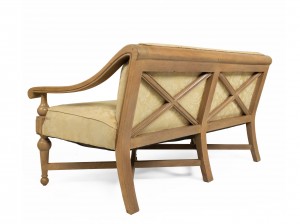 American 1960's sycamore loveseat having a seat & back upholstered in a light yellow floral pattern with an X-stretcher base & back (Related item: matching 3 armchair 062284)