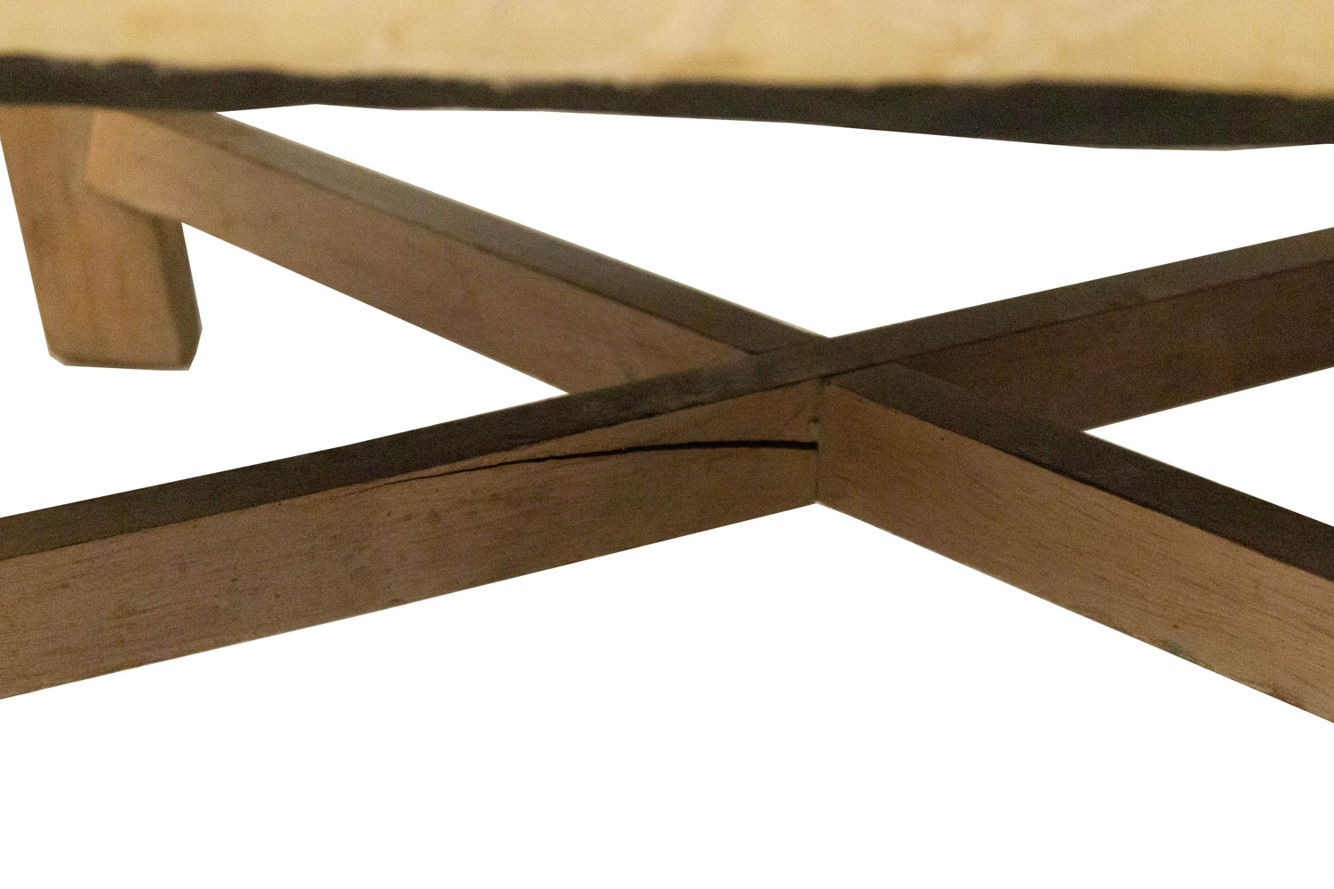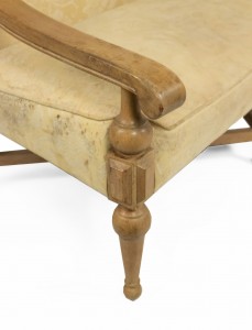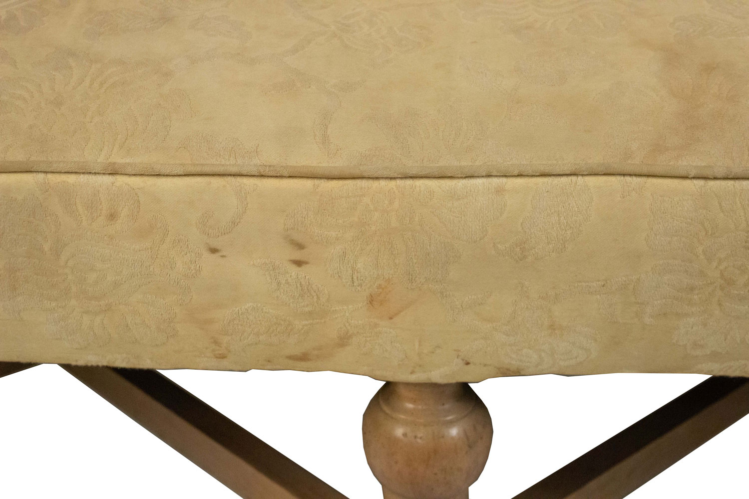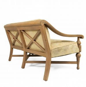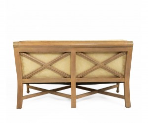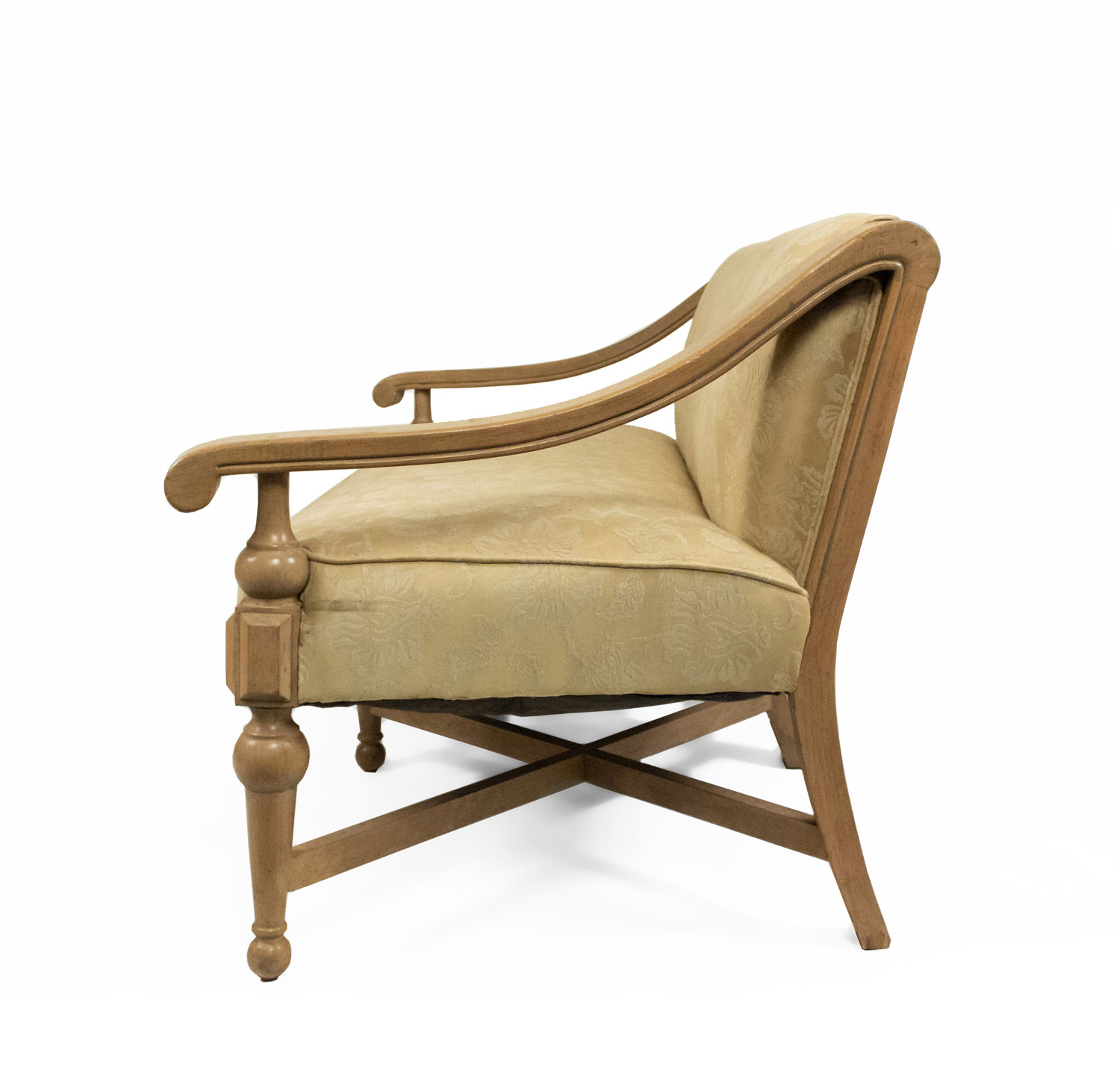 American 1960's sycamore loveseat having a seat & back upholstered in a light yellow floral pattern with an X-stretcher base & back (Related item: matching 3 armchair 062284).
